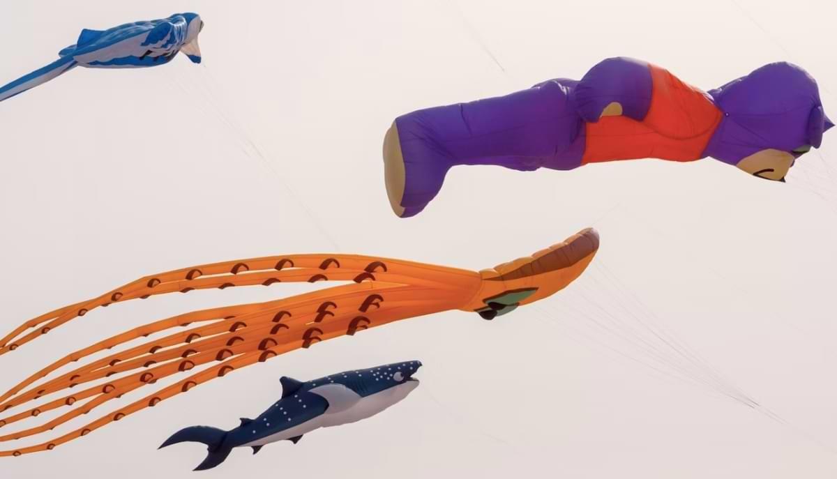 - Giant kites (19–30 feet) decorated with twinkling holiday lights.