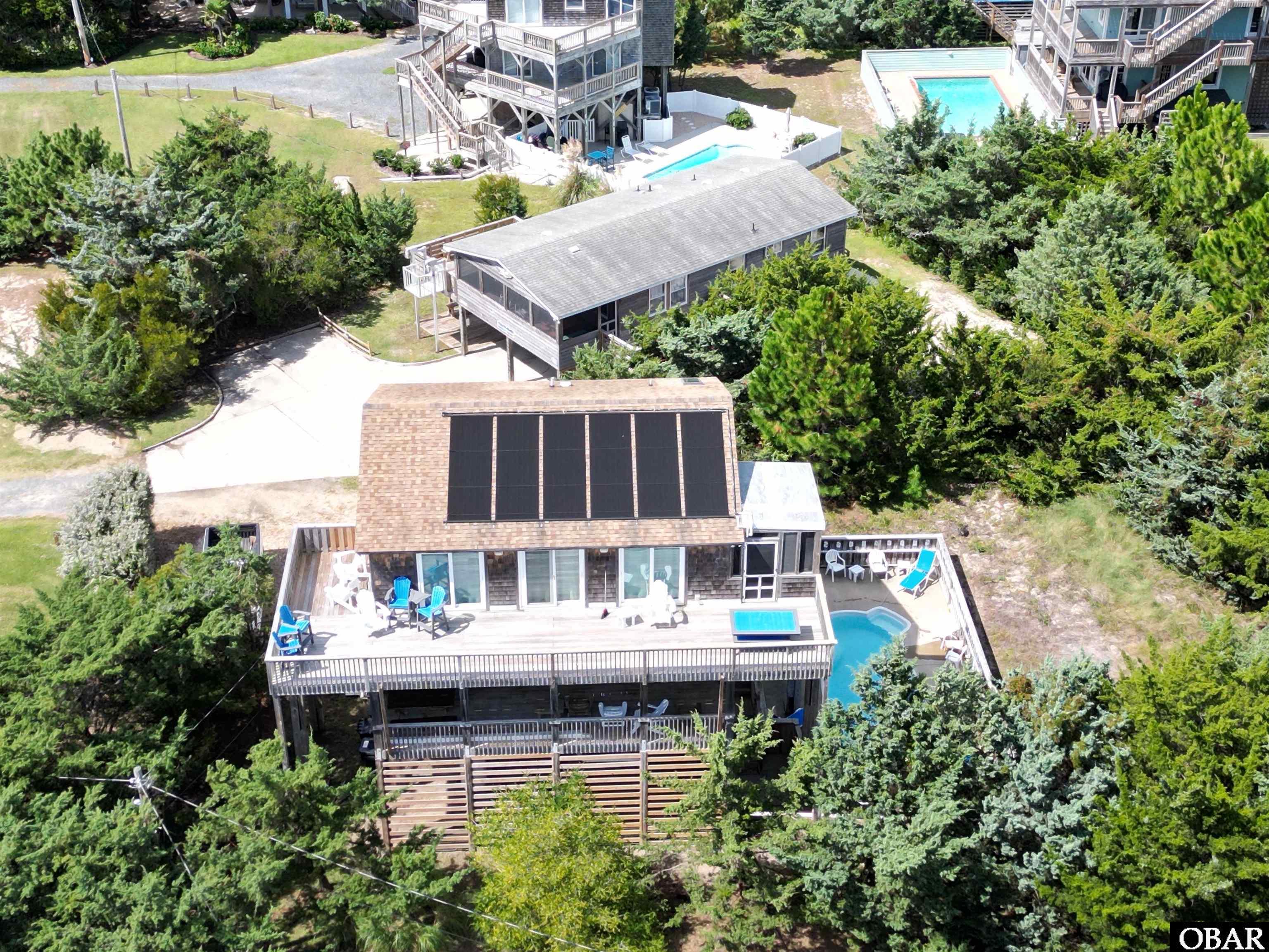 A breezy stroll is all it takes to get your toes in the sand from the this oceanside 4 bedroom house plus a bonus sleeping quarter and 3 baths. On ground level, there's a huge lockable storage shed perfect for stashing your sandy treasures. The kiddos will have a blast splashing around in the private pool, while the grown-ups can soak their worries away in the steamy hot tub. Rinse off the sand with ease using the outdoor shower and foot wash. When it's time for some shut-eye, pick from five oh-so-cozy bedrooms. Four are on the mid-level (queen, queen, double, 2 sets of bunks) sharing two full baths, with a covered deck just a step away. The fifth bedroom is on the top level (queen bed) with a semi-private full bath. The great room is ready to entertain with a colossal flat-screen TV and surround sound. Two dining tables sit right by the spacious kitchen, where whipping up meals is a piece of cake, and you can wash dishes with a view of the sunset. Kick back with a bestseller on the screened porch or enjoy alfresco dining at the picnic table on the deck. Sliders open up from the great room to the ocean-view deck, perfect for casual chats with that sea breeze in your hair or for sunset selfies and starry-night stargazing. Make THE SLEEPY DOG your vacation buddy this year and buy it today!