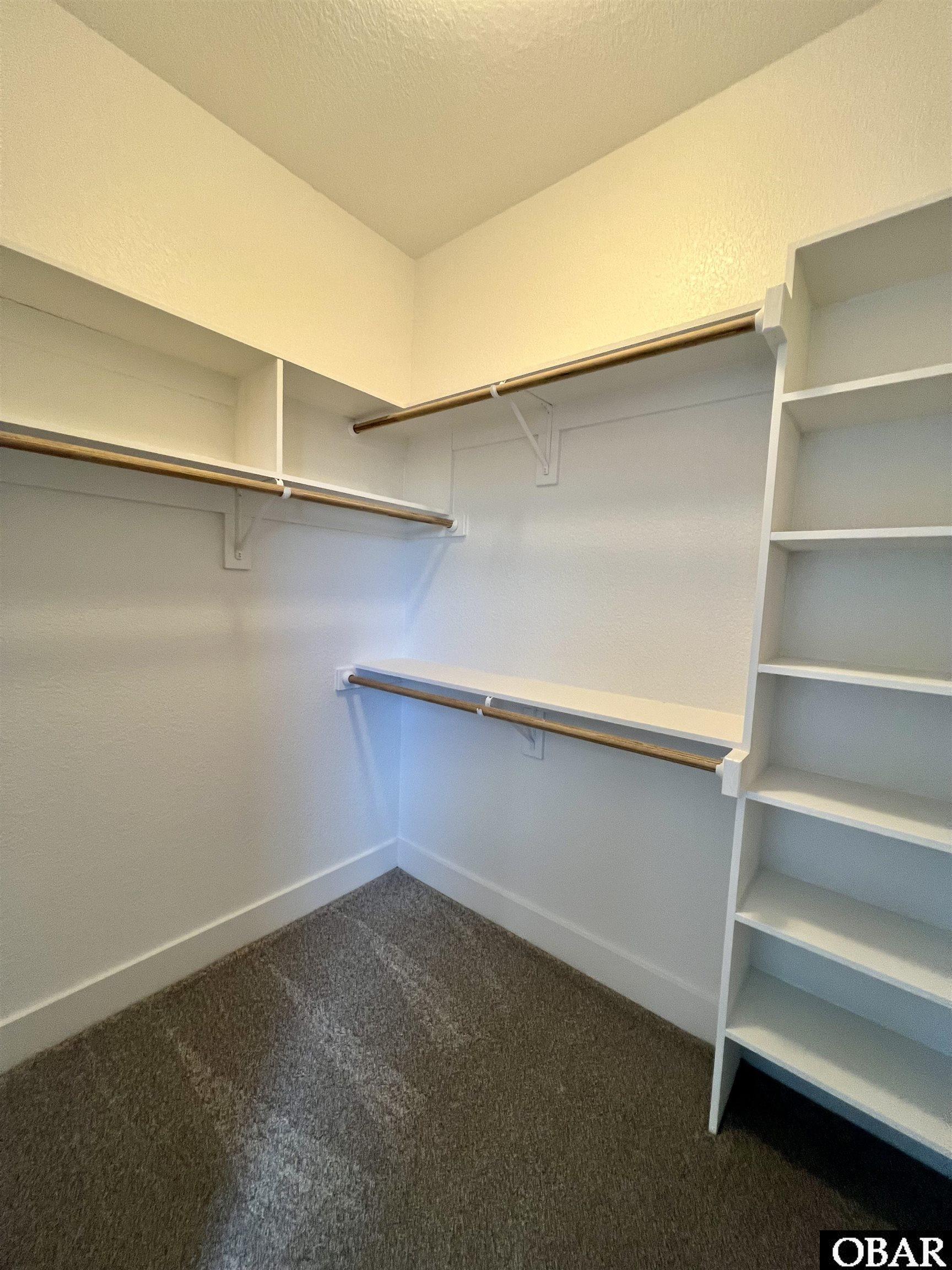 Just off the kitchen is a private primary suite placed opposite of the other bedrooms for added privacy. Here, you'll find a trey ceiling accent, walk-in closet w/wood shelving that features multiple rods. A spacious bathroom offering dual vanities w/ drawer storage and a Large tall cabinet providing room for all your bathroom essentials. The custom-tile shower with rain head, glass door offers seamless transition and exquisite details.