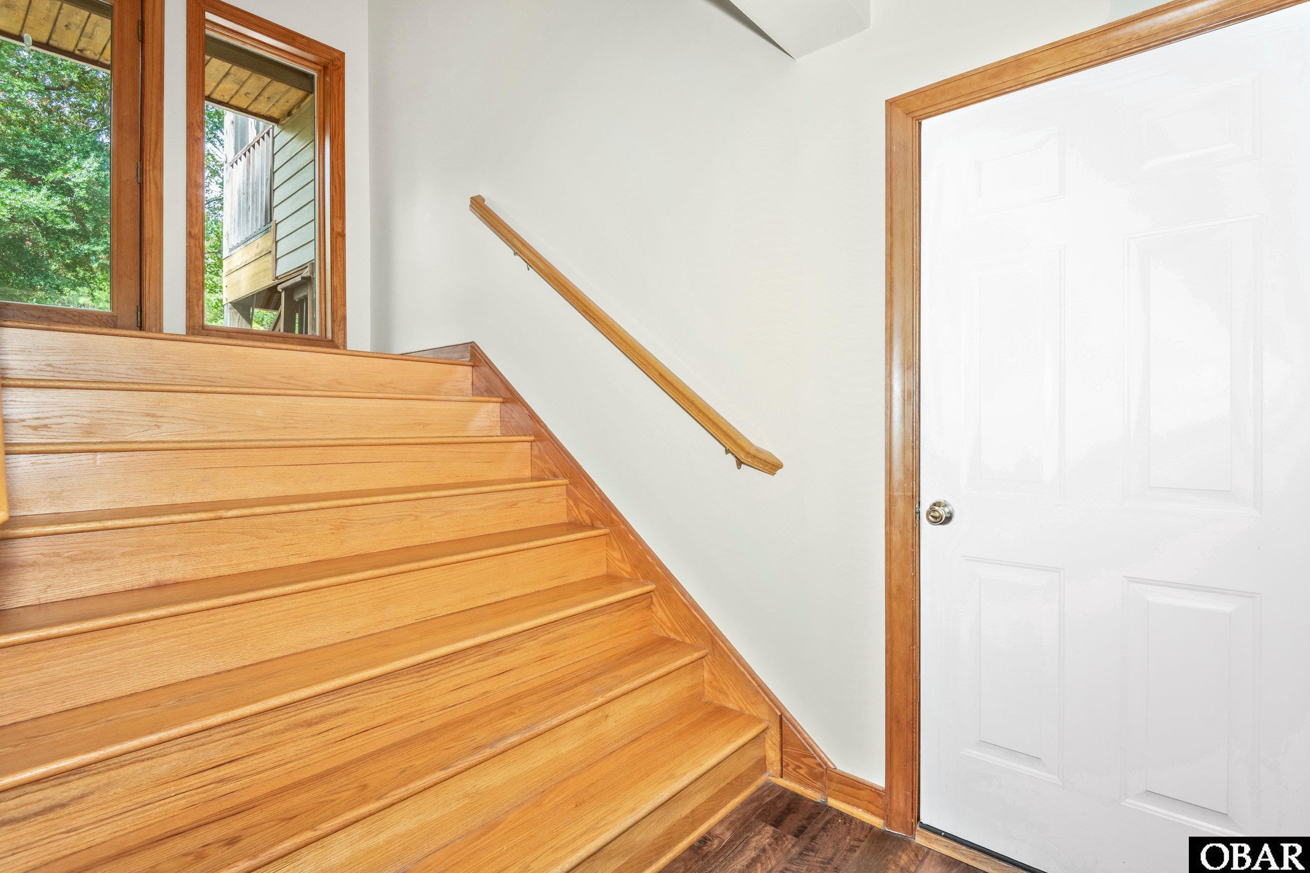 Enjoy peace and quiet in this custom home in the Cliffs of Colington sitting on 1.16 acres of maritime forest. Upon entering the foyer with 18' ceilings, you enter a light and airy great room with solid red oak hardwood flooring and gas fireplace connecting to the kitchen with a breakfast bar and a 16' x 24' sunroom with tounge and groove wood ceiling and plenty of windows to let in nature. Off the sunroom you will find a large sundeck. Down the hall features the primary suite with tray ceilings and a walk-in closet and a second bedroom with a private screened in porch as well as another full bathroom. The ground level features another bedroom with a walk-in closet and full bathroom leading to a finished space with custom 9' high wooden shelving perfect for a game room, home office or studio. Also included on the ground level is a 2 car garage with plenty of storage with double doors leading to a workshop or area for additonal storage also featuring 9' high wooden shelving. Take a quick stroll to the community sound access to enjoy sunsets or hop in the car to get to the beach in under 10 minutes.