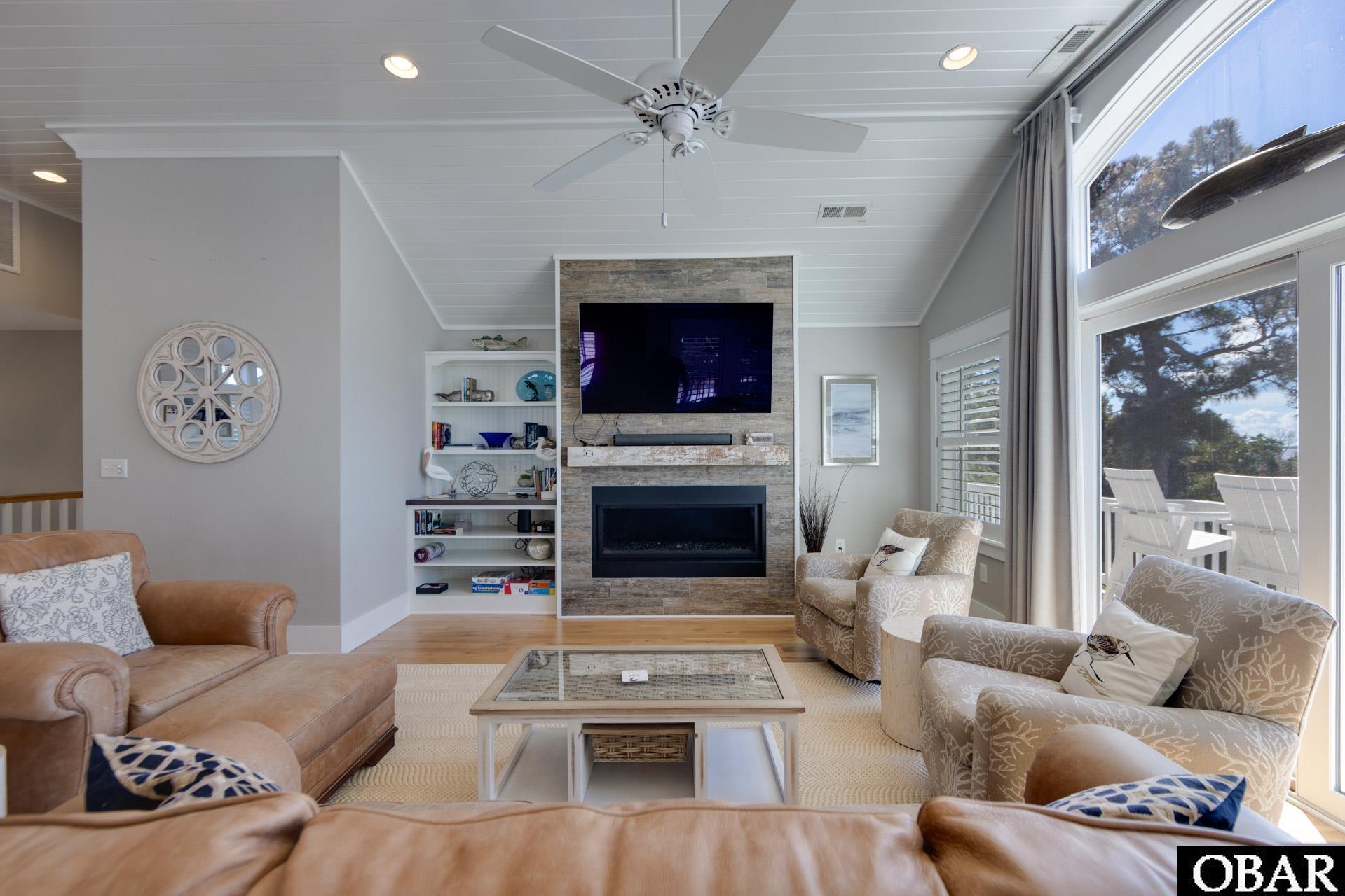 Step inside and you’ll immediately be captivated by the breathtaking panoramic views of the Currituck Sound. The top level showcases gleaming hardwood floors and a chef’s kitchen with granite and Corian countertops, gas range with custom vent hood, a spacious center island with seating and secondary sink, and abundant storage. The kitchen opens seamlessly to the dining and living area with cathedral shiplap ceilings, a cozy gas fireplace, and walls of windows framing endless water views. Just off the main living space, you’ll find a screened porch and sun deck, ideal spots for morning coffee or unforgettable sunsets.