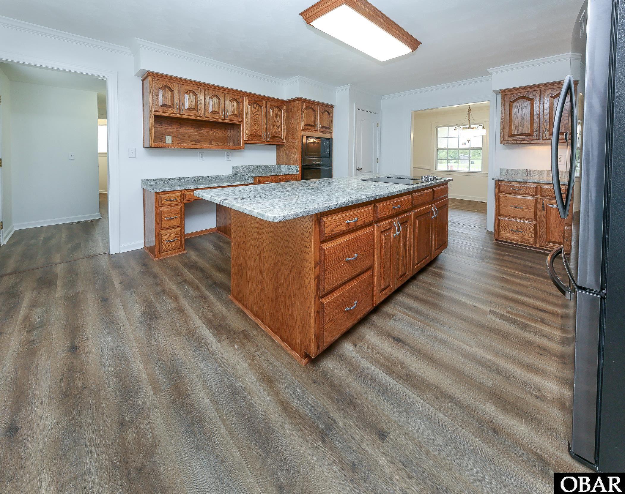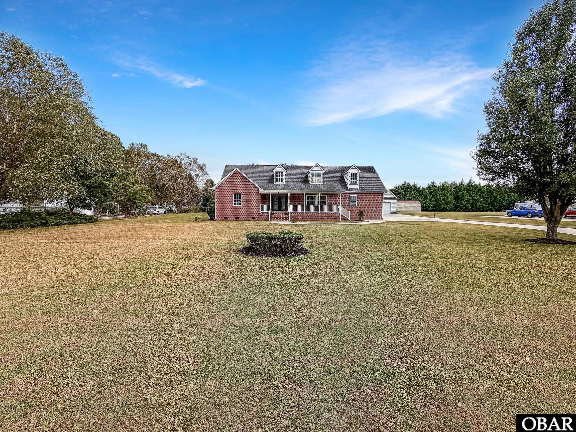 At the heart of this home lies a generously sized kitchen that is sure to impress any culinary enthusiast. Featuring a central island with a brand-new cooktop, stunning granite countertops, and custom cabinetry, this kitchen is both functional and stylish. The eat-in area, complete with built-in bookshelves, offers a cozy spot for casual meals, while the formal dining area is perfect for hosting dinner parties and family gatherings. The main level showcases luxurious LVP flooring throughout, offering both durability and elegance, while the upper level boasts brand-new carpeting for added comfort. The thoughtfully designed floor plan centers around a main-level primary suite, providing a serene retreat. Upstairs, you’ll find two additional suites, making this home perfect for guests or multigenerational living. For added versatility, the property features a generous Finished Room Over the Garage (FROG), which can easily be transformed into a home theater, gym, office, or playroom—tailoring it to your lifestyle needs. Storage and workspace are abundant with a detached garage that offers 1,300 square feet on the main level, ideal for hobbies, storage, or a workshop. Above this, a 533 square foot studio awaits, complete with a full bath and kitchenette—perfect for guests, potential rental income, or a private office space.The property is designed with your outdoor dreams in mind, as the septic system is conveniently located in the front yard, allowing for a spacious backyard that can accommodate your envisioned in-ground pool, perfect for summer gatherings and relaxation. With nearly 3,000 square feet of living space in the main home, there is ample room for everyone to enjoy. This residence is strategically situated just two miles from the Virginia border, providing easy access to local shops, restaurants, and vibrant farm markets. Additionally, the stunning Outer Banks are only about a 55-minute drive away, making weekend getaways a breeze.