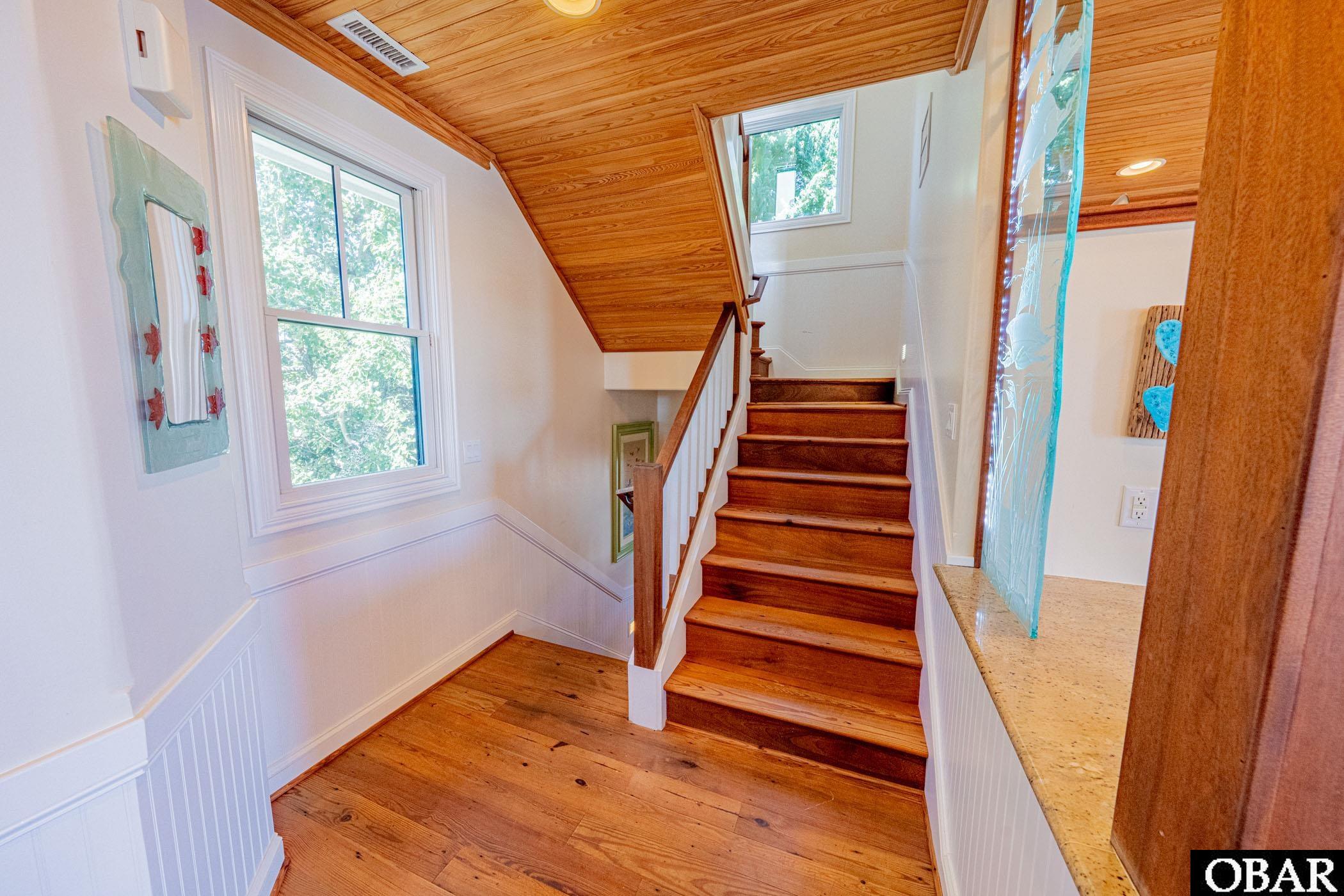 The first level offers a spacious King ensuite with a private bath and a cozy den with kitchenette that flows onto the screened porch and out to the pool deck. The mid-level is the heart of the home, where everyone gathers to take in the views and enjoy time together. Upstairs, you’ll find two more King ensuites, each with private baths and shared deck access with amazing Silver Lake views. A convenient wet bar leads to a covered porch and a spiral staircase that brings you to the rooftop lookout—an unforgettable spot offering 360° views of Silver Lake, the sound, and the iconic Ocracoke Lighthouse. It’s the kind of place where mornings start with coffee and seabirds, and evenings end with glowing sunsets over the water.