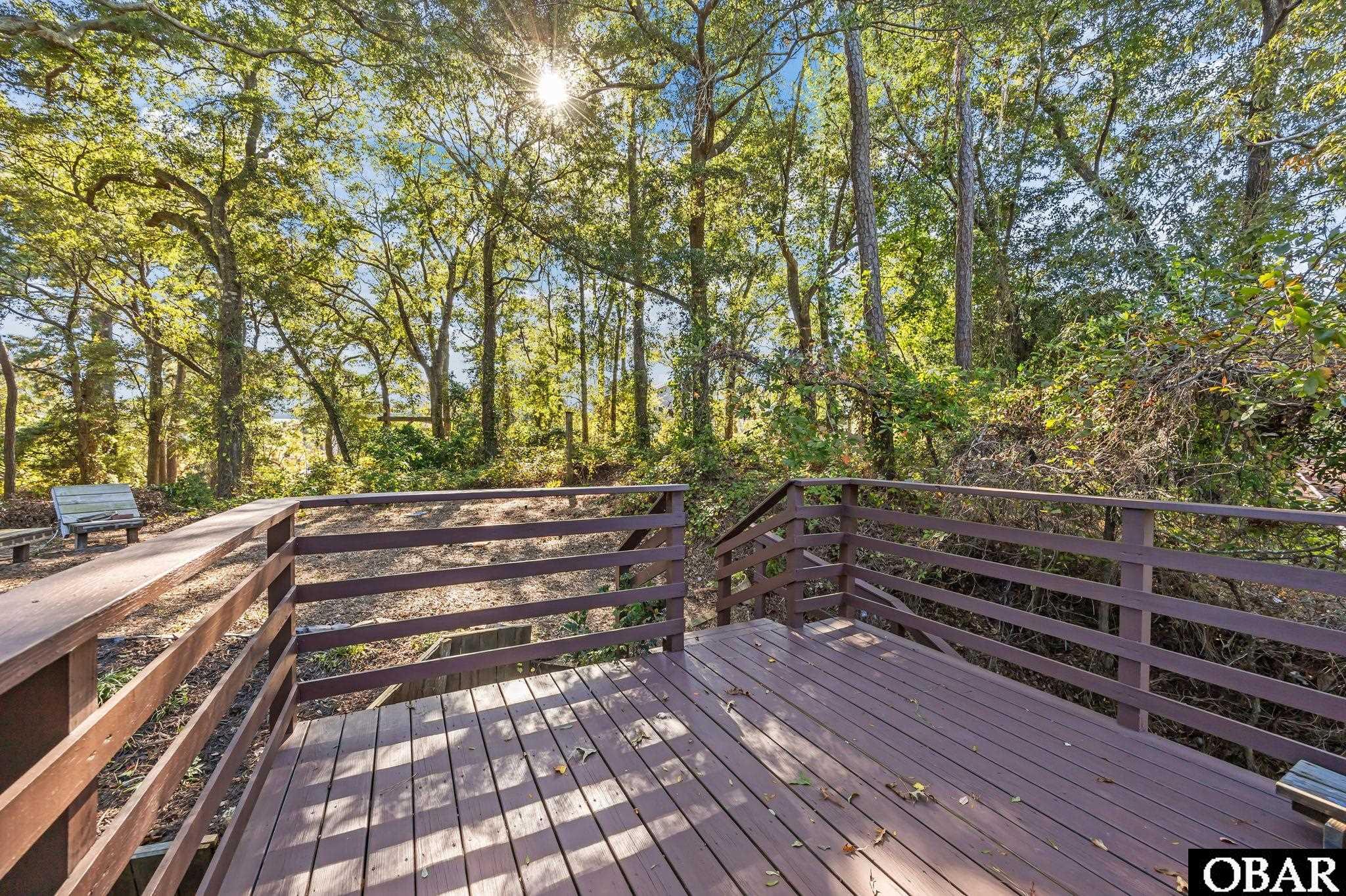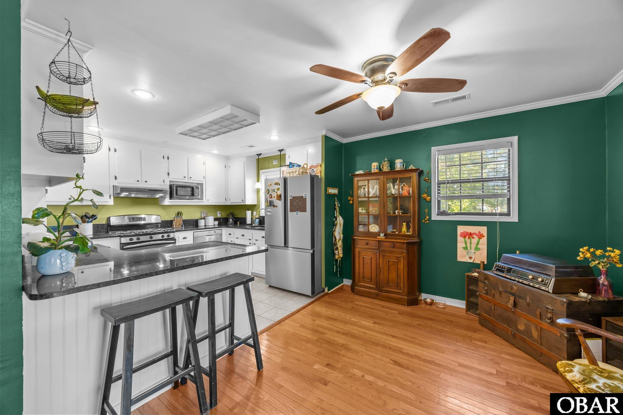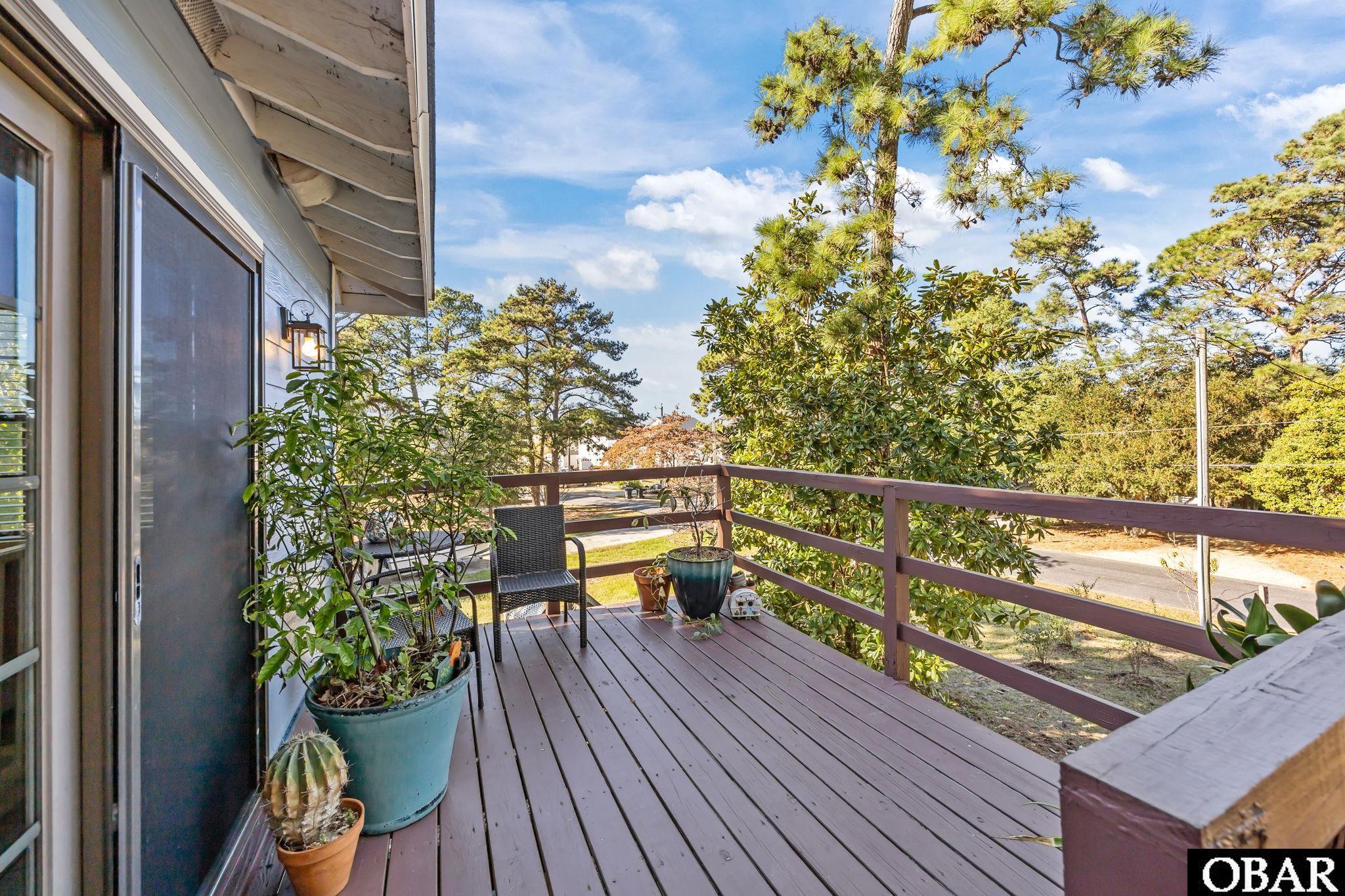 Perfectly perched in the heart of Colington Harbour, this charming beach box is nestled among the graceful live oaks, with high elevation and some blueberry & rosemary bushes too! You will enjoy the privacy of the backyard which feels like a treetop oasis. Inside, the real hardwood floors welcome you in. The kitchen is adorned with sleek black granite countertops, stainless steel appliances, and a convenient breakfast bar that opens to the dining and living areas, creating a comfortable, open layout. The light filled sunporch adds additional living space and features a spiral stair leading to the 1st floor. Two bedrooms and a full hall bath are positioned at the back of the home, and lead out to the rear yard. A brand-new roof adds peace of mind, while the front and rear decks provide the perfect spots to soak up sunshine throughout the day.