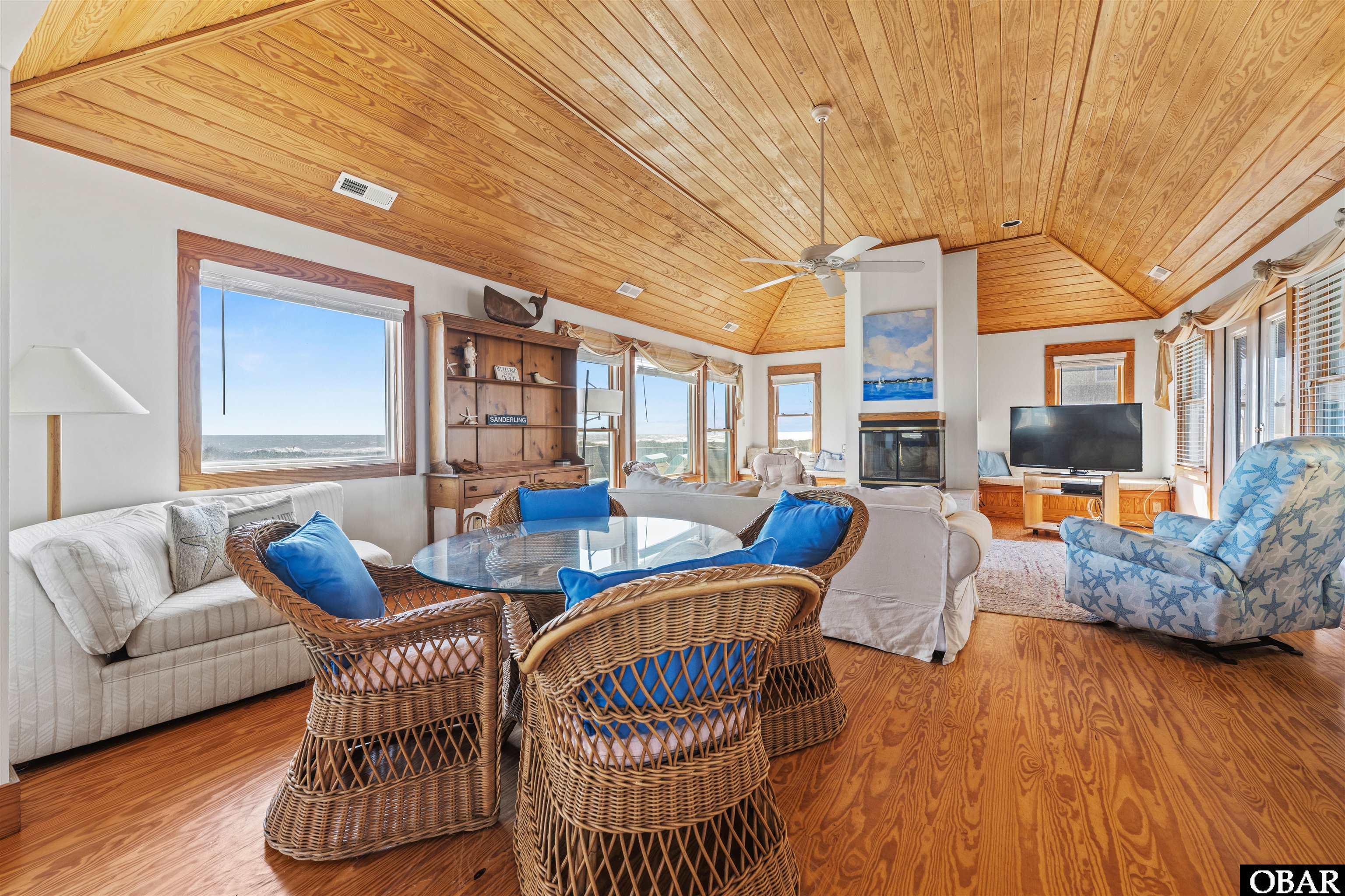 The top floor welcomes you into a bright, open-concept living space that defines coastal living. The kitchen opens seamlessly to the dining and living areas, where vaulted ceilings, hardwood floors, and walls of windows fill the home with natural light. A wood burning fireplace anchors the space, while multiple decks on both sides offer stunning ocean sunrise views to the east and sound sunsets to the west. The kitchen provides abundant cabinetry, generous counter space, and bar seating—ideal for gatherings and entertaining.