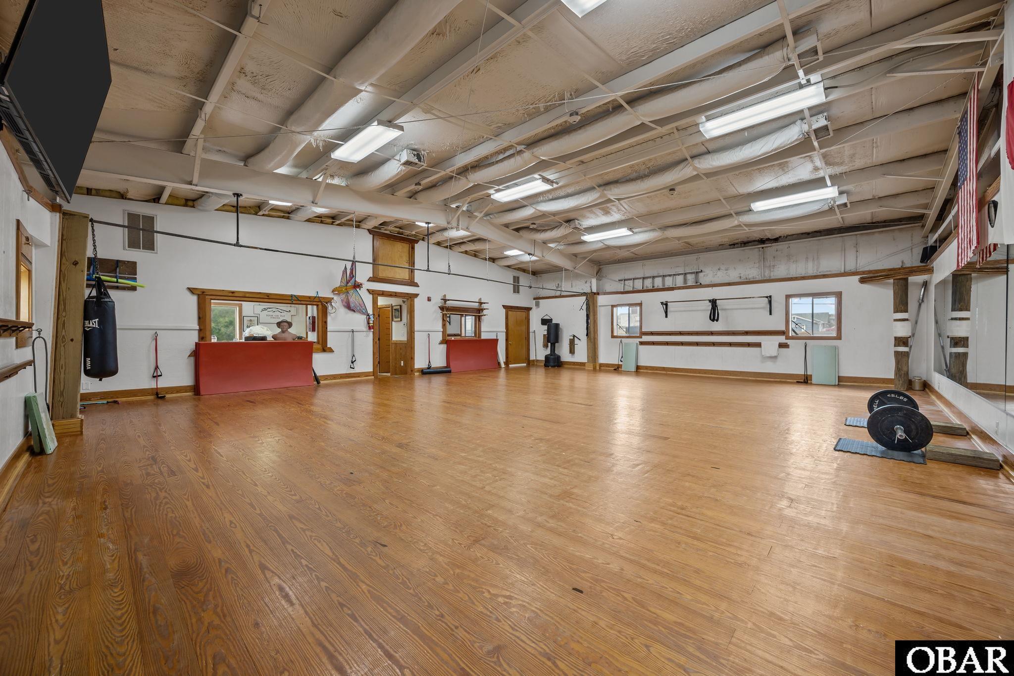Fantastic commercial opportunity on the northern end of Lindbergh.Zoned Beach Commercial (BC-2), offering flexibility for a wide range of business and commercial uses. Located in the sought-after X Flood Zone. Approximately 3,200 sq. ft. total, currently used as a karate school but easily adaptable for many uses. The main level (approx. 2,000 sq. ft.) features a large open wood-floored area (40x35 = 1,400 sq. ft.) with a high metal-beam cathedral ceiling, a 15x40 (600 sq. ft.) office with ceramic tile floors, and two half baths with changing areas and ceramic tile floors. There is also a closet with a wet sink, and one half bath includes a stack washer and dryer (does not convey). The men’s restroom has a two-way mirror to the workout area. The upper level (approx. 1,100 sq. ft.), added in 2000 and permitted for office/storage use, includes a full bath with stand-up shower, kitchen counter with sink and refrigerator, and a rear stairway leading to a fully fenced backyard. Two-zone heat pumps—upper replaced May 2024, lower replaced November 2022. Slight ocean view from upper level. The roof is a combination of 30-year asphalt shingles and metal. The main floor consists of 1x6 T&G pine over 2x4 sleepers on concrete and can easily be removed for a concrete floor. The lot measures 75x150 (10,500 sq. ft.) and provides ample parking with 10 paved spaces and 4 gravel spaces in front, plus an additional concrete pad at the rear accessed via Ride Lane. Property sits on higher elevation than surrounding lots. Excellent location with a quick walk to the Byrd Street beach access. Convenient to northern beaches without northern beach prices. High visibility and easy access for traffic coming from KDH, Nags Head, and Currituck. Walk to nearby restaurants and shops. See Associated Documents for septic permits and BC-2 zoning description. Property sold “as is.” EZ to show—appointment required, combo lockbox.