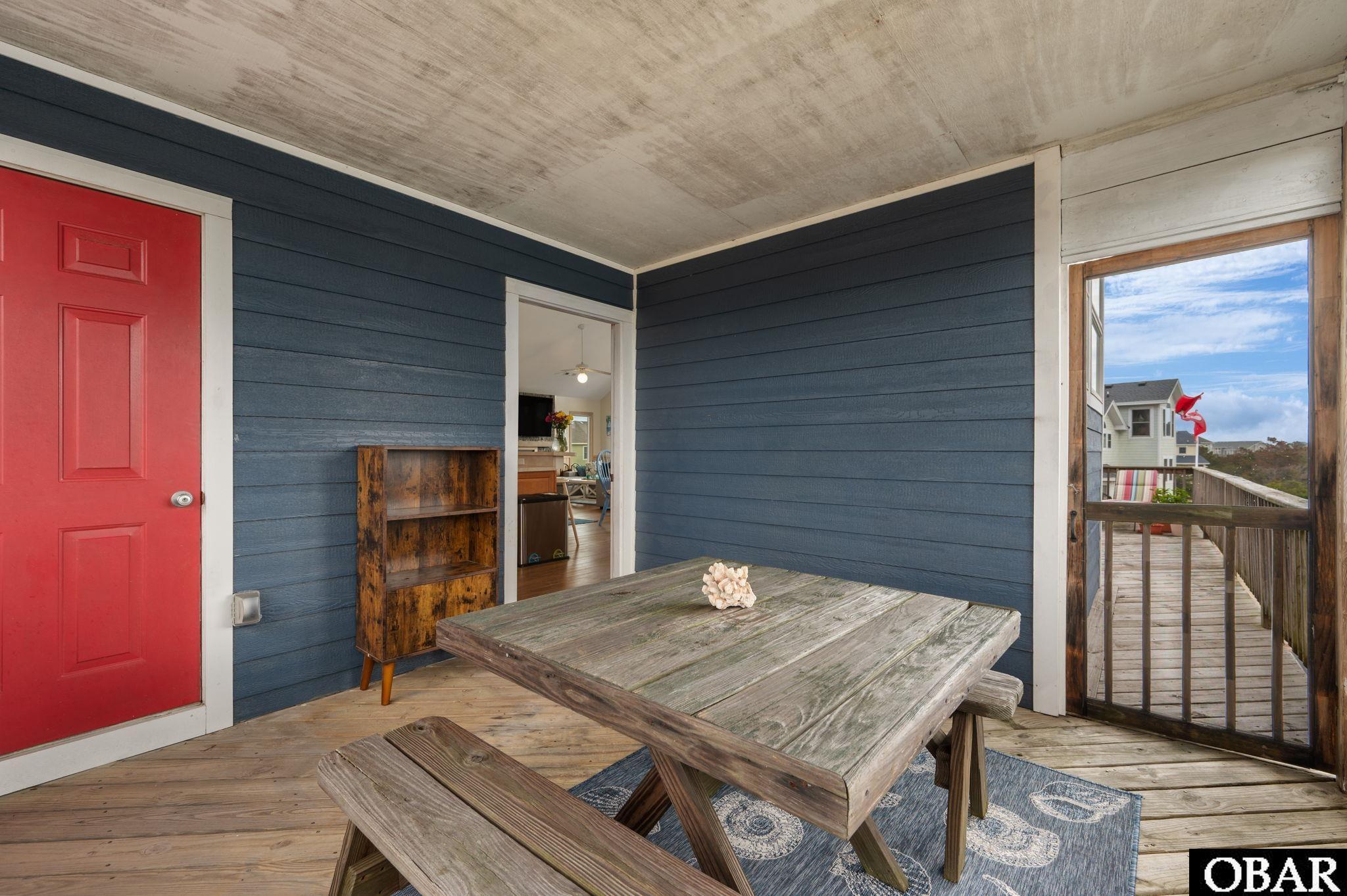 This 5-bedroom (three with ensuites), 4 full-bath home, located oceanside in the sought-after Corolla community of Villages at Ocean Hill, gleams like a freshly polished gem! As the owners' primary home, she has been lovingly cared for and retrofitted with some premium upgrades over the last few years - LP Smart siding, Vinyl Plank flooring throughout, new kitchen appliances, additional parking area, plus a backyard retreat including a large patio, pet-friendly fencing, a grass lawn and irrigation system with a separate water meter. The reverse floor plan lends remarkable views of the much-loved Currituck Light and even glimpses of the Atlantic Ocean from the top sundeck. The foyer of the ground level dry entry opens into a nice-sized rec room with TV, seating and a foosball table. Newly carpeted stairs lead to the mid-level where you'll find four bedrooms - two with ensuites, and all tastefully decorated with a distinctive coastal flair - laundry, a full hall bath, and access to front and side covered decking complete with a hot tub. Moving up to the top floor, cathedral ceilings and large windows complement the airiness of the open concept living area. A wood-burning fireplace with faux stone surround and tile hearth anchors the inviting space with its comfy furnishings and continuing coastal decor. There's even a ships watch, which the owners are using as a home office, access to a roomy screened porch and large sun deck and a nice-sized primary ensuite. Villages at Ocean Hill offers a slew of desired amenities including two pools - one oceanfront and one soundfront - a health club, a sports complex (tennis, pickleball, basketball and volleyball courts), a playground, several community baths, and an oceanfront boardwalk that accesses wide, pristine beaches. You're also only a few minutes from the quaint Village of Corolla that offers exciting dining experiences, adventurous shopping and lots of educational opportunities.