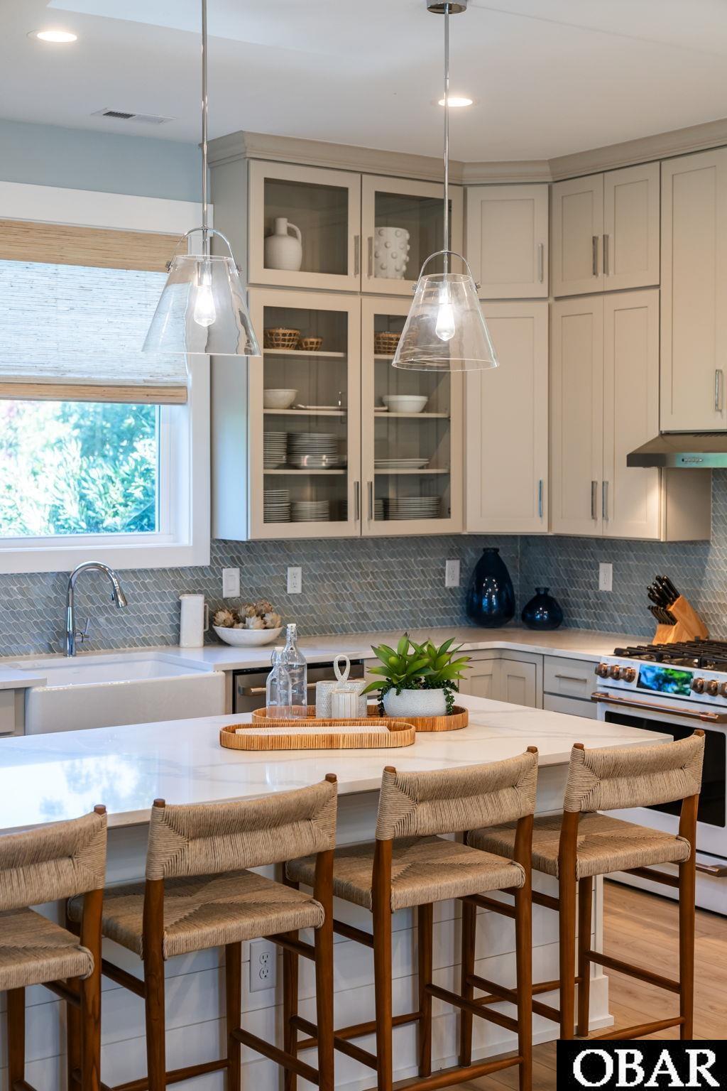The chef-inspired kitchen, complete with a grand island and separate service kitchen, flows effortlessly into the dining room, elegant living area with fireplace, and covered veranda—creating the ideal space for entertaining. Graceful glass transoms, coffered ceilings, and custom trim details elevate the interior design.