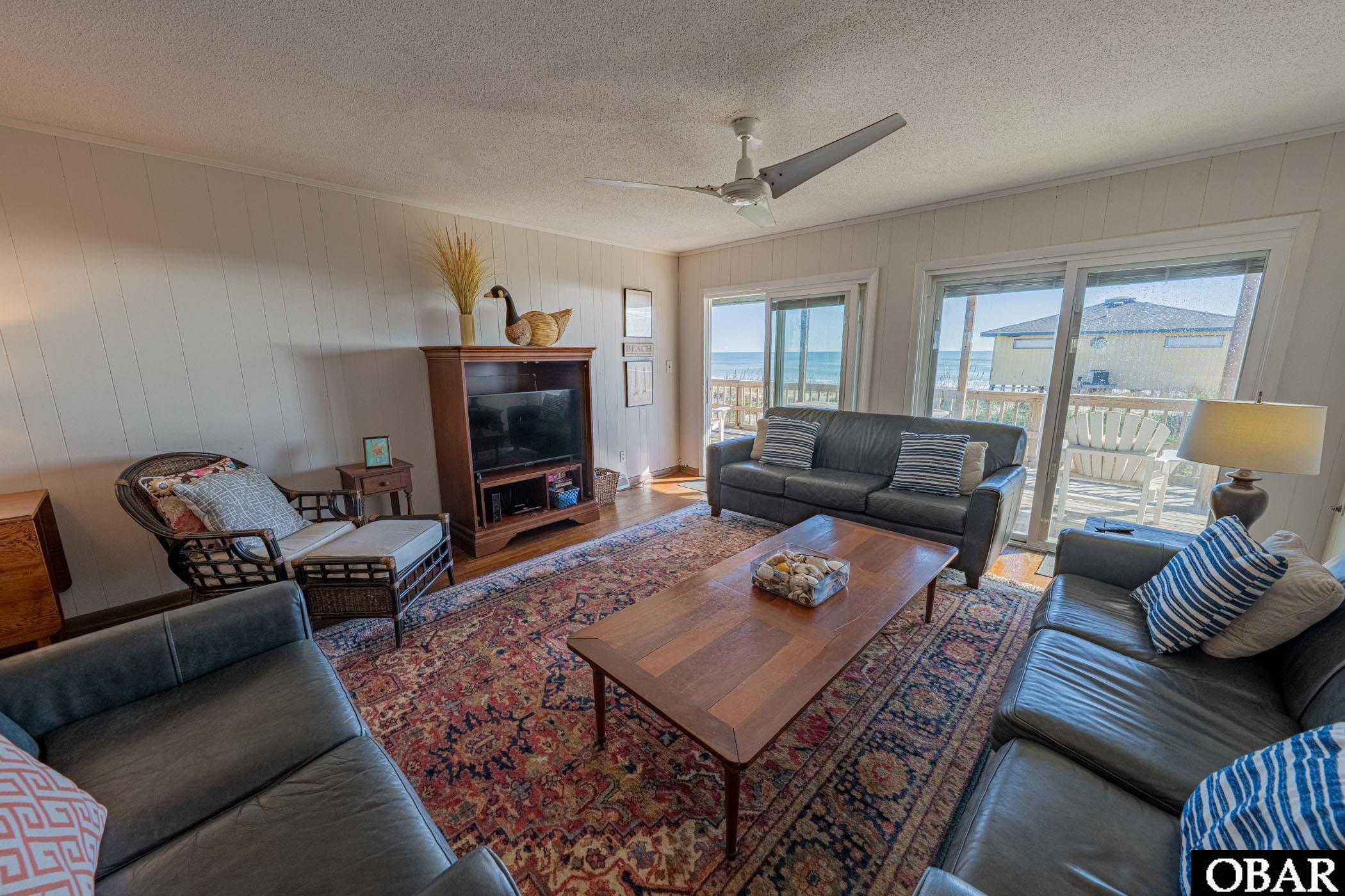 Step into a bright, welcoming living space with an easy flow between the living room, dining area, and kitchen. Large sliders line the ocean side, filling the home with natural light and salty breezes. The spacious ocean-facing deck is where you’ll spend most of your time — sunrise coffee, evening cocktails, or simply soaking in the rhythm of the waves.