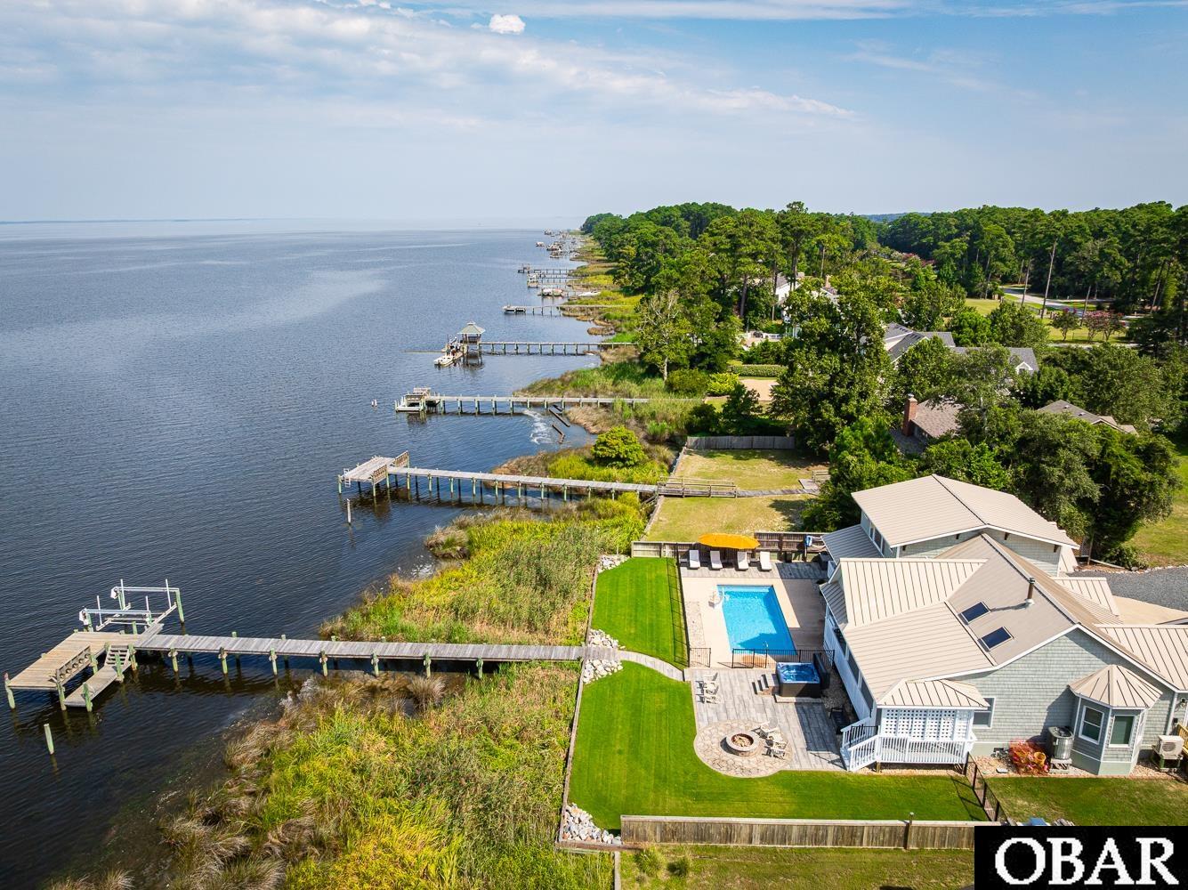 Welcome to 4064 Martin’s Point Road — An exceptional Sound Front home offering refined coastal living on the Currituck Sound in one of the Outer Banks’ most prestigious neighborhoods. This distinguished, meticulously maintained home combines gracious interior spaces, panoramic water views, and a host of upscale amenities, making it an ideal retreat for those seeking tranquility. The grand foyer leads into an open-concept living area, anchored by floor-to-ceiling windows that frame uninterrupted sound views — the water becomes a living backdrop. Living Room and Dining Room have floor to ceiling windows, fantastic Sound views and deck access. A chef-grade kitchen with premium finishes (quartz countertops, high-end appliances, custom cabinetry) serves as the heart of the home, flowing seamlessly to dining and gathering spaces. Amazing Sound Views from the Kitchen, Dining Room, Living Room and 2 ensuite Bedrooms and their Bathrooms. The oversized primary bedroom suite on second level is designed for serenity and privacy with fantastic Sound Views, a luxurious ensuite bath, 2 carefully designed walk-in closets, spacious sitting area and large windows with custom room darkening shades protecting against UV rays. The current bedroom sitting area can be used as a nursery or office. The First level bedroom ensuite and bathroom have beautiful sound views, deck access, bright luxury bathroom with rain shower plus 2 additional shower heads and 2 shower wands. First level also has 2 bedrooms that are well appointed and share a hall bathroom, generous closet space, and flexible layouts for guests or extended family. A Bonus area over the garage has it's own access, many closets, full bathroom with shower and offers versatility such as office/media space/gym/playroom/rec room or ensuite bedroom. Many closets, huge walk in attic over the garage behind the Bonus room, large Laundry/Utility room, Natural Gas used for Oven/Range, Dryer and Tankless Hot Water Heater round out the interior. Thoughtfully designed landscaping adds to the beautiful curb appeal. The home exterior is high quality & low maintenance with Split Vinyl Shakes, Brick Veneer, Composite and PVC Fascia and Trim. There is an abundance of parking - the 2 car attached garage, the pavilion, and an additional parking area for cars or boats. Sound Front frontage with private dock access and Boat Lift - perfect for boating, kayaking, stand up paddle boarding, fishing, crabbing and enjoying the serenity of the Currituck Sound. After boating, relax and enjoy the beautiful inviting large 33 x 14 Salt Water Pool & spacious Pool area, experience the most amazing breathtaking sunsets & colorful after glow from your pier, hot tub or expansive protected covered deck. Then wrap up the evening sitting around your Fire Pit over looking the Sound with friends and family. Bulkheaded shoreline provides a clean water’s edge. Spacious decks and patios oriented toward the water—excellent for al fresco dining, sunset watching, or entertaining. Landscaped grounds with mature plantings including row of magnolia trees and even a fig tree & irrigation in the backyard and 2 sheds. Covered porches to take in gentle breezes. Martins Point Community offers many amenities including access to the Currituck Sound, private marina, community boat ramp, playground, pavilion that can be reserved for gatherings, 24 hour guarded security at gate, shared common areas, & road maintenance.