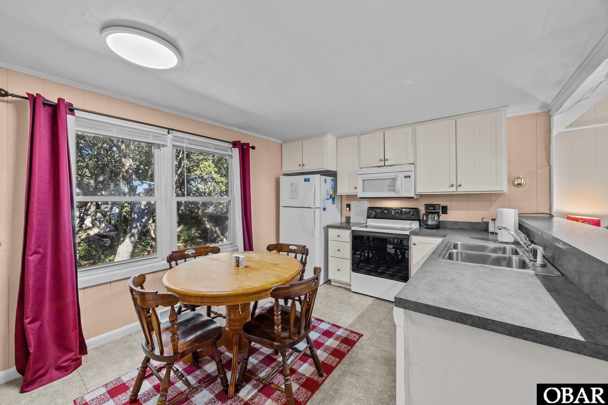 Entry is from the front deck, a quiet spot to enjoy ocean breezes and evening skies. Inside, the family room anchors the main living space and brings in steady natural light. The adjacent eat-in kitchen features a breakfast bar with additional seating and a large picture window facing the backyard. A convenient laundry/mudroom sits off the kitchen and leads directly to the back deck for handy grilling and to the shady backyard, which is well-suited for a picnic table or hammock.