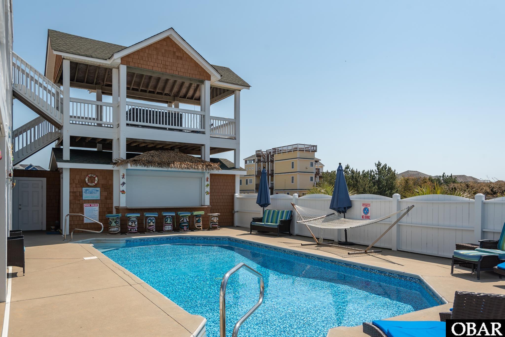On the ground level, the home’s entertainment hub awaits. A spacious game room and lounge area include a pool table, kitchenette, and ample seating for movie nights or group gatherings. Two additional bedrooms, including an en suite, complete this floor. Step outside to the private pool area where recent upgrades shine: a new pool liner and saltwater conversion enhance the swimming experience, while the enclosed outdoor tiki bar—equipped with a sink, dishwasher, refrigerator, freezer, and extensive storage—delivers the ultimate setting for poolside entertaining.