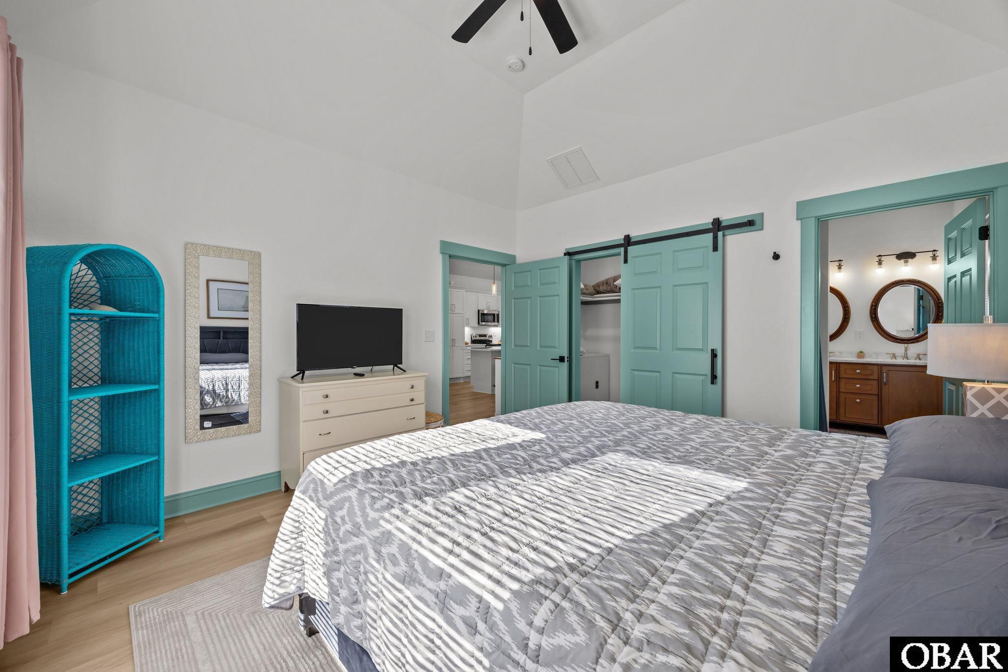 Outdoor living is a highlight with a screened-in porch that extends your usable space and offers a comfortable spot for morning coffee, casual meals, or evening downtime. Inside, the living area features barn-style doors that add a subtle, rustic accent while providing functional separation when needed.