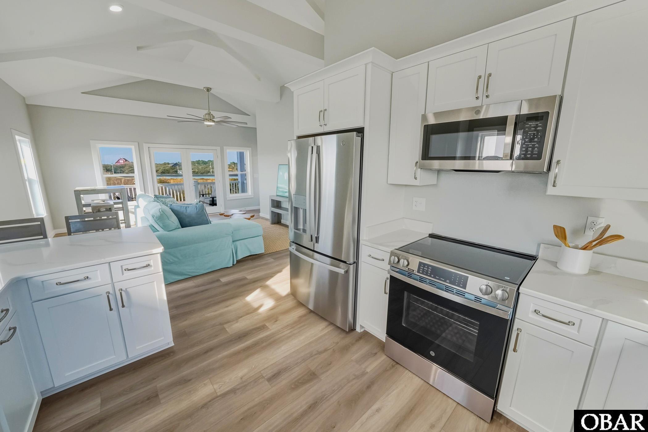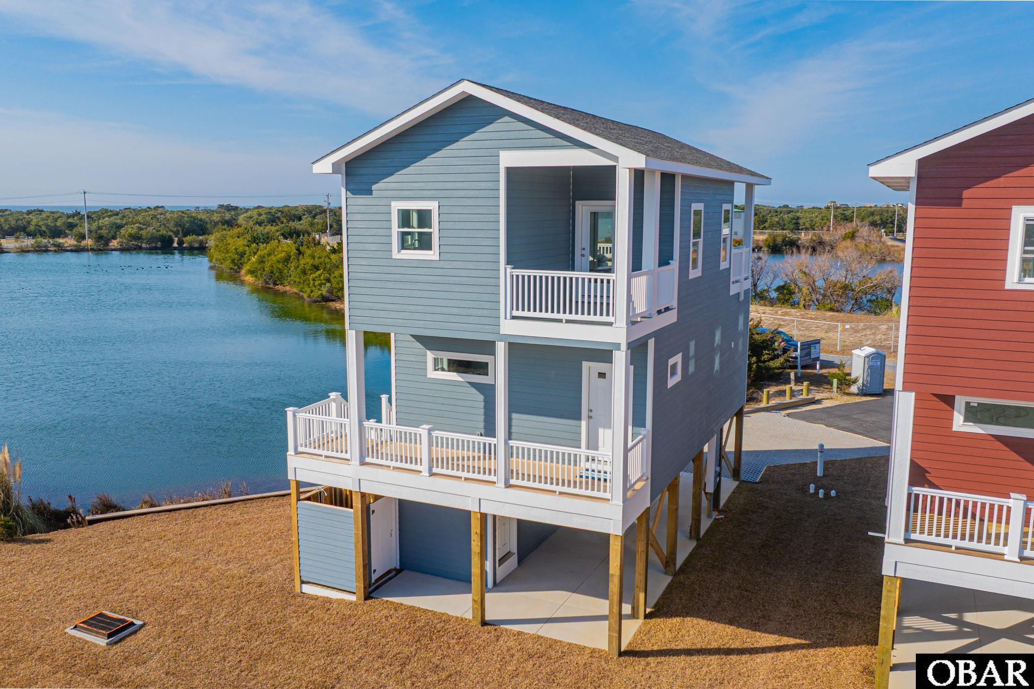Welcome to Downtime, a brand-new 2-bedroom, 2-bath water-view home located in the Kinnakeet Villas subdivision on Big Kinnakeet Drive. This Vista Model on homesite #1 is tucked into a quiet cul-de-sac and features an open, upper-level living area with vaulted ceilings and a seamless flow between the kitchen and living room. The home offers approximately 1,190 square feet of conditioned space, plus a spacious 17' x 8' ground-level storage room and covered decks ideal for coastal living.