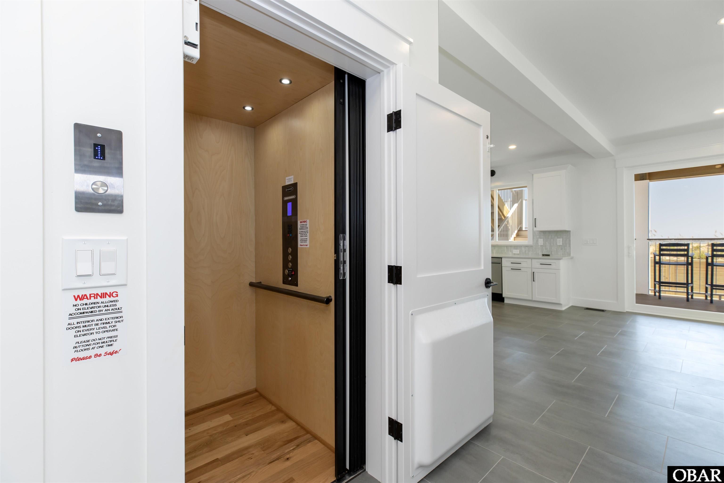 The interior includes four spacious bedrooms, each with a private bath, hardwood flooring, and a recreation room with wet bar. An elevator services all levels for added convenience. Outdoor amenities include a private pool with raised deck and bar seating, hot tub, and direct private beach access via a dedicated dune walkway.