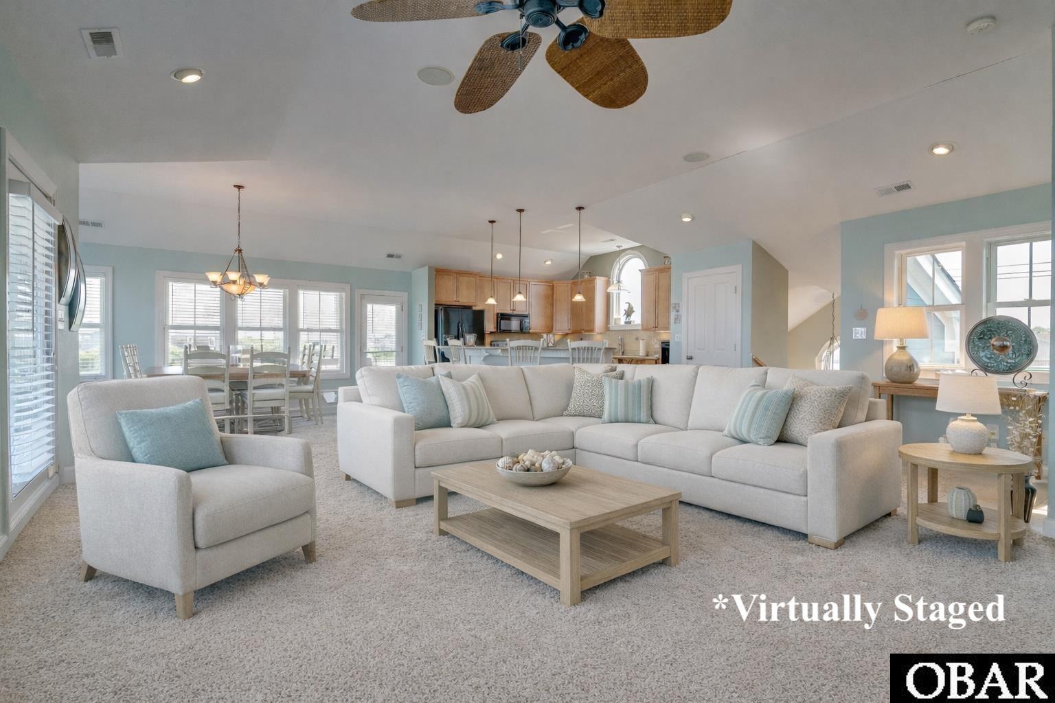 Sunrise coffee with a hint of Atlantic blue on the horizon...this is the kind of Outer Banks home that turns weekends into traditions. Built in 2005 and offering 3,589 square feet, this reverse-floor plan was designed for both connection and breathing room. With three separate living areas across three levels, everyone has space to gather—and space to retreat. The top floor is the heart of the home: a light-filled great room, spacious kitchen with bar seating, dining area, and the primary suite privately tucked away. The mid-level offers comfortable guest bedrooms and a cozy den, ideal for movie nights or quiet reading after a day in the sun. On the ground level, the living area complete with a wet bar, opens directly to your private backyard oasis. Step outside to your heated pool, hot tub, and outdoor shower. The property—stretching across Ride Lane—offers rare additional outdoor space perfect for volleyball, cornhole, bocce ball or whatever you can dream up! Offered fully furnished and not currently in a rental program, the opportunity is yours to define. Enjoy it exclusively as a second home, or take advantage of its strong investment potential with a projected rental income of approximately $95,000 per year. A golf cart is included with an acceptable offer, making beach runs effortless. Such a convenient location in Kitty Hawk and minutes from public beach access, local favorites like Black Pelican, Ocean Boulevard Bistro, and Bad Bean, plus shopping, groceries, and coffee shops. This is more than a beach house - it’s the backdrop for your next chapter!