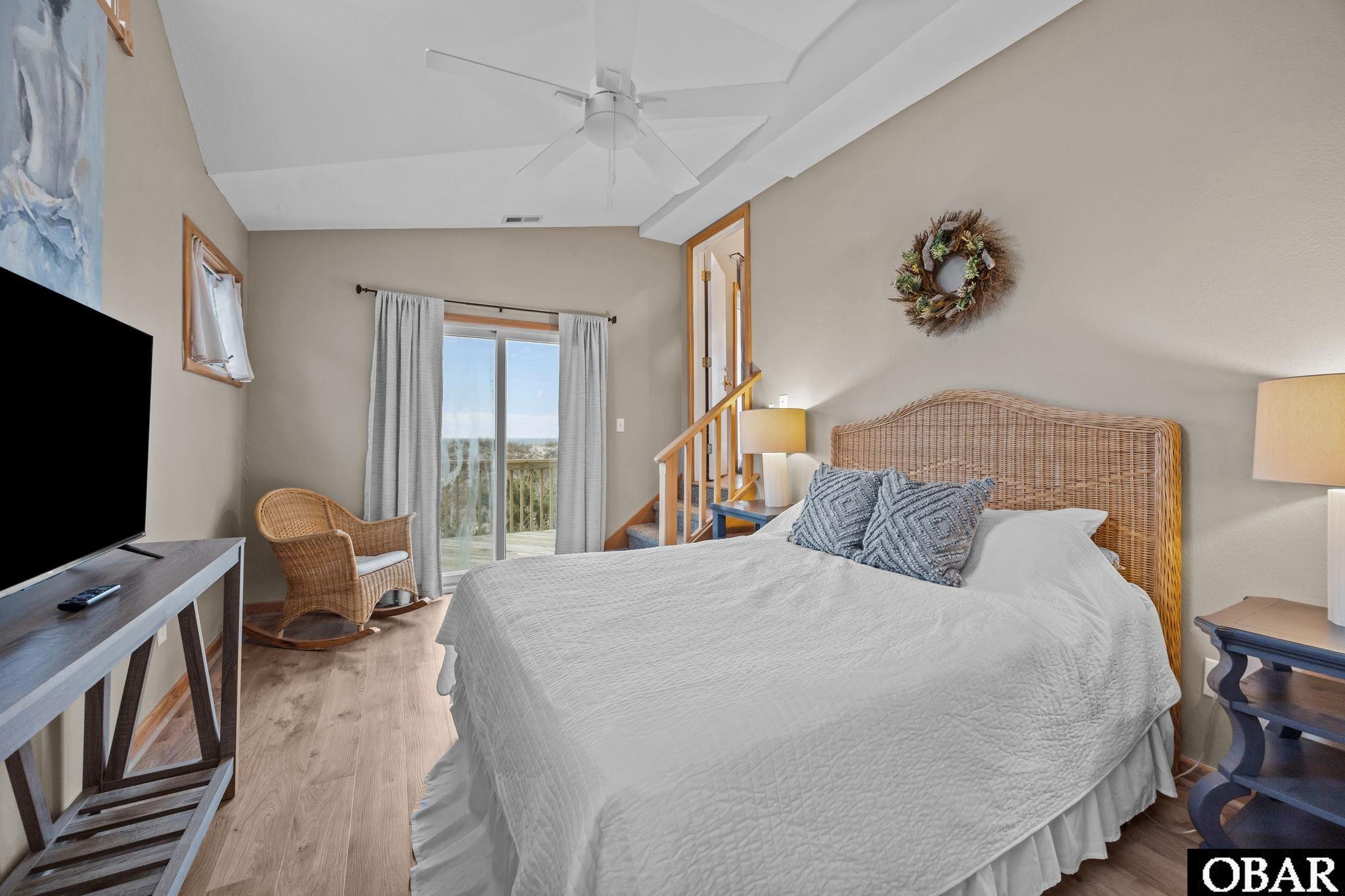 The top-level showcases sweeping ocean views, a loft-style sitting area, and access to the highest sun deck. Two spacious bedrooms are located here, including a private oceanfront suite with its own deck and a bath with double vanities. The second bedroom enjoys deck access and shares a full bath with the living area. The kitchen opens to the main living and dining spaces and connects easily to a screened porch for coastal breezes and outdoor dining.
