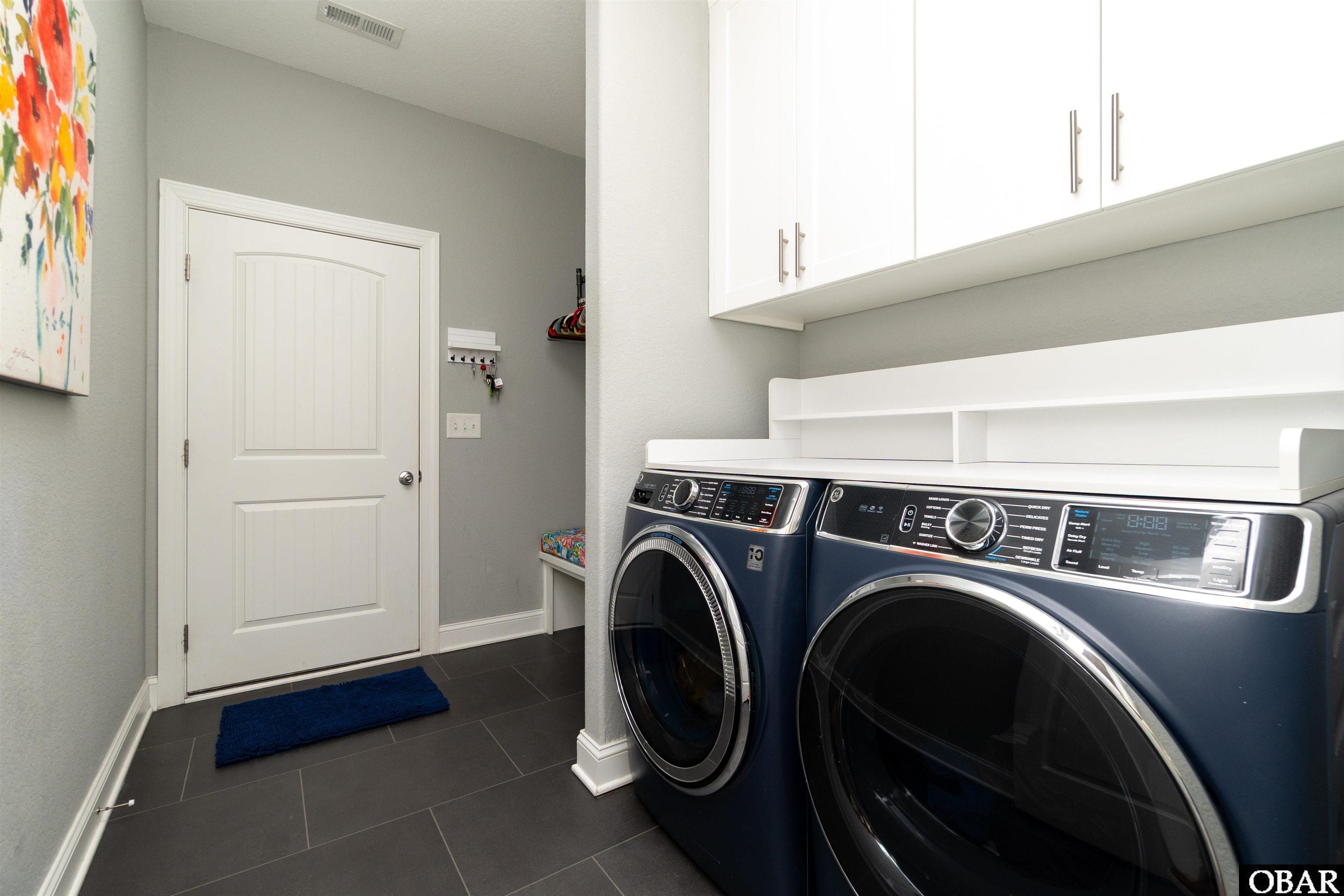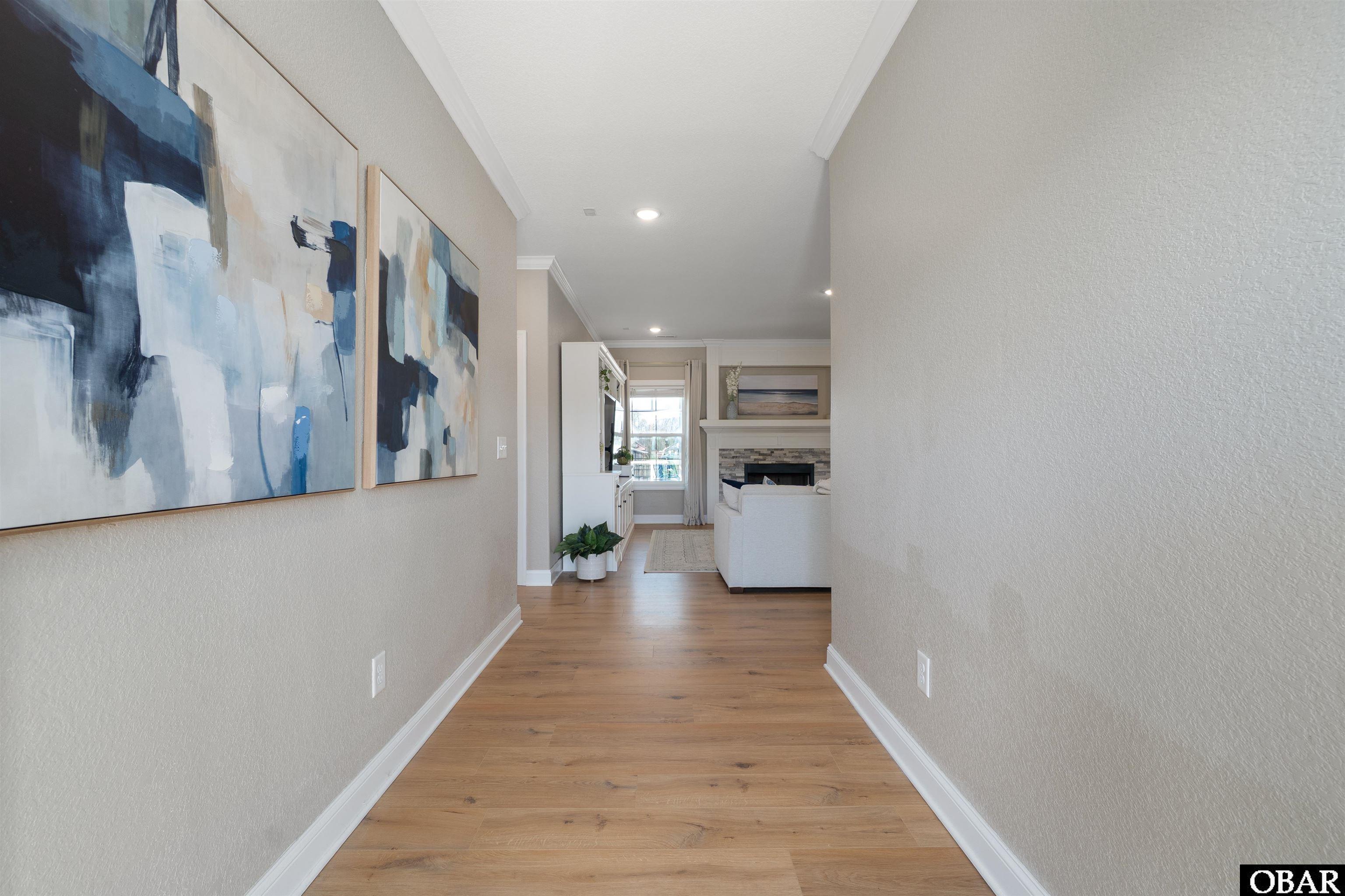 The attached two-car garage features a sleek epoxy-coated floor, combining durability with a polished finish. Storage is abundant with a large accessible attic area, providing convenient space for seasonal items and long-term organization.