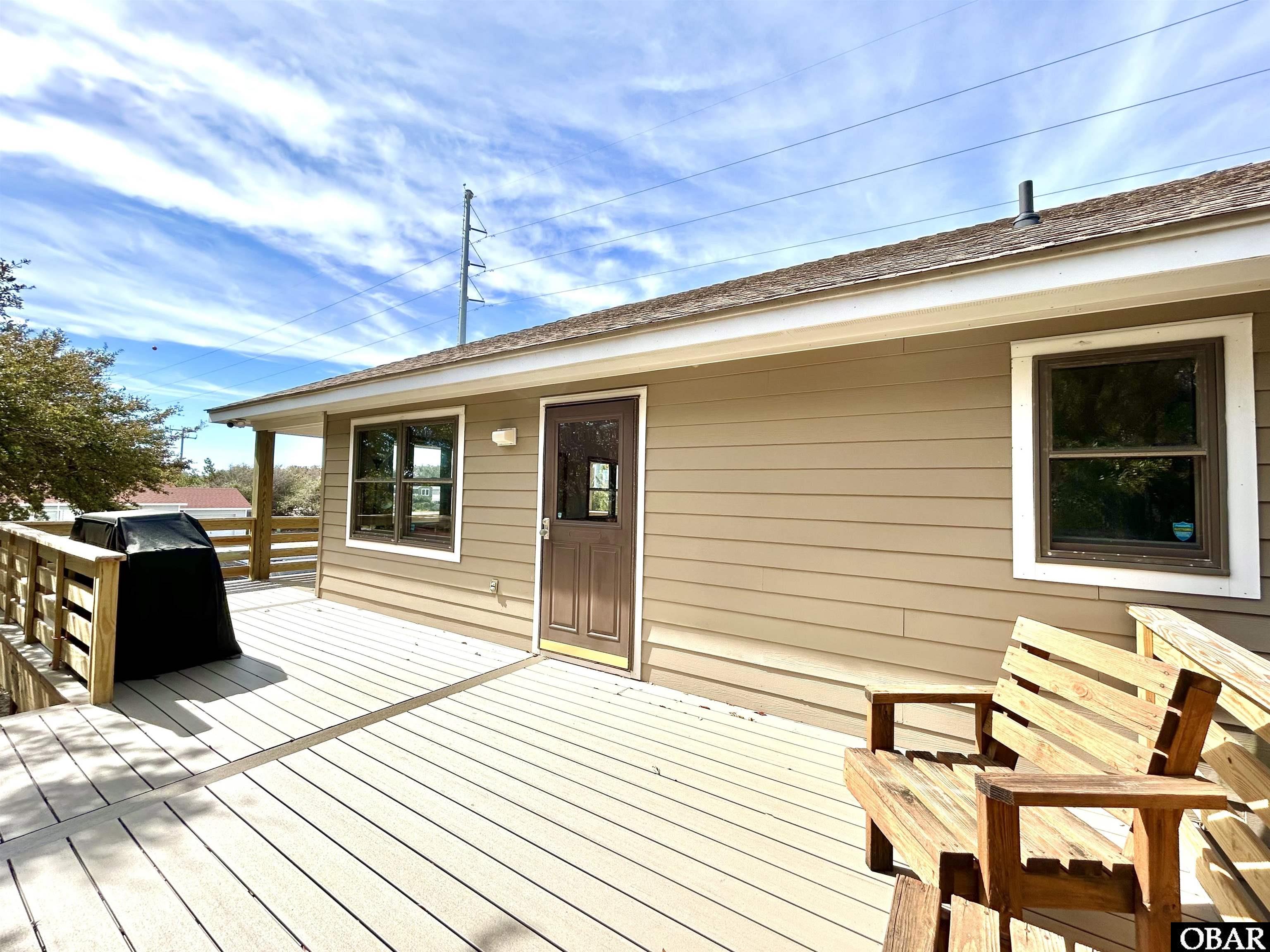 RENOVATED, UPDATED, STEPS TO THE BEACH! This adorable surf shack is TURN KEY & walking distance to the First Street public beach access! You are in the middle of it all, centrally located in Kill Devil Hills across from Lowes, Publix, Resturaunts and so much more. This home feels brand new! Brand new, oversized TimberTech decking requires no maintance. Smart home security system with flood light cameras, smart lock & smart thermostat allow you to control it all when you aren't here. Fresh paint on the walls and ceilings (bye bye popcorn) New LVP flooring installed throughout the entire home, along with new appliacnes in the kitchen. The cathedral ceilings in the open kitchen/dining/living area make this home so incredbly light and bright! 3 bedrooms and 2 full bathrooms offer plenty of space for your family, friends or renters. The primary bedroom has an ensuite bath and two large guest bedrooms with brand new furnishings and have a shared full bathroom. Stairwell leads to your interior utility/laundry room & the massive garage that has endless possibilities!