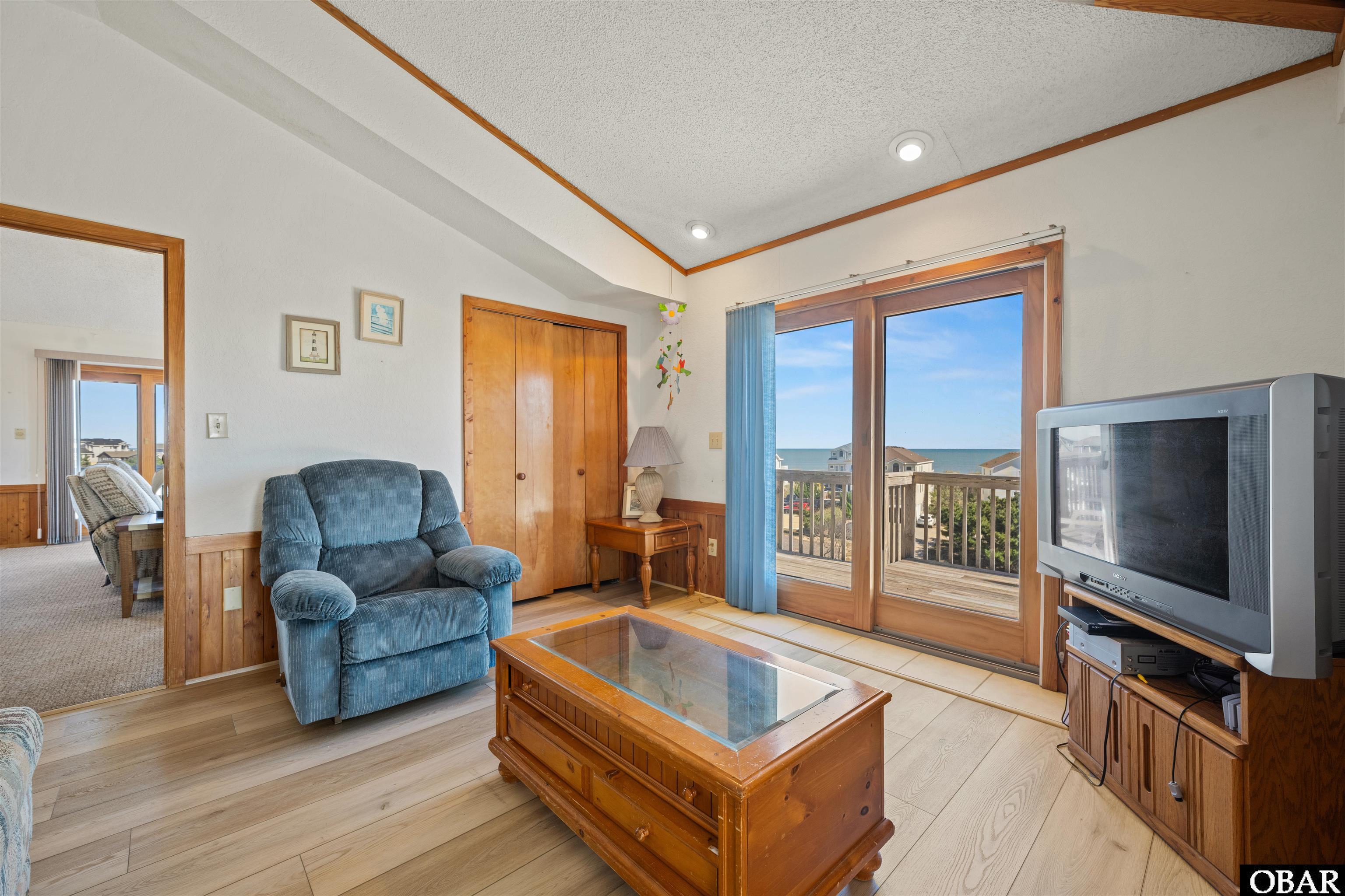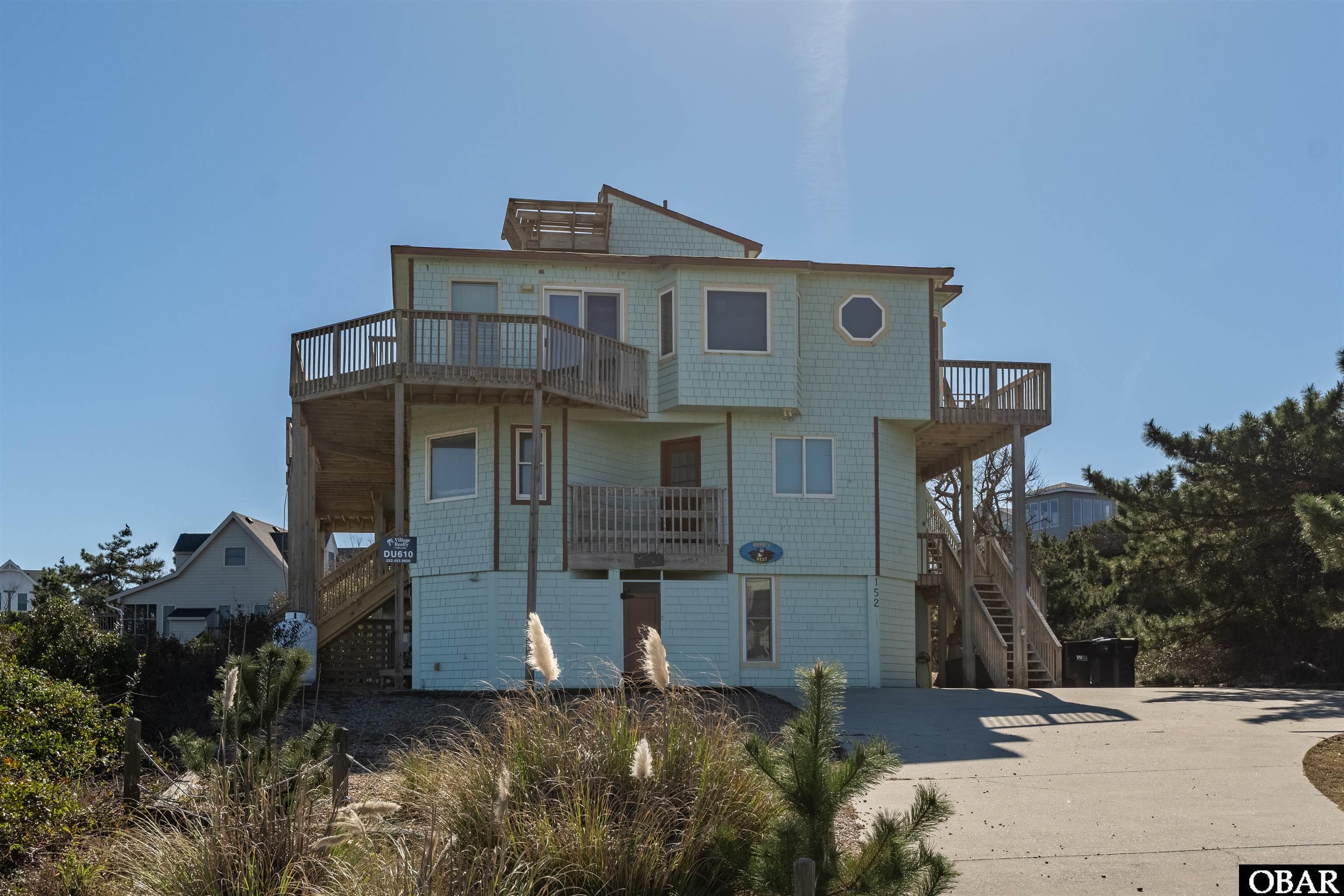 The existing six-bedroom home is ready for its next chapter, whether through a thoughtful renovation or a complete reimagining. The structure is already designed for large-group occupancy and can be updated to increase rental appeal and income. With generous living spaces, multiple gathering areas, a game room, theater room and expansive decking, the home was designed to bring people together and can be updated to reflect a more modern coastal style. On the ground level, you’ll find a spacious game room with a full kitchen, plus a primary suite with private bath, a bunk room, and an additional full hall bath. The mid-level features a theater room for the ultimate movie experience. Three more bedrooms, including one primary with ensuite bath and a cozy den, plus a full hall bath and laundry. A spiral staircase serves as the home’s centerpiece, connecting the main level. The top level showcases panoramic ocean views form its expansive decking. The light-filled great room offers ocean views from the couches, too. Views of the ocean and sound are visible from the living room and dining room. Accessible by a ship's ladder is a loft area with it's own mini split currently used as an office. Between the great room and the primary bedroom, you'll find a separate den. The expansive primary suite includes its own sitting area and a spa-inspired bath with jacuzzi garden tub and bidet. Outdoor living is impressive, with abundant decks on different levels accessible from multiple rooms, offering both private retreats and gathering spaces. The 12’ x 31’ saltwater pool with a large patio and tiki bar, complete with sink and refrigerator sets the stage for unforgettable coastal fun. A captain’s watch crowns the home, delivering 360°panoramic views you’ll never forget. With ocean access just a short stroll away to Duck’s nationally renowned beaches, this property is the ideal location.
