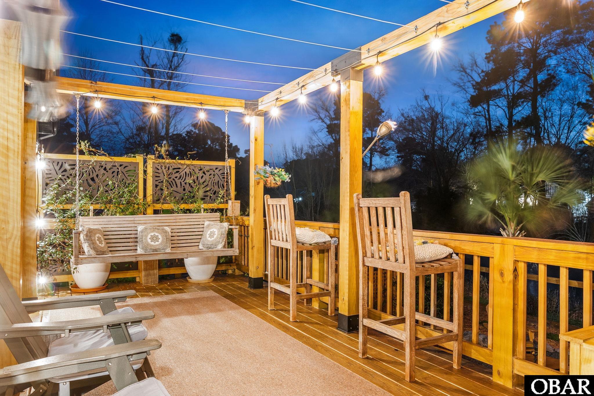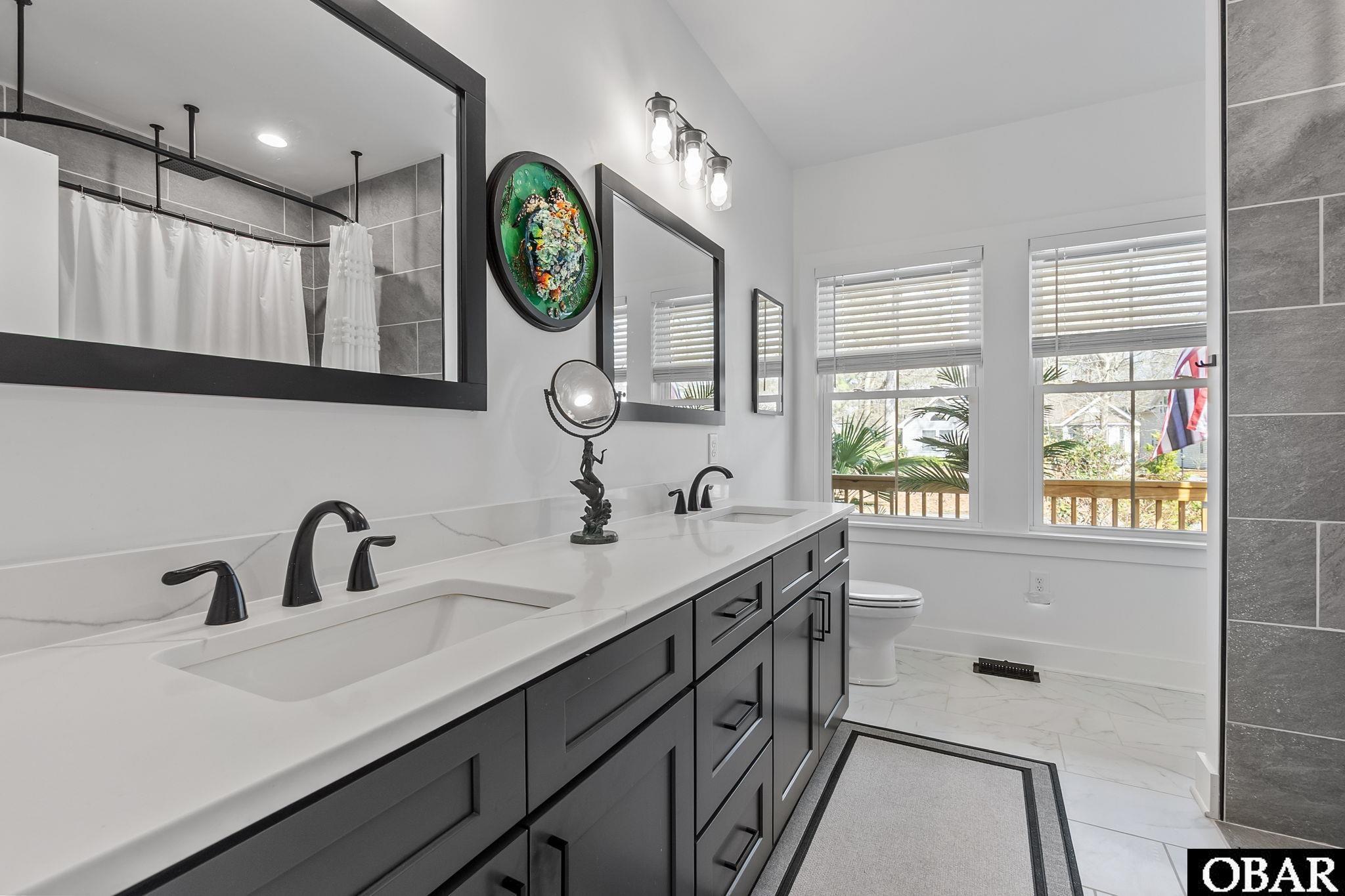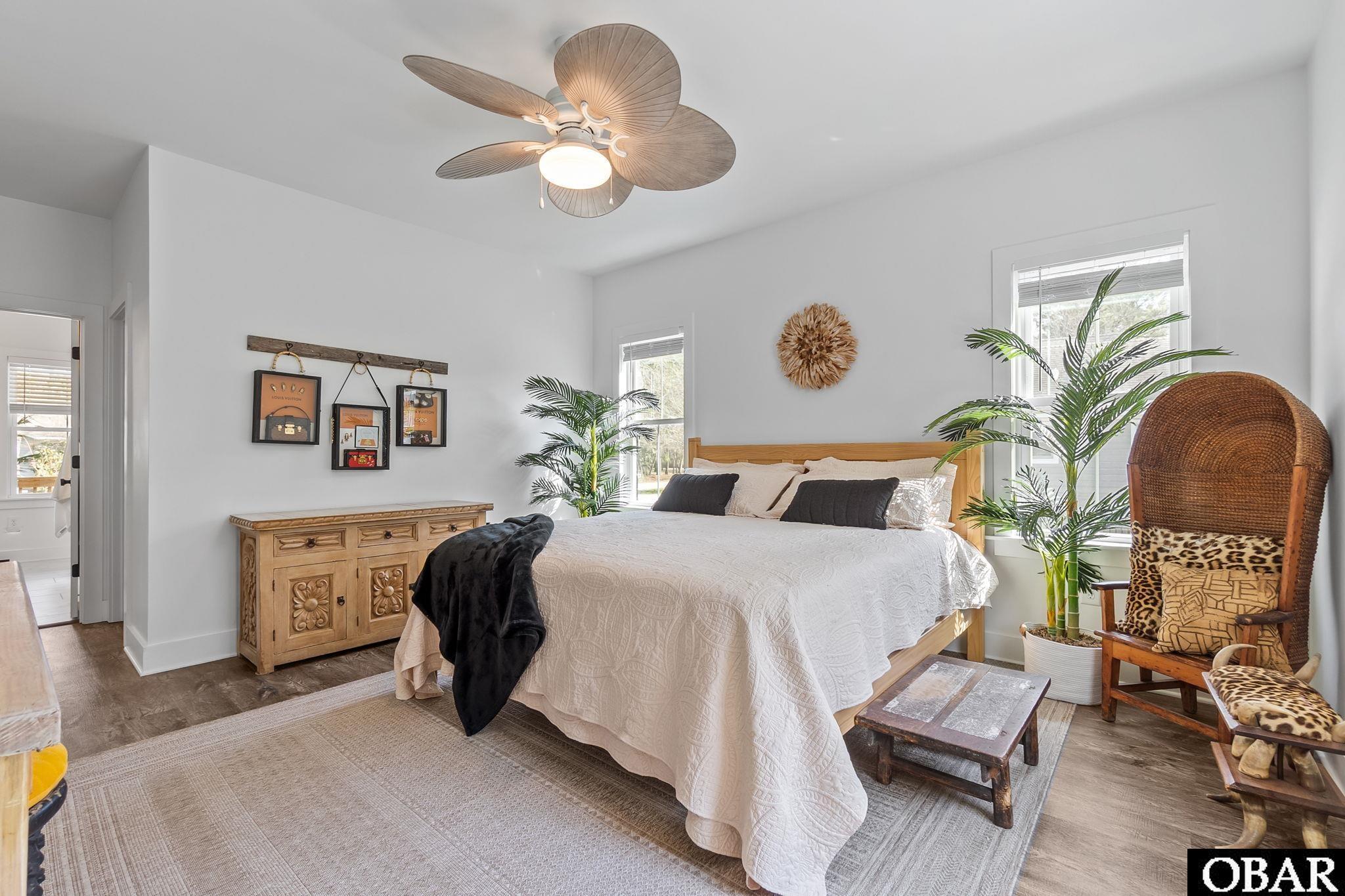 Stunning waterfront home in Kitty Hawk offering over 2,500 square feet of thoughtfully designed living space, where modern design and a peaceful natural setting come together beautifully. Situated on more than 19,000 square feet of meticulously landscaped grounds, the property enjoys sweeping pond views and a sense of privacy rarely found so close to the beach. Hearty palm trees, a fenced yard, and a charming rock pathway—created by the owner—enhance this tranquil backyard setting. Drip irrigation ensures easy landscape maintenance. A covered tiki hut overlooking the water provides a shaded spot to relax while enjoying the scenery, and even feeding the turtles that frequent the pond. Inside, a welcoming foyer introduces the home’s main living areas and sets the tone for the comfortable, thoughtfully designed interior. The layout creates a natural flow between the living room, dining areas, and kitchen, making the space well suited for both everyday living and entertaining. The first floor offers a formal dining room, ideal for gatherings and special occasions, along with a convenient powder room for guests. A laundry room is thoughtfully positioned between the attached garage and the main living area, creating a practical transition space for everyday living. The spacious kitchen is designed for both function and comfort, featuring abundant cabinetry, generous workspace, and bar-top seating. The adjoining living area offers ample space for gathering and relaxation, creating a natural flow for both daily living and entertaining. Just off the main living area, a large deck with warm lighting provides a comfortable outdoor space overlooking the landscaped yard and pond—an inviting spot to enjoy the peaceful surroundings throughout the seasons. The primary suite, conveniently located on the main level off the living area, serves as a private retreat featuring a large walk-in closet and a beautifully appointed ensuite bath complete with double vanities and an elegant freestanding clawfoot tub with shower, perfect for relaxing soaks or refreshing showers. Upstairs, three bedrooms are complemented by a large, full hall bathroom. The largest of the bedrooms is currently utilized as a craft room, offering flexibility for a variety of uses such as a home office, reading room, or creative workspace. Adding to the home’s versatility is a separate bonus room over the attached garage, currently configured as a studio with its own bathroom and private exterior entrance, providing additional flexible space for guests, hobbies, or creative pursuits. Outdoor living is equally appealing, with a spacious backyard overlooking the pond where birds and wildlife are frequent visitors. The property offers plenty of room to create additional outdoor amenities, including the potential for a future pool (buyer to confirm). Additional features include an attached one-car garage, as well as a detached oversized two-car garage that provides exceptional storage and potential for future finishing. With its modern exterior, strong curb appeal, and peaceful pondfront setting, this distinctive property offers a rare opportunity to enjoy privacy, natural beauty, and refined coastal living in Kitty Hawk, conveniently located near the beaches, dining, and attractions of the Outer Banks. Check out the virtual tour by clicking the link, or copying and pasting it into your browser: https://my.matterport.com/show/?m=aNvQkjxxEFT
