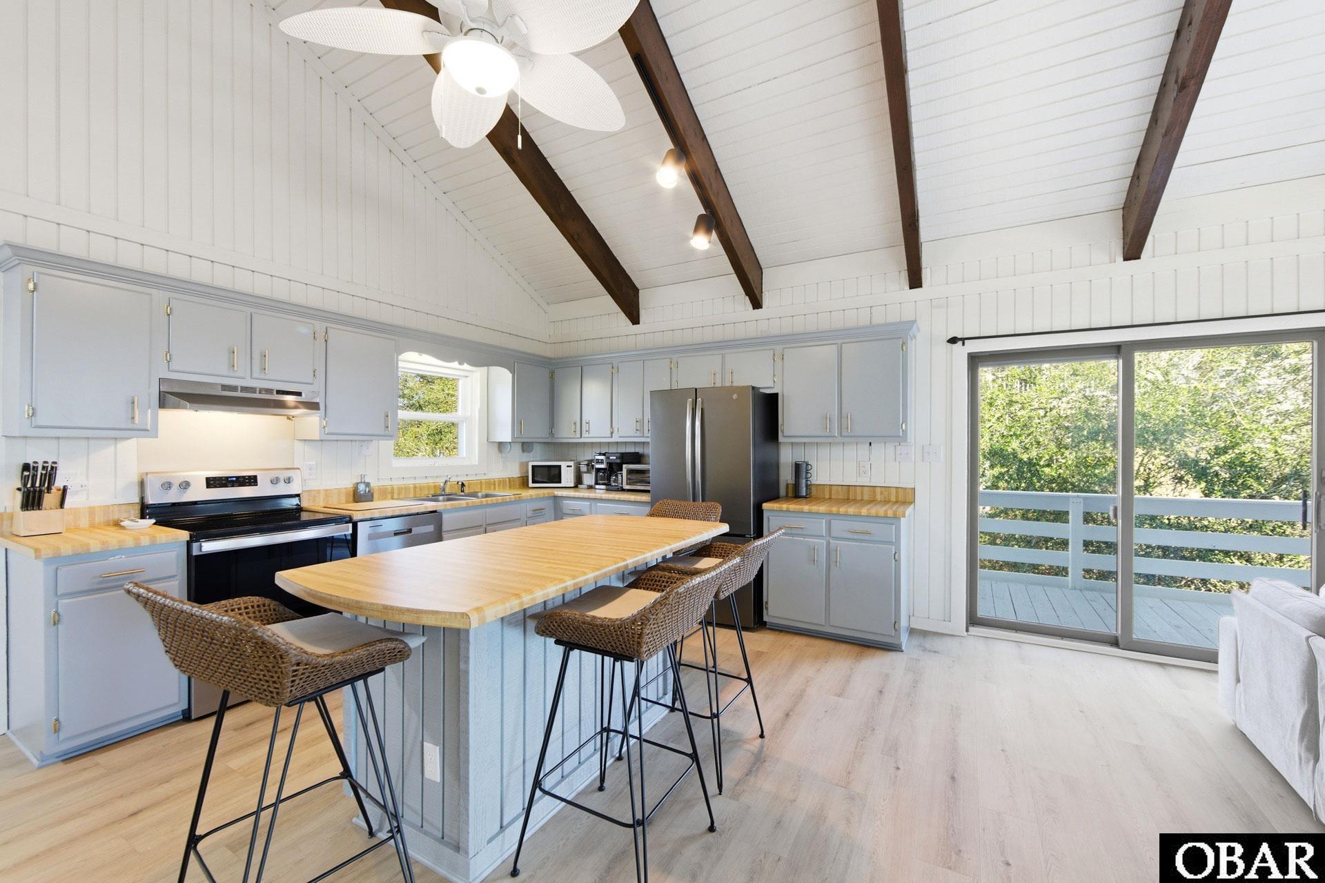 Located in the desirable Sea Scape community of Kitty Hawk, this 4-bedroom, 3-bath home offers the rare combination of no HOA fee, golf course frontage, ocean views, and easy walkability to the beach and local favorites. Set right on the fairway of Sea Scape Golf Links, the home enjoys a peaceful westside setting with the quiet, laid-back vibe buyers love, while still offering the convenience of a traffic light for easy access across NC-158 to the beach, restaurants, and shops. Sea Scape Golf Links is known for its natural Outer Banks beauty, with windswept sand dunes, maritime forest, dramatic elevation changes, and ocean views from several holes. From this home, you can head over to Sandtrap Tavern for a sunset cocktail overlooking the course and the ocean, or stroll to nearby beach accesses like Eckner, Luke Street, and Bennett Street. Local favorites, including Ocean Blvd Martini Bar, are also within walking distance. Inside, the home is full of charm with a rustic coastal feel throughout. Vaulted cathedral ceilings with exposed beams create a warm, inviting feel in the kitchen and living areas. A spacious screened porch with string lights overlooks the golf course and offers ocean views, making it the perfect place to relax after a day at the beach. The backyard features a fire pit for evenings under the stars, and the outdoor shower is ideal for rinsing off after the beach. The layout offers flexibility for both full-time living and a second home or investment opportunity. The lower level welcomes you with a large bedroom that can easily function as both a sleeping space and hangout area. On the main level, the owner’s suite features a private full bath and its own balcony with ocean views. Upstairs, you’ll find two additional bedrooms, including one with ocean views, along with a full bath featuring a double vanity. All bathrooms have been tastefully updated with new vanities and fixtures. The garage provides room for storage or your future golf cart. The home is currently in Village Realty’s rental program, though the owners use it frequently and have blocked portions of the calendar, making this property especially appealing for someone seeking a primary residence, second home, or investment with endless possibilities.