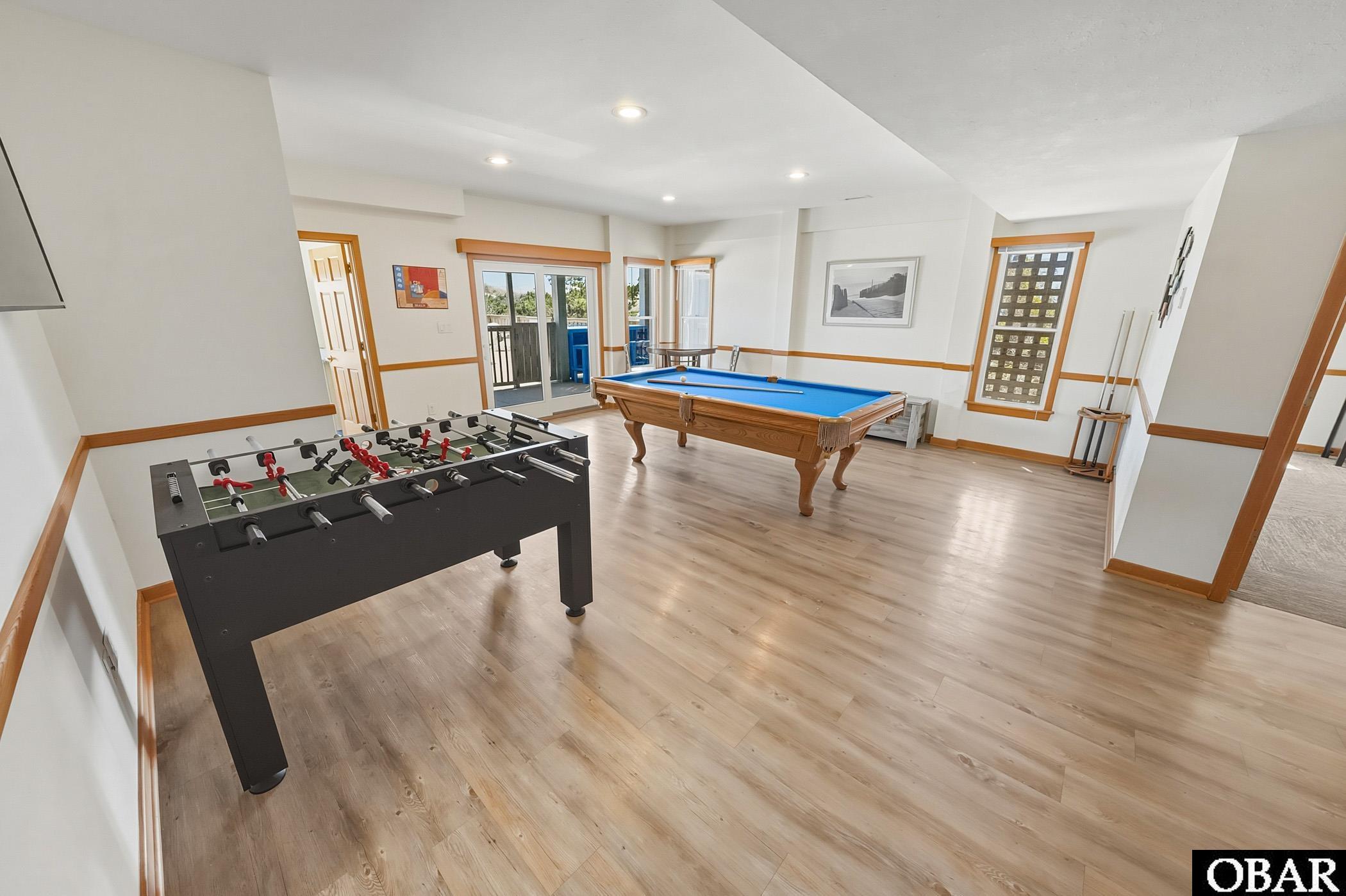 The ground level is set up for fun, with a spacious game room featuring a pool table, foosball, and a wet bar, plus easy access out to the pool area. Recent updates include new felt and bumpers for the pool table and a new foosball table, so everything is ready for guests to enjoy.