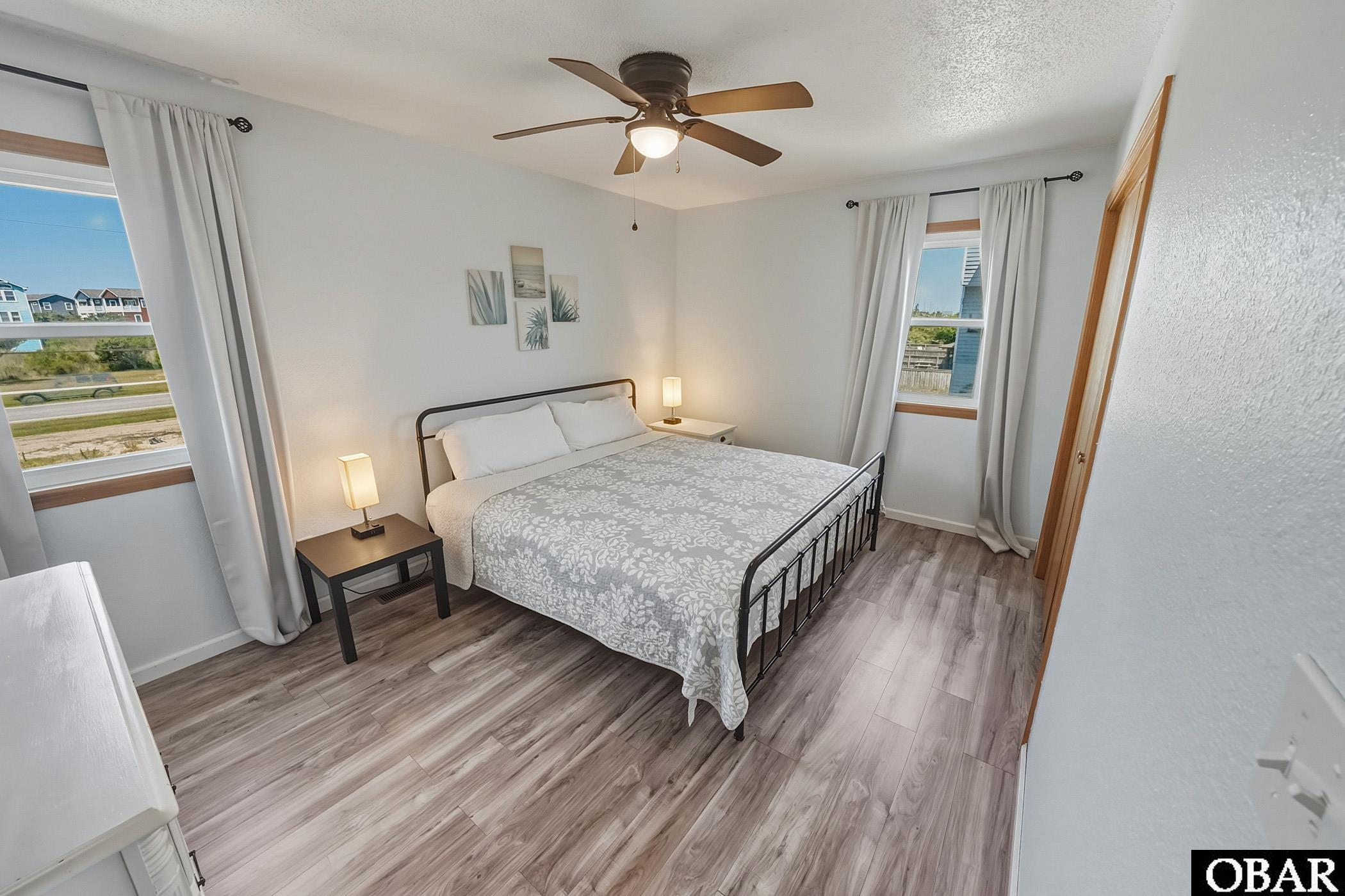 The first level has three bedrooms and the laundry right where you need it. There’s a king bedroom and a bunk room with a trundle that share a full bath, and both open out to a shaded deck with a really nice ocean breeze. Across the hall is a roomy king en suite with its own bath.