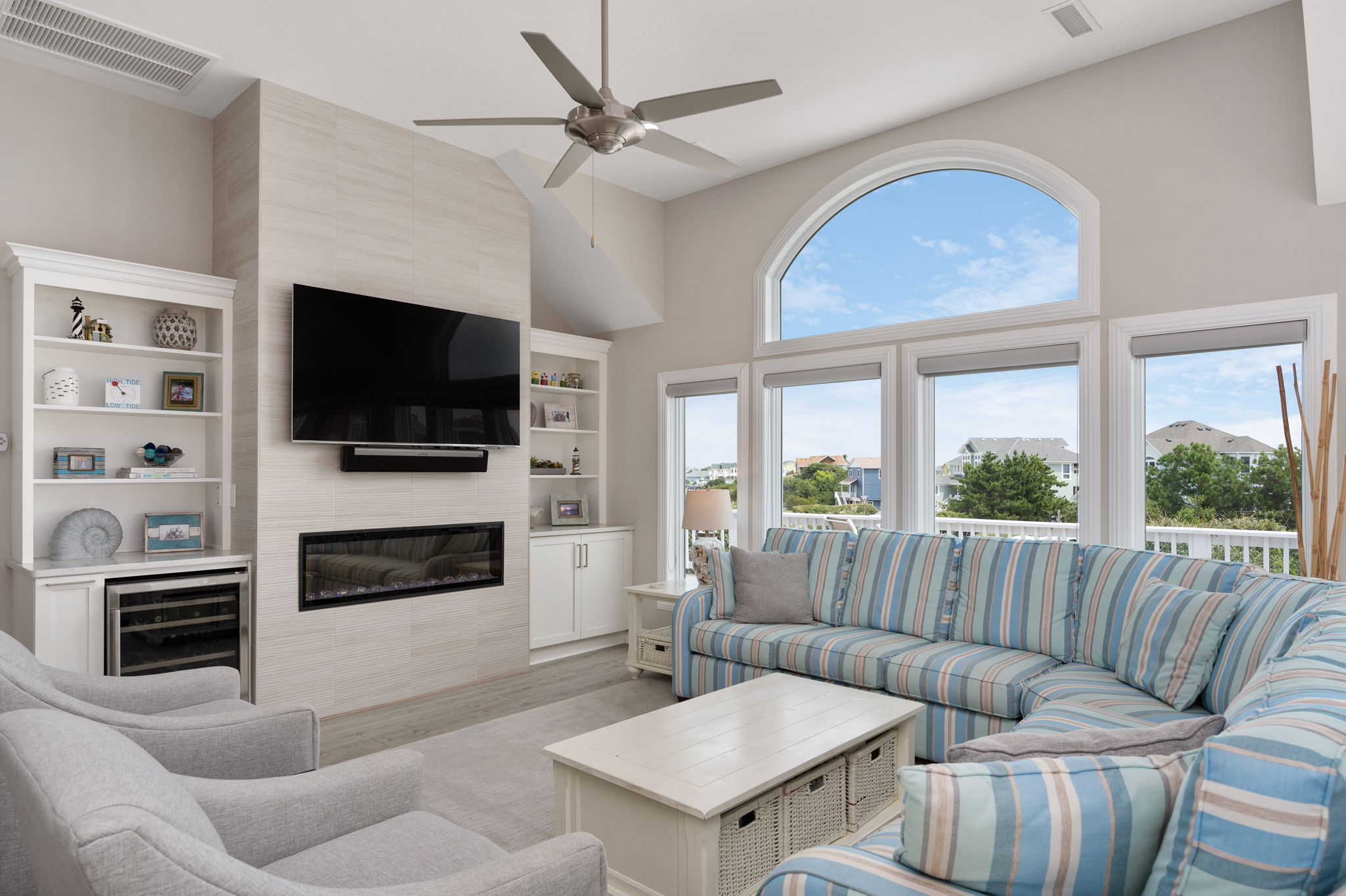 After a day of sun, sand and surf, come home and unwind in the thoughtfully designed and tastefully furnished great room. The reverse floorplan, vaulted ceilings and wall of east-facing windows make the most of the horizon ocean views. Chill your bottles in the wine fridge before curling up in front of the cozy electric fireplace. Both the living and dining areas lead out to a spacious sun deck with barefoot-friendly Trex decking. Back inside, the open-concept layout and stylish LVP flooring tie the common areas together for a cohesive look with excellent flow. The chef in your group will appreciate the remodeled gourmet kitchen with large center island, quartz countertops and top-of-the-line appliances including a six-burner gas range. Two refrigerators and two dishwashers make cooking and clean-up for large groups a breeze. The primary suite is also located on the top level and features a spa-like bath with dual vanities and custom tiled shower with rainfall showerhead. The mid-level consists of a den with TV and four additional bedrooms - all ensuite for plenty of privacy. Downstairs you'll find two more bedrooms, as well as a rec room with pool table and convenient access to the backyard oasis where you can cool off in the saltwater pool or soak in the hot tub. After dark, gather your family and friends around the fire pit to share stories, tell jokes and make memories under the stars.