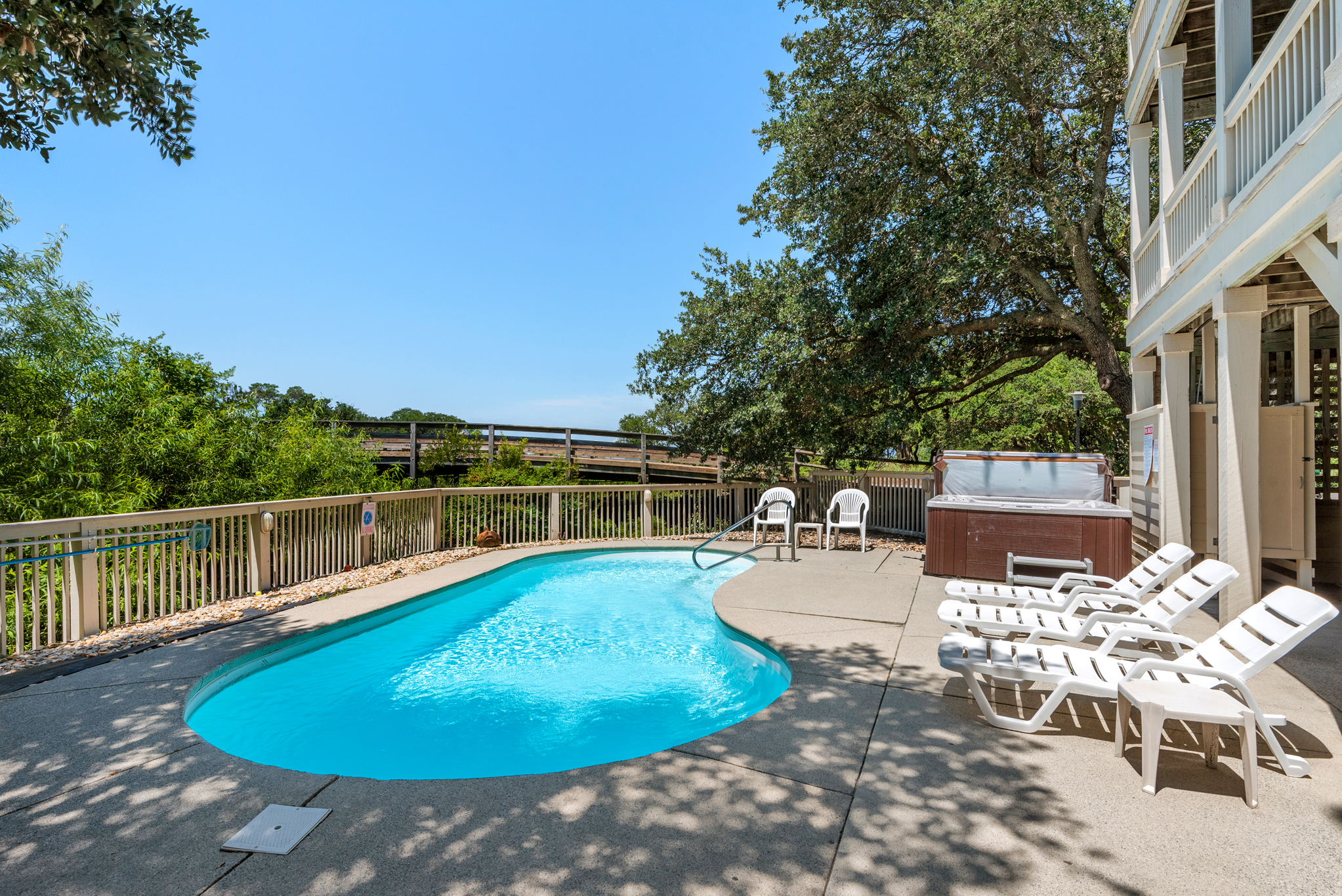 Calling all golfers and beach lovers! After a day at the exclusive Pine Island Beach Club, relax at this custom-built home in The Currituck Club, surrounded by mature landscaping and situated at the foot of the Currituck Club’s quaint and well-known Sunset Bridge. Afternoon Tee is the premier choice for anyone looking to round out their beach time with golf cart rides, bike rides, and walks in this picture-perfect setting. Multiple decks, porches, and a pool area provide endless opportunities for enjoying the great outdoors and admiring wildlife.