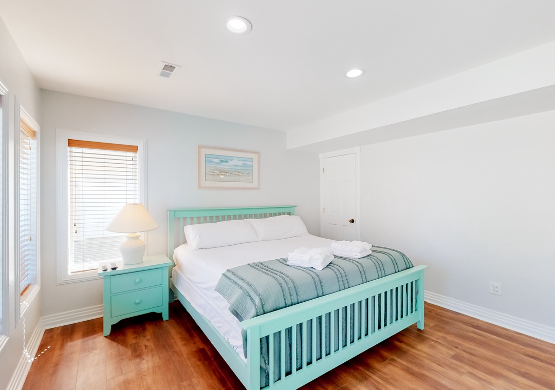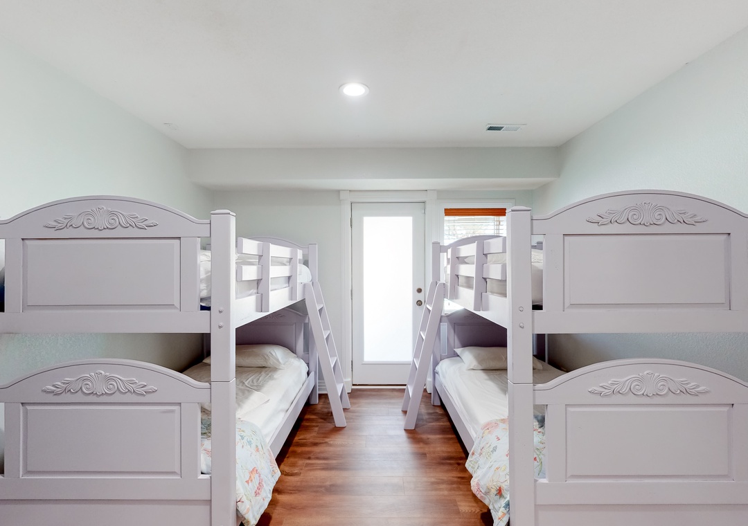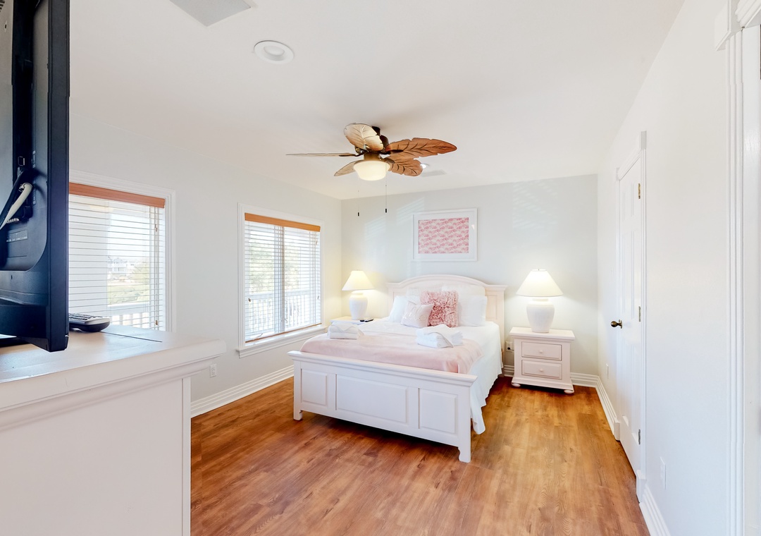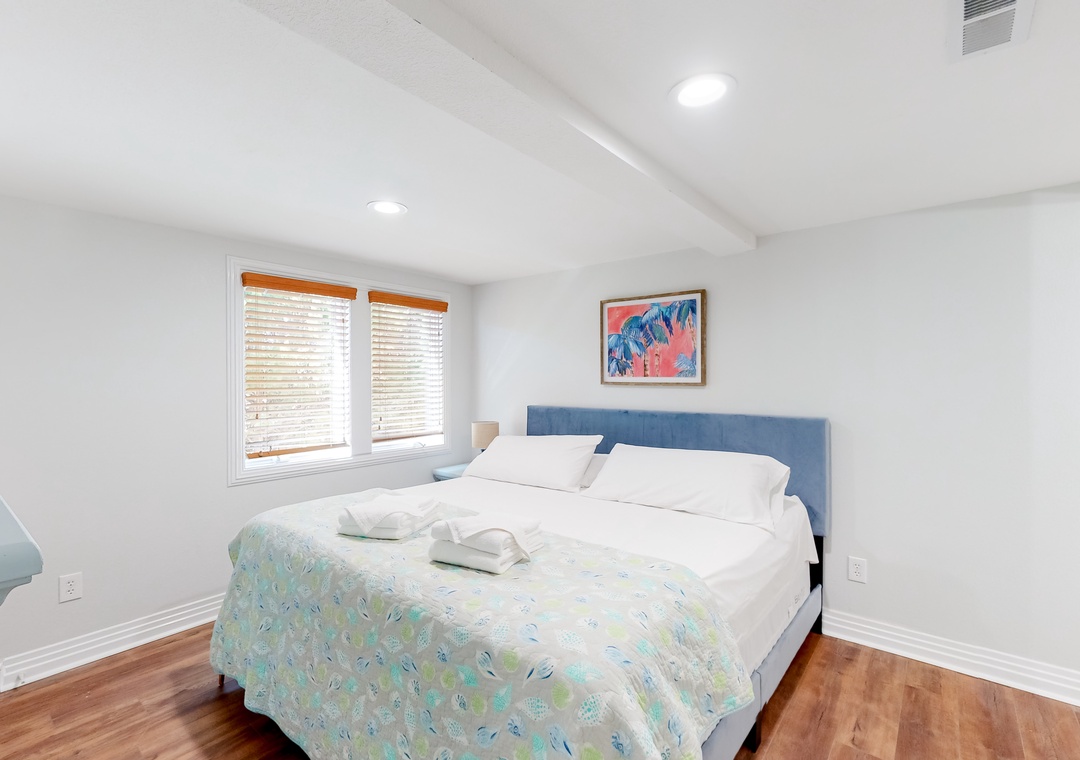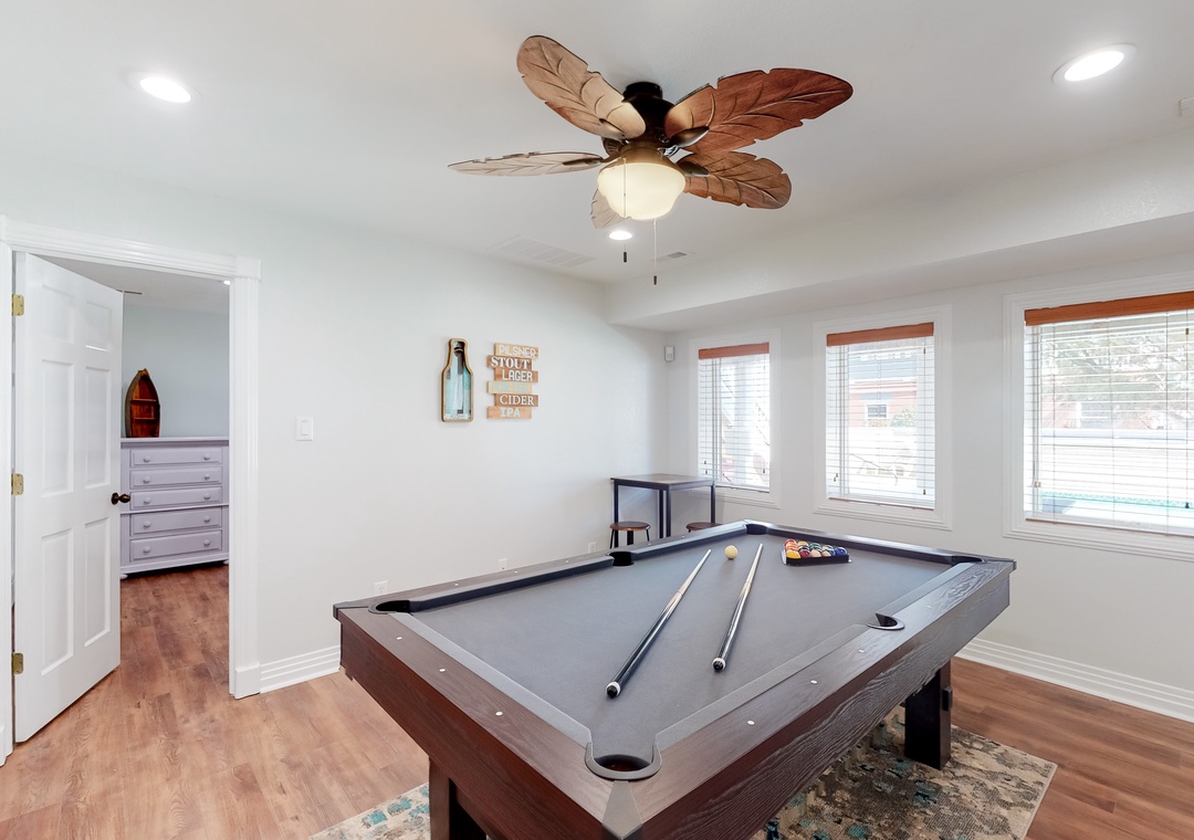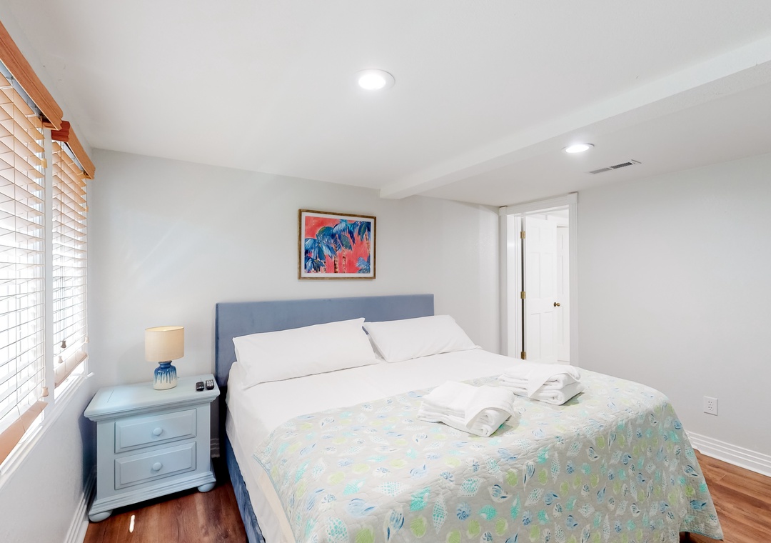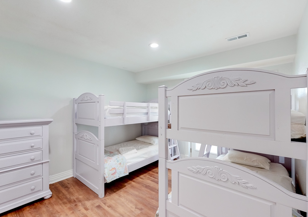 The ground level of this getaway will be the hub for entertaining, with the recreation room boasting a queen sofa bed, chair, and kitchenette with a refrigerator, sink, and microwave. A TV with a Blu-ray player and many books are provided for your enjoyment. A laundry room with a washer/dryer, laundry sink, and ironing board round out this level. Plus, sliding glass doors lead to the pool deck when you want a quick dip! The mid-level foyer includes an open office with a desk/fax machine for remote work and a sliding door to the deck.
