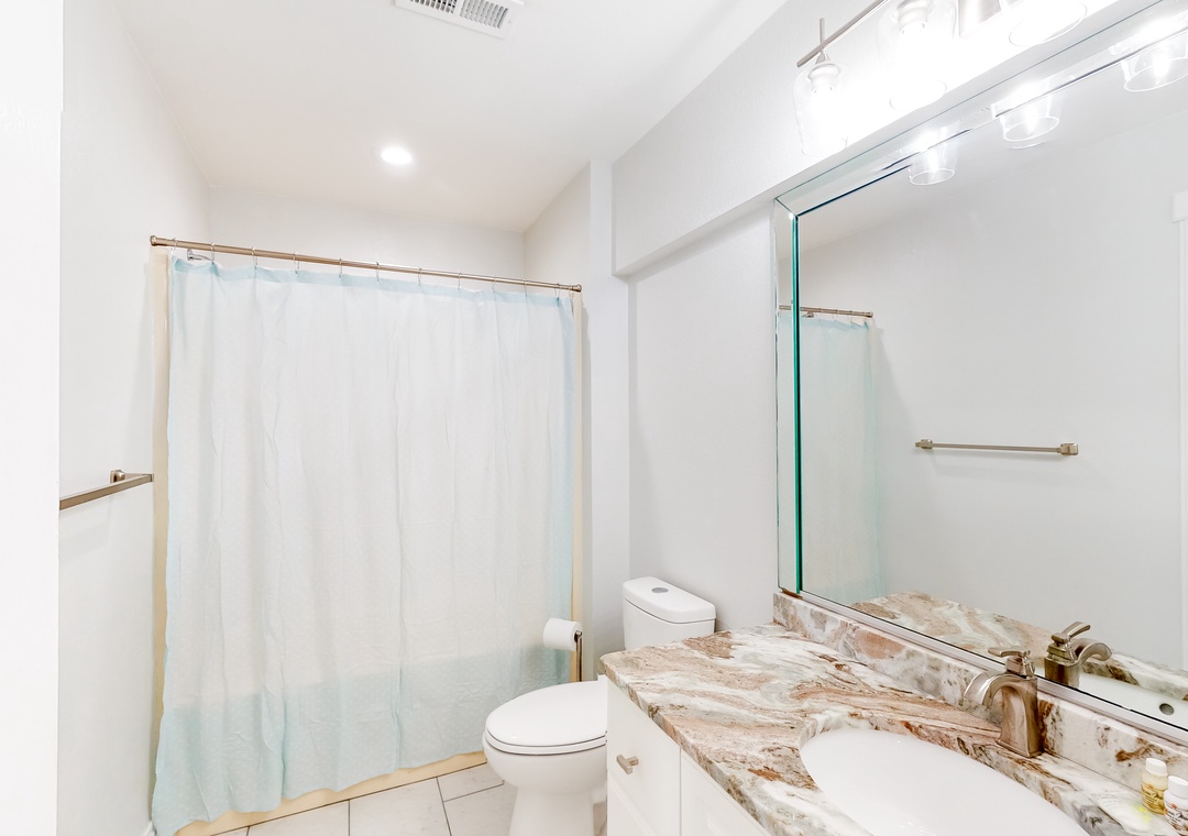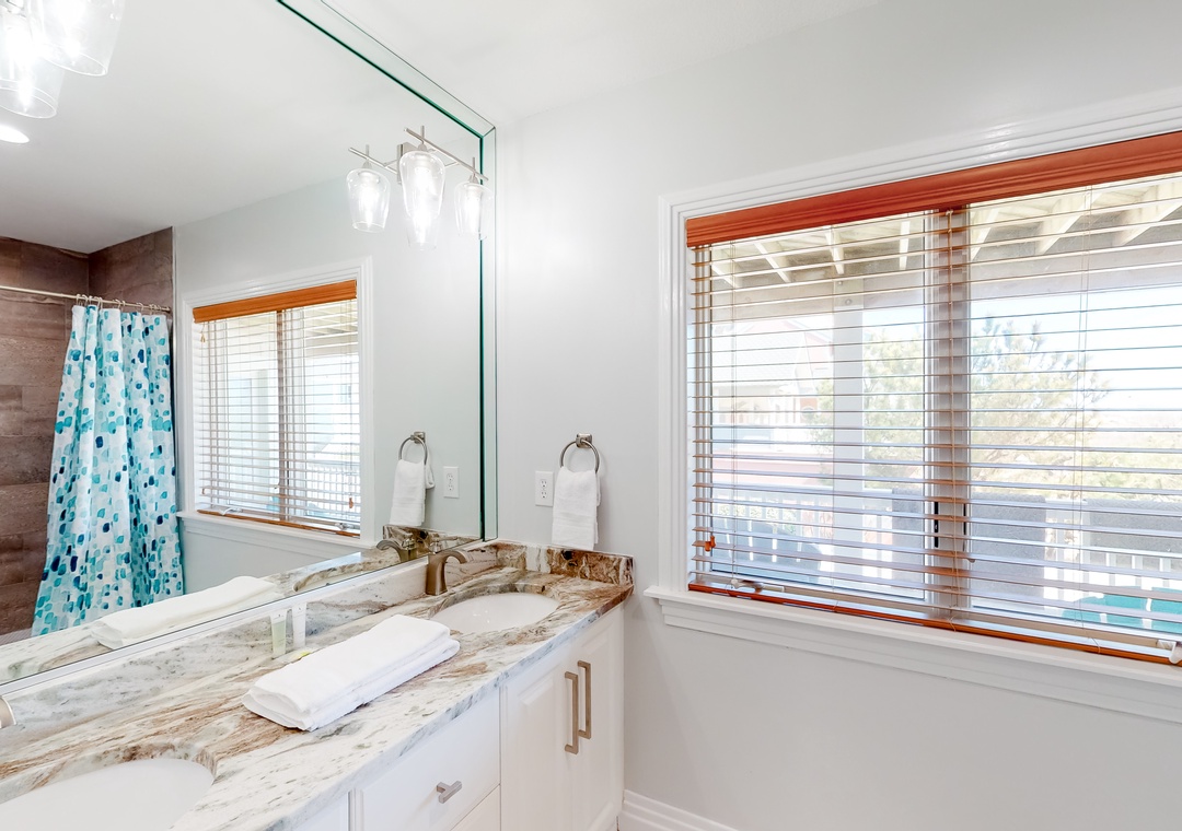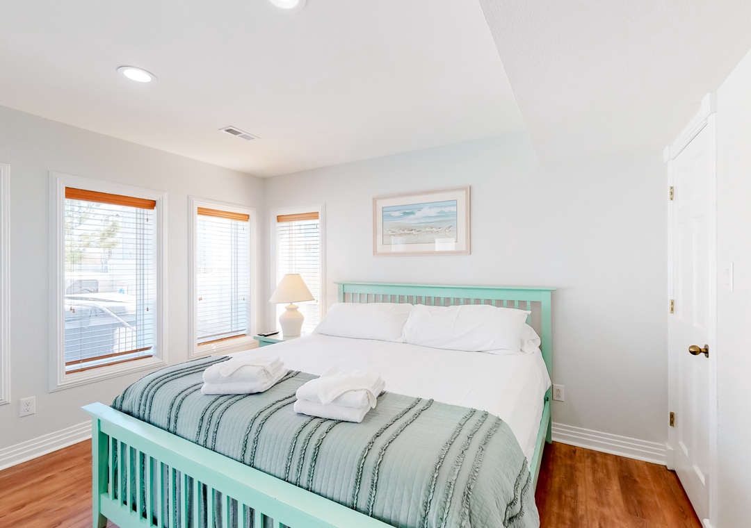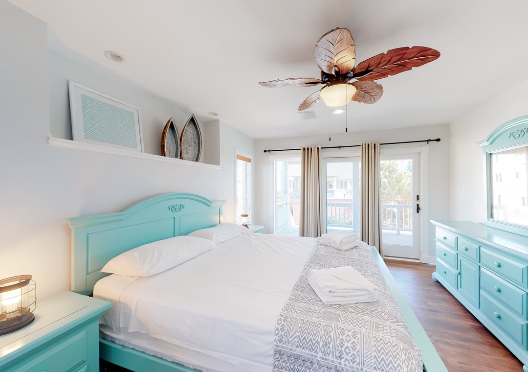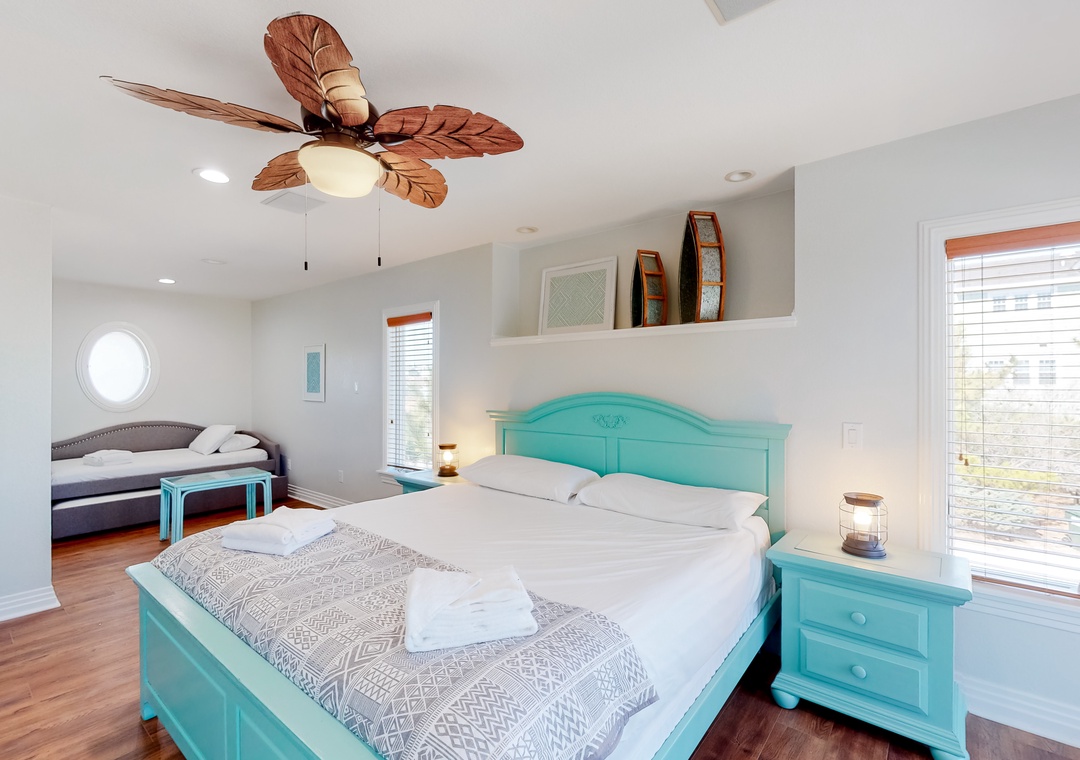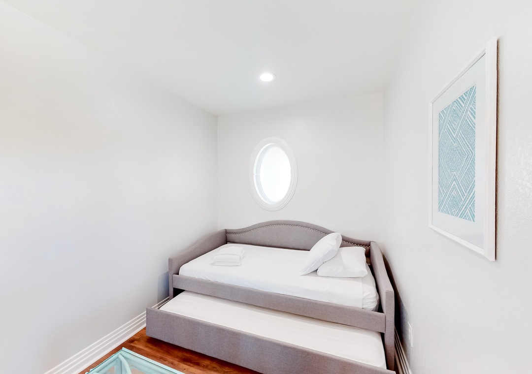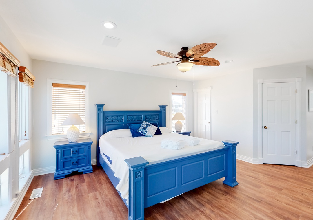 The ground level of this getaway will be the hub for entertaining, with the recreation room boasting a queen sofa bed, chair, and kitchenette with a refrigerator, sink, and microwave. A TV with a Blu-ray player and many books are provided for your enjoyment. A laundry room with a washer/dryer, laundry sink, and ironing board round out this level. Plus, sliding glass doors lead to the pool deck when you want a quick dip! The mid-level foyer includes an open office with a desk/fax machine for remote work and a sliding door to the deck.