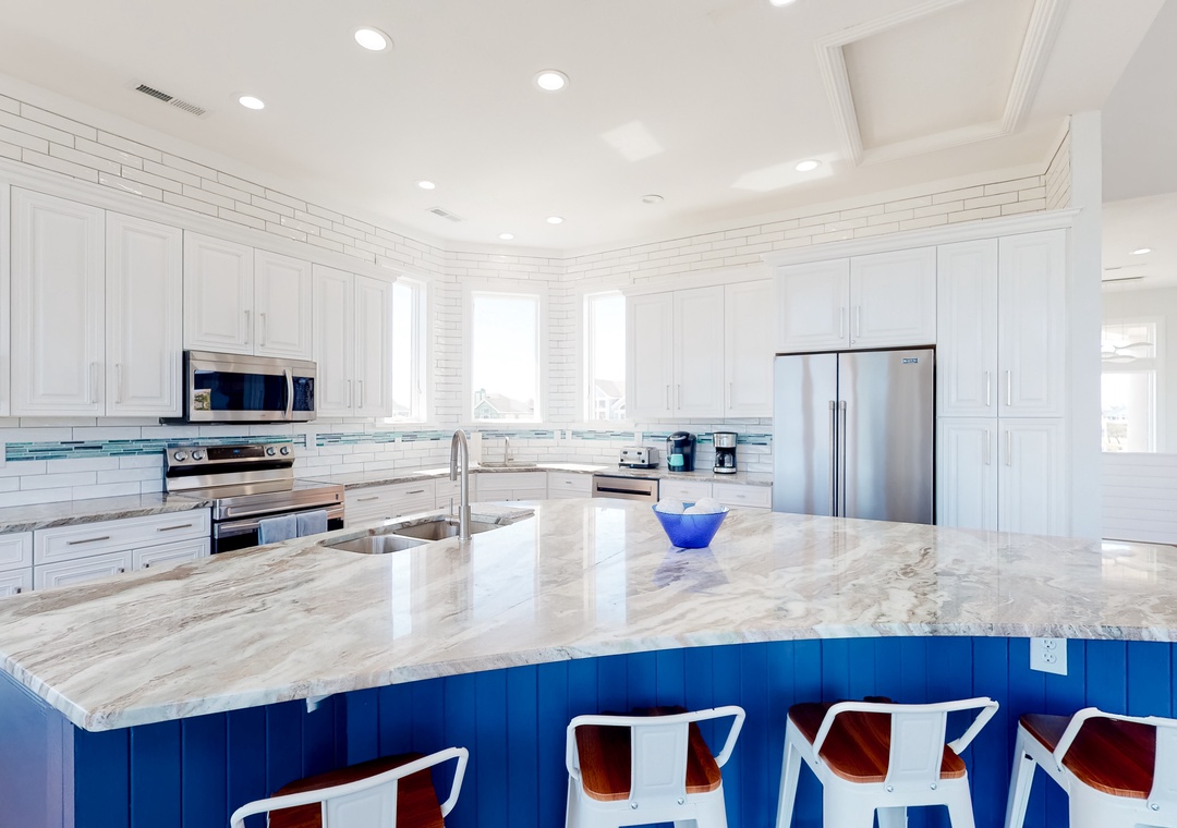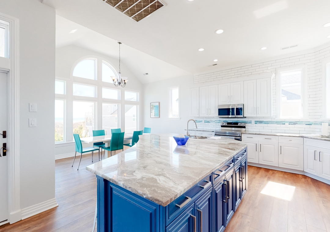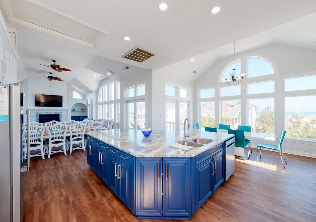 The upper level boasts a great room complete with a large, open floor plan showing vast windows with ocean views, hardwood floors, and custom faux painting. For entertaining, there's another TV, a stereo with surround sound, and a wet bar with a built-in wine cooler await to really spoil everyone. The sliding glass doors lead to the top-level deck, and the expansive, open kitchen boasts a large granite breakfast bar and dining table. Enjoy evening meals in the separate dining area with a large dining table and granite buffet. Don't forget to enjoy breathtaking sunsets on the deck each night with a favorite cocktail in hand!