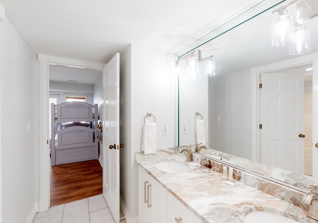 The bedrooms have TVs with Blu-ray players, and the primary suite features a small deck along with French doors that lead to the mid-level deck with stairs to the pool deck. Two bedrooms have en suite bathrooms with jetted tubs, and one includes a nursery with a rocker and Pack 'n Play.