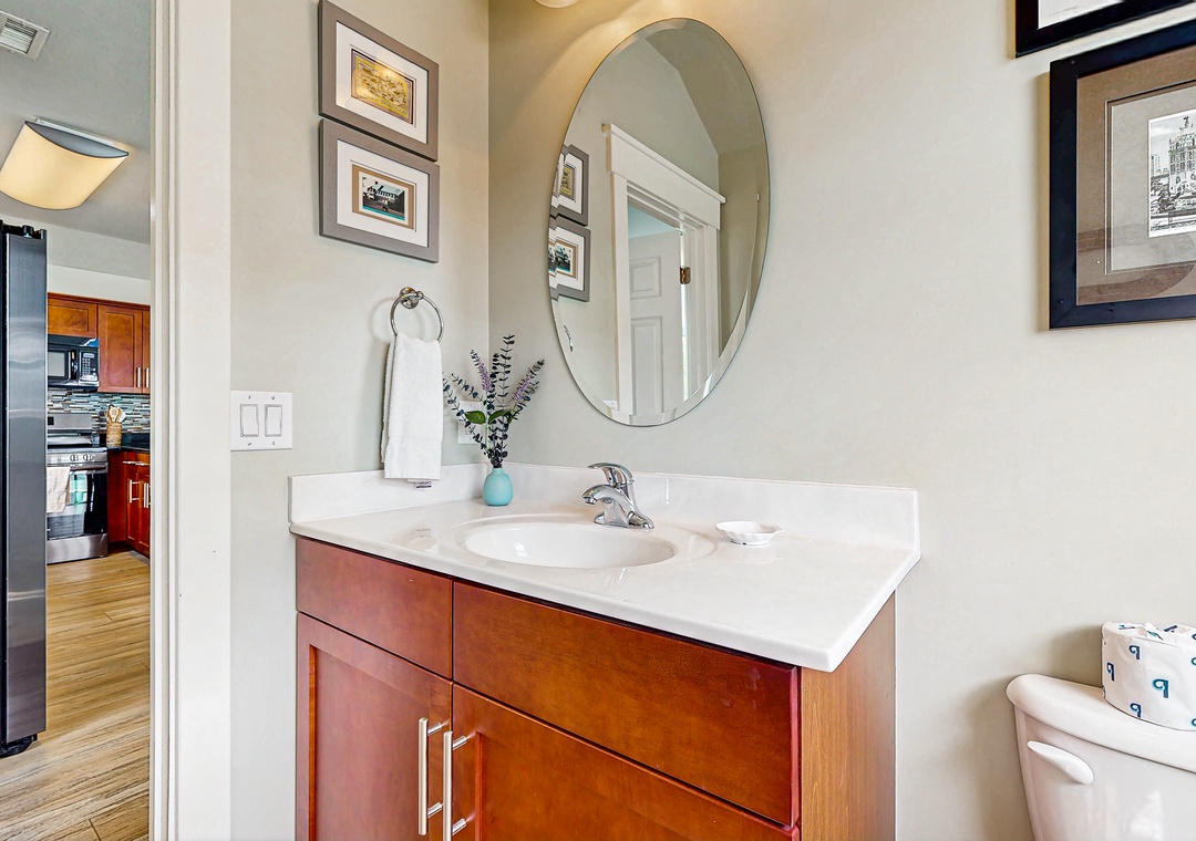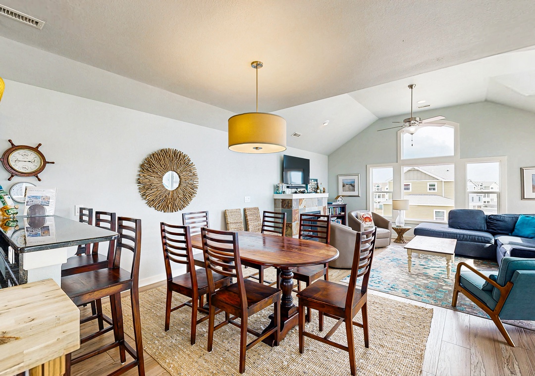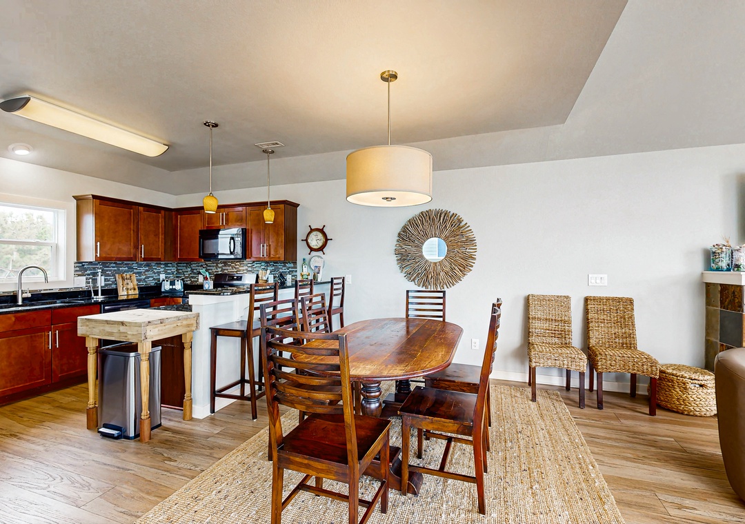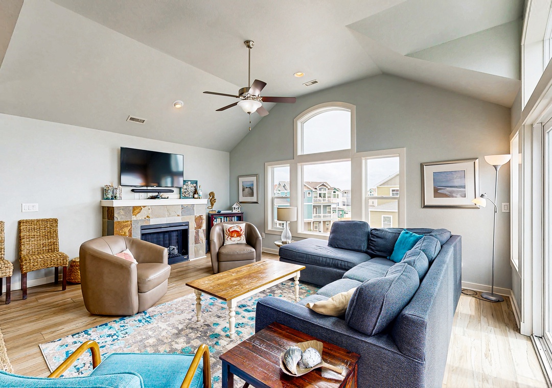 Top Level: The top level of this home is dedicated to living space - you will find a beautifully decorated great room with an electric fireplace, a 46” HDTV with a Blu-Ray player, surround sound, a sleep sofa, and deck access. There is also a well-appointed kitchen, dining area, and half bath rounding out this level.