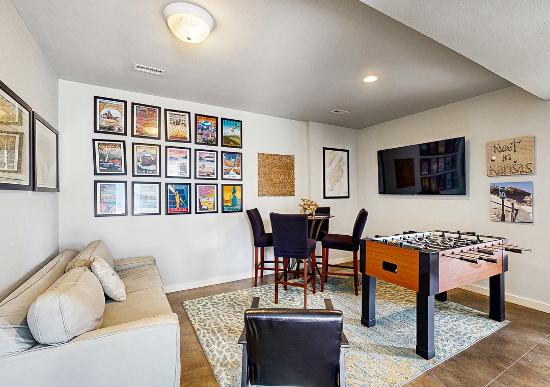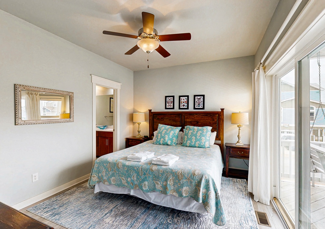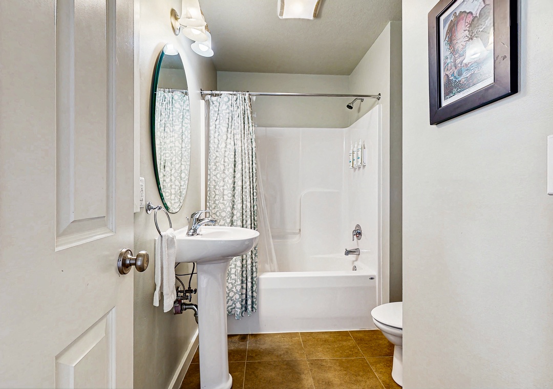 Ground Level: Enter into the rec room which provides a foosball table, 42” HDTV with DVD, and a bistro table and chairs. You'll also find a queen room with 26” flatscreen TV/DVD, a full bathroom, and access to the private courtyard with hot tub.