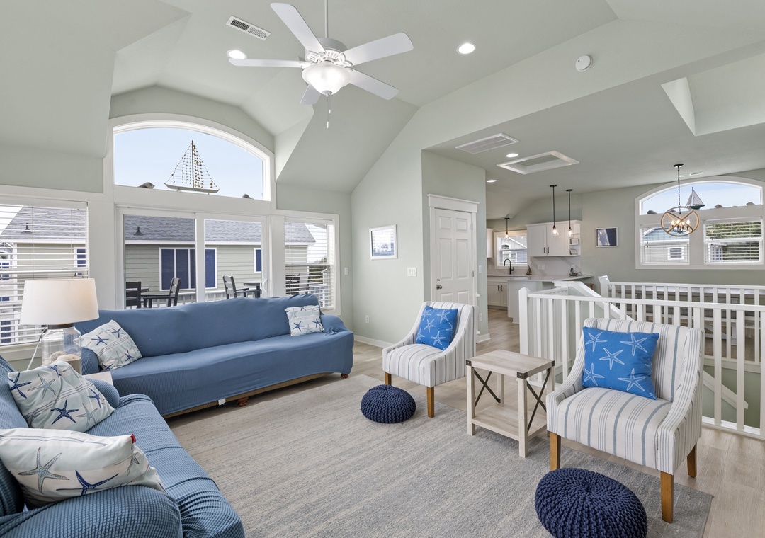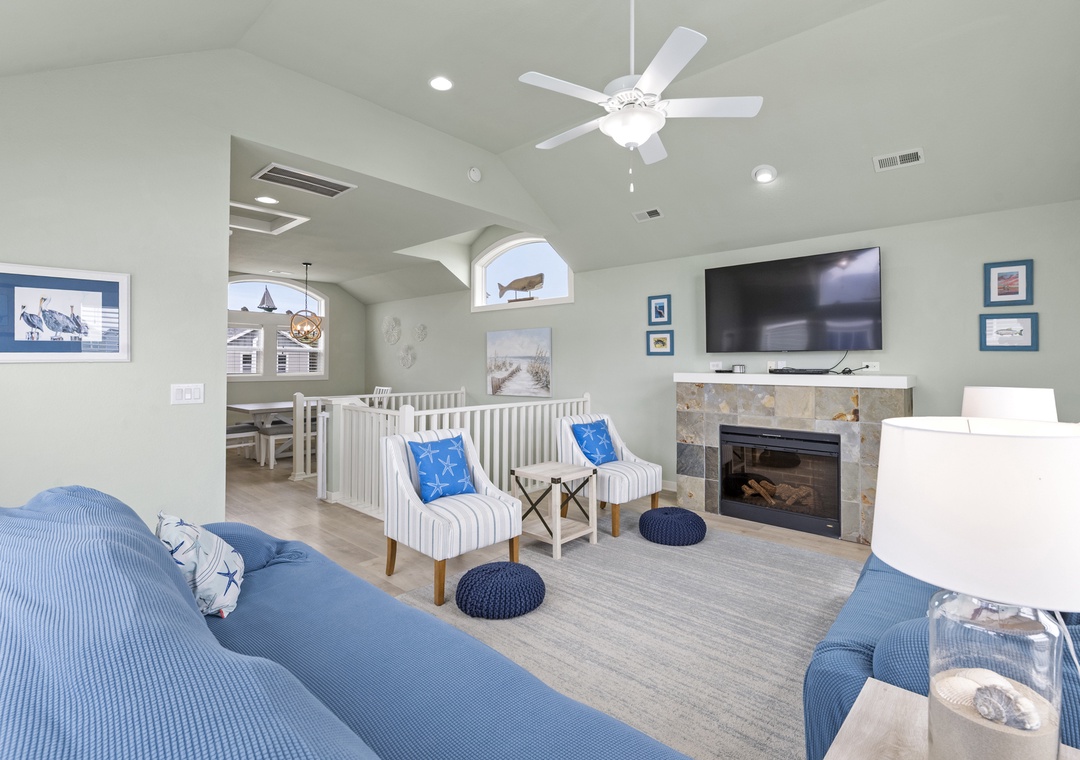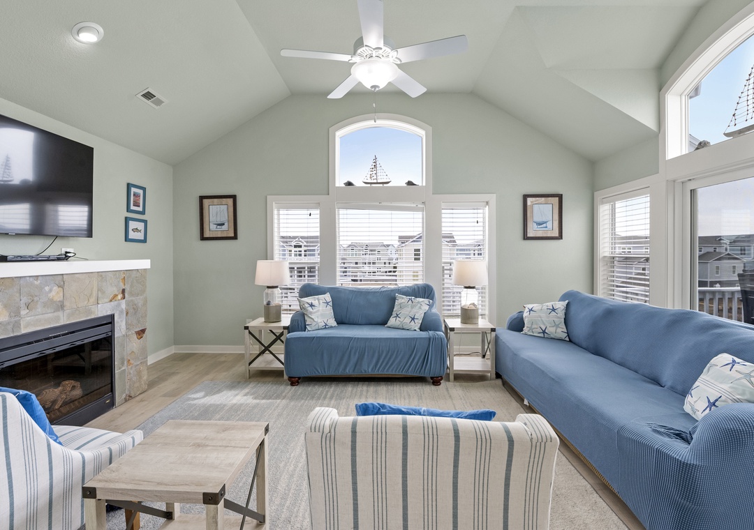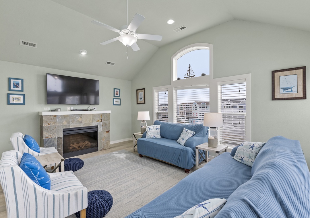The open-concept living and dining area is flooded with natural light and flows onto a private balcony — ideal for morning coffee or sunset cocktails with the coastal breeze. A gas fireplace sets the mood for relaxed evenings, and the living room TV makes movie nights easy after a full beach day.