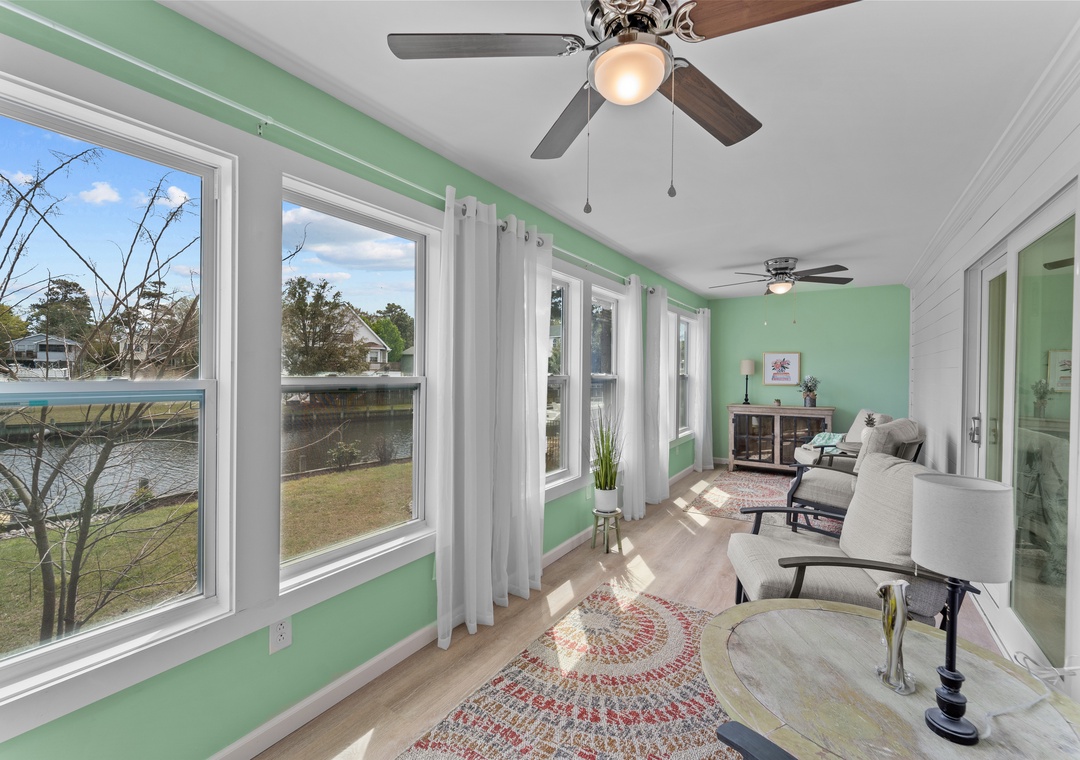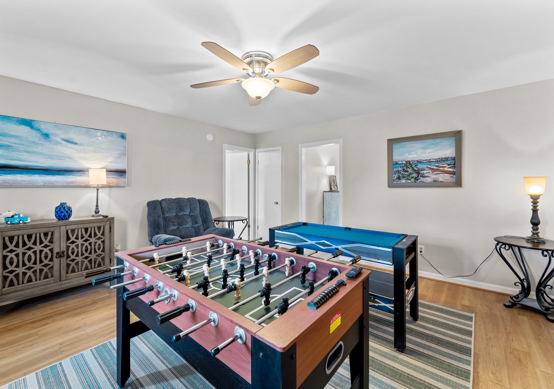 From the beds to the decor, the spacious, two-story interior has been completely renovated for modern guest comfort. Stainless steel full kitchens can be found on each floor for ultimate family-style meal planning and flexibility for groups. Family fun and friendly competition await in the downstairs game room complete with foosball, billiards, Ping-Pong, and a smart TV. Upstairs, plush seating and a smart TV are ready for home movie nights. The gorgeous lower-level sunroom boasts breathtaking views of the canal. Each bedroom includes its own smart TV for added convenience. Two downstairs bonus rooms are furnished as additional sleeping options. Home essentials include central air-conditioning, free WiFi, and a private washer/dryer.