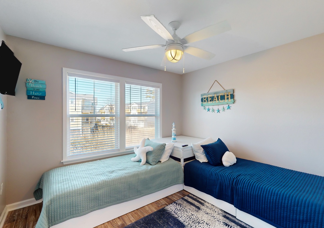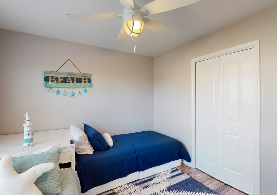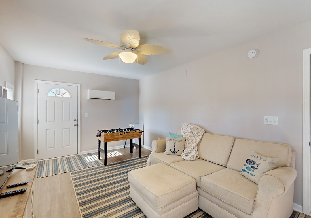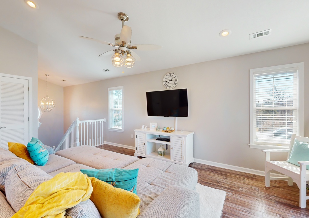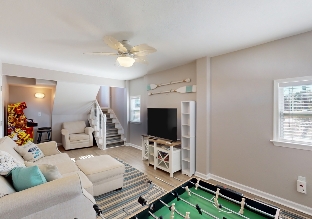 As you enter this coastal charmer, you will be greeted by an entertaining game room offering a foosball table, two different standalone arcade games, and a cozy rec area with a Roku smart TV to stream your favorite series, shows, and sports games. This is a wonderful spot to gather and create everlasting memories with your family and friends! The second floor houses three coastal-themed bedrooms. One of the bedrooms is a primary suite with a smart TV, a working desk, an en suite bathroom, and a private deck with a swing. The second guest bedroom also boasts a smart TV, a working desk, and a private deck with seating.