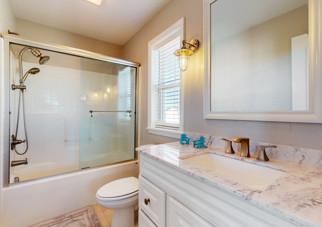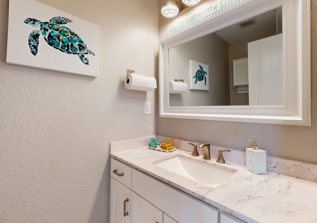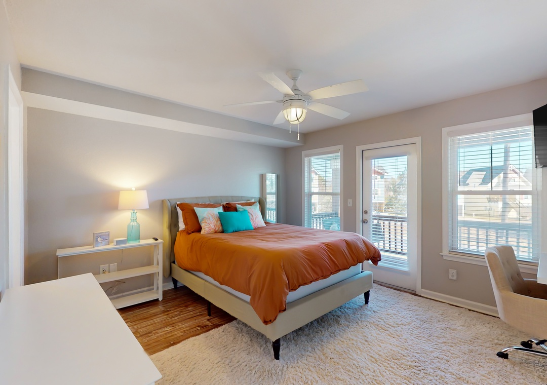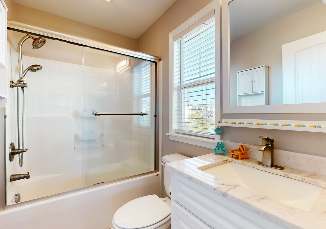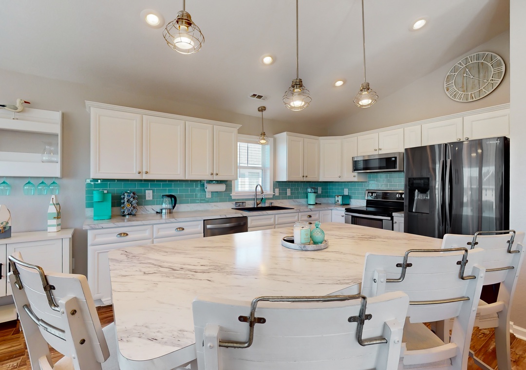 As you enter this coastal charmer, you will be greeted by an entertaining game room offering a foosball table, two different standalone arcade games, and a cozy rec area with a Roku smart TV to stream your favorite series, shows, and sports games. This is a wonderful spot to gather and create everlasting memories with your family and friends! The second floor houses three coastal-themed bedrooms. One of the bedrooms is a primary suite with a smart TV, a working desk, an en suite bathroom, and a private deck with a swing. The second guest bedroom also boasts a smart TV, a working desk, and a private deck with seating.