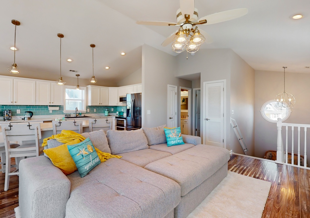 The main living space is located on the upper level offering a spacious and bright open floor plan that seamlessly combines all living spaces into one. Make yourself at home and spread out comfortably in the welcoming living room featuring an extensive sofa and a Roku smart TV. The living room opens onto the third deck, which boasts a nice lounge area surrounding a gas firepit. One amenity that makes this home stand out is the record player - the owners have provided a few vinyls to enjoy during your stay! When mealtime comes, channel your inner chef and prepare exquisite homemade meals in the modern open kitchen. The kitchen has been appointed with all the essentials to prepare tasty treats for the crew, including a double oven and a Keurig coffee maker. This level also features a second main bedroom with a smart TV and an en suite bathroom. Additional perks include a washer/dryer, booster seats, baby sleepers, and children's games and toys.