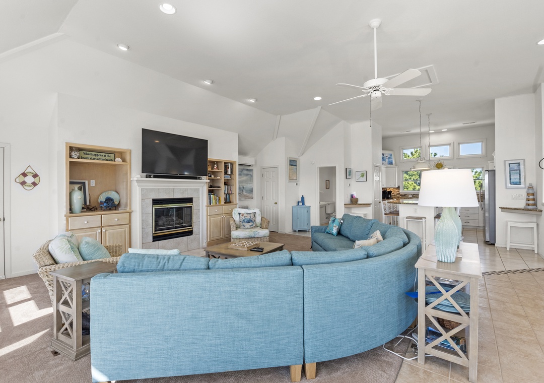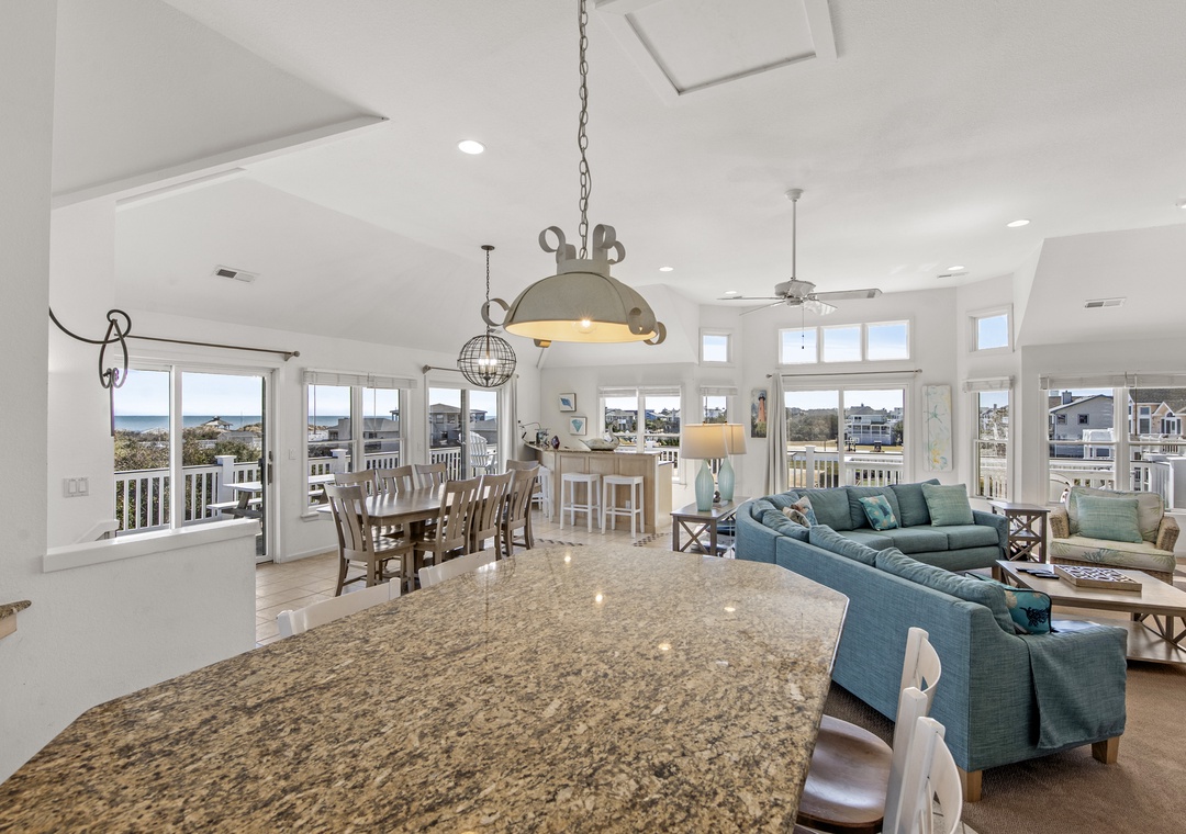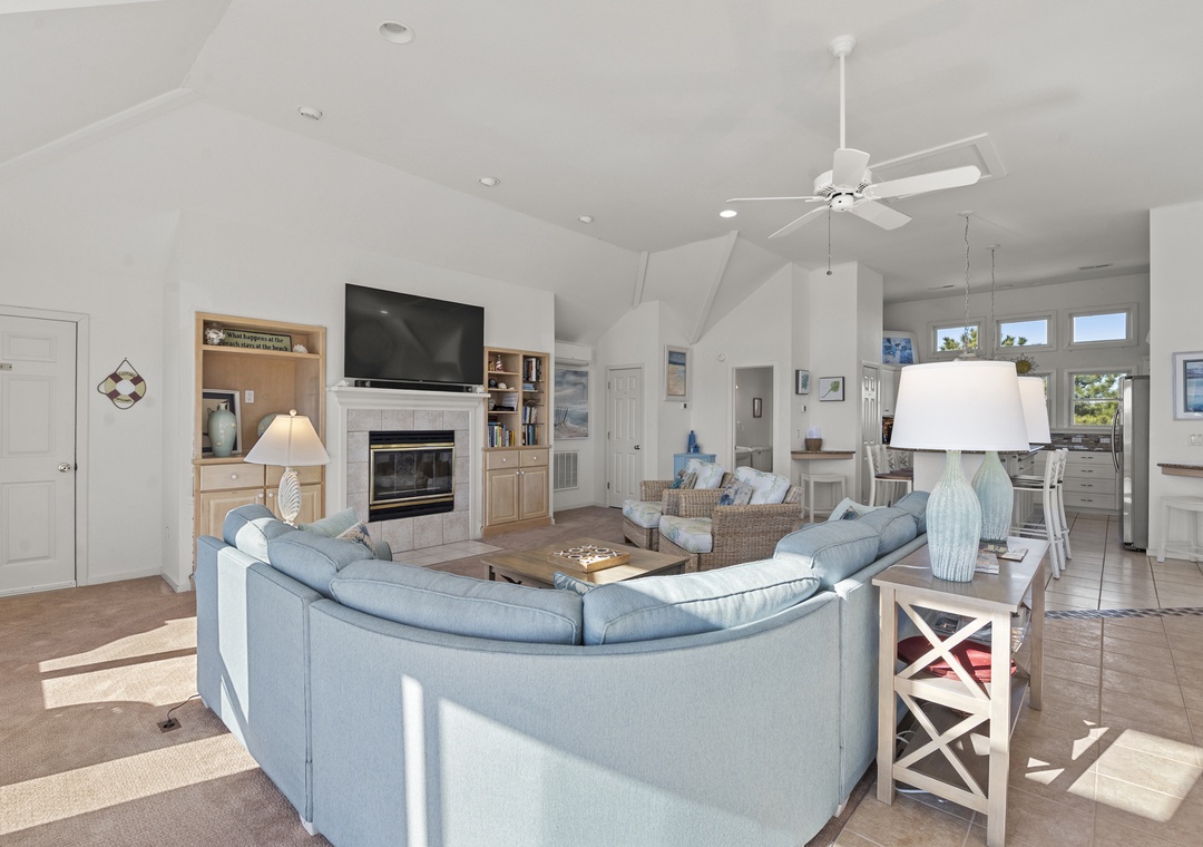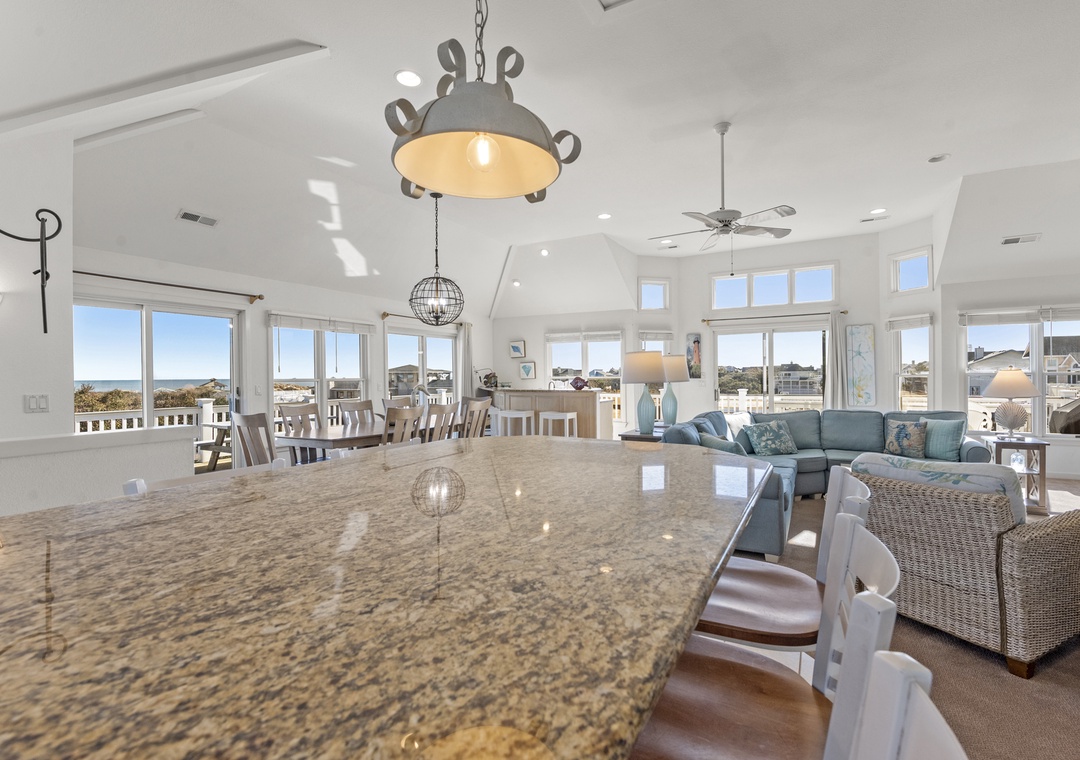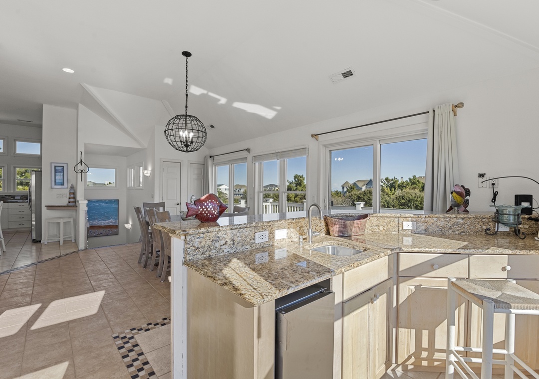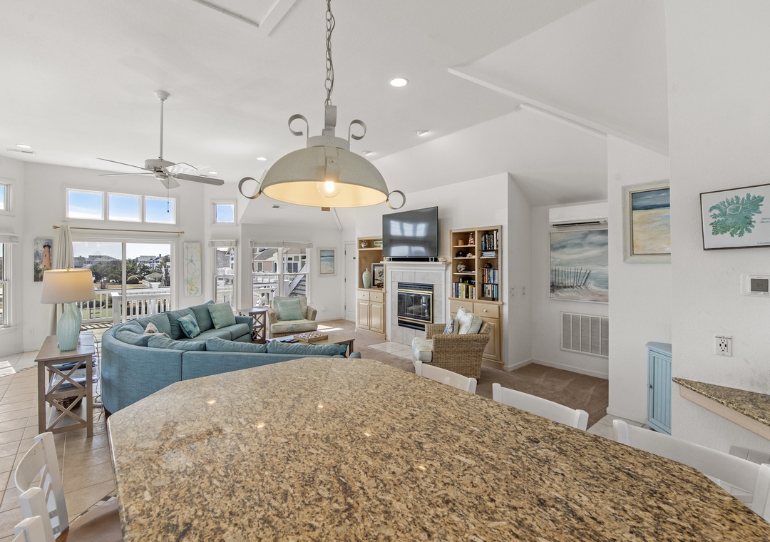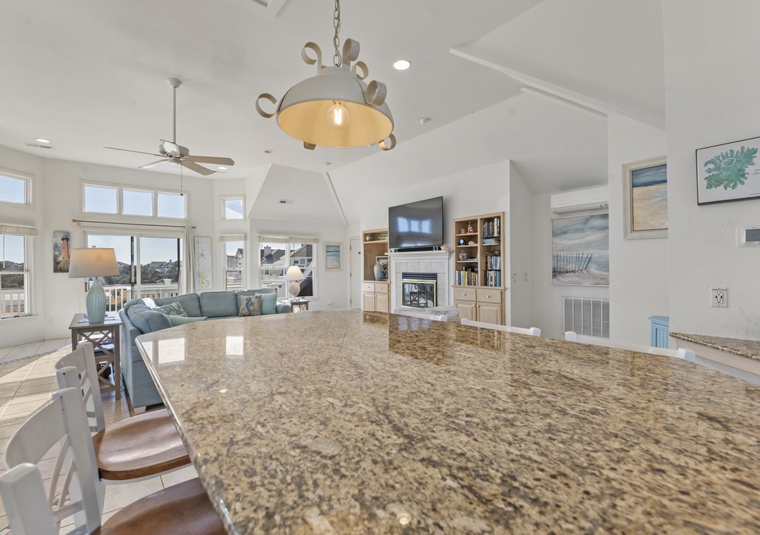 Top Level: Very accommodating great room, bright and airy, with a large wet bar, gas fireplace, new 65“ smart TV, mini fridge under island counter and a well-equipped kitchen. Your eyes will be riveted to the fantastic views of the ocean.