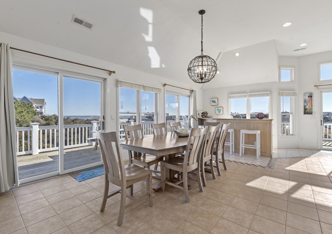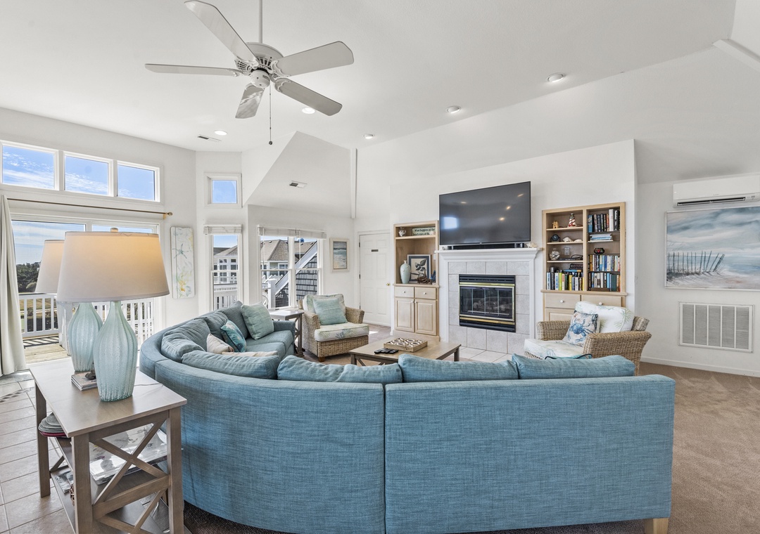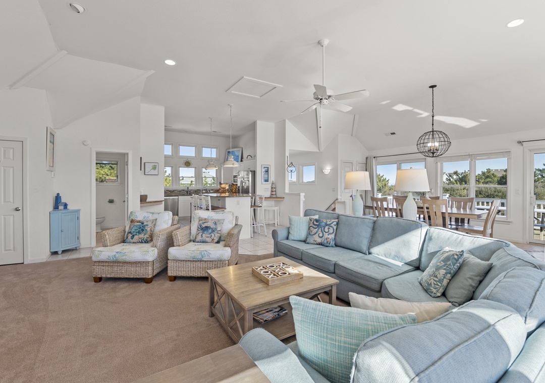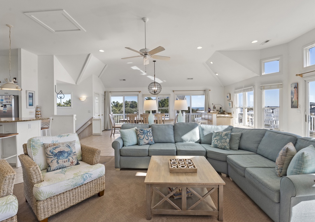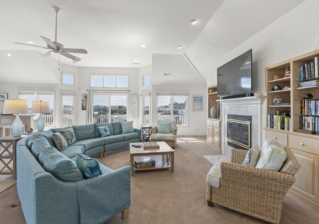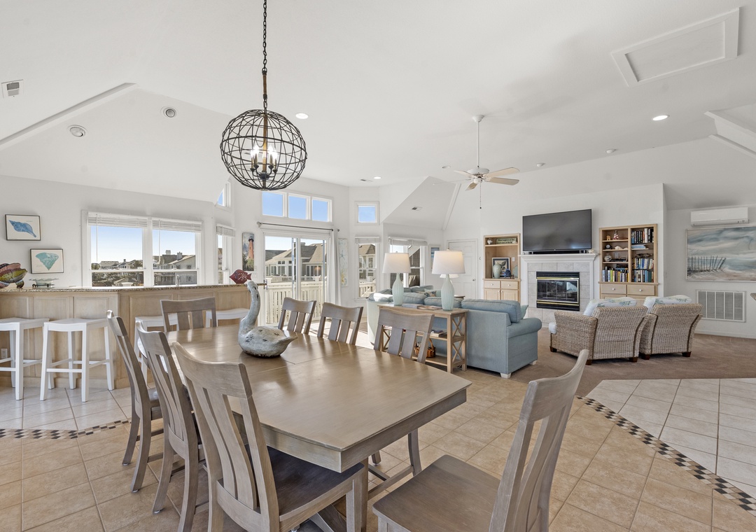 Top Level: Very accommodating great room, bright and airy, with a large wet bar, gas fireplace, new 65“ smart TV, mini fridge under island counter and a well-equipped kitchen. Your eyes will be riveted to the fantastic views of the ocean.