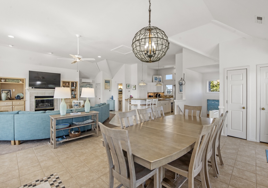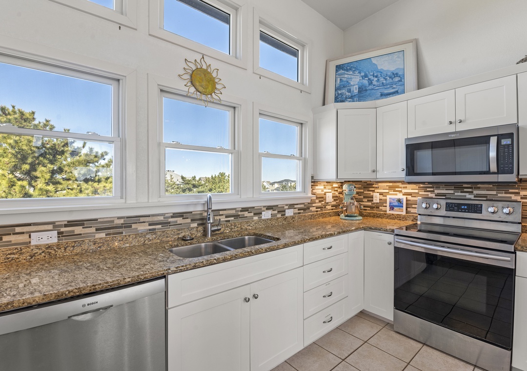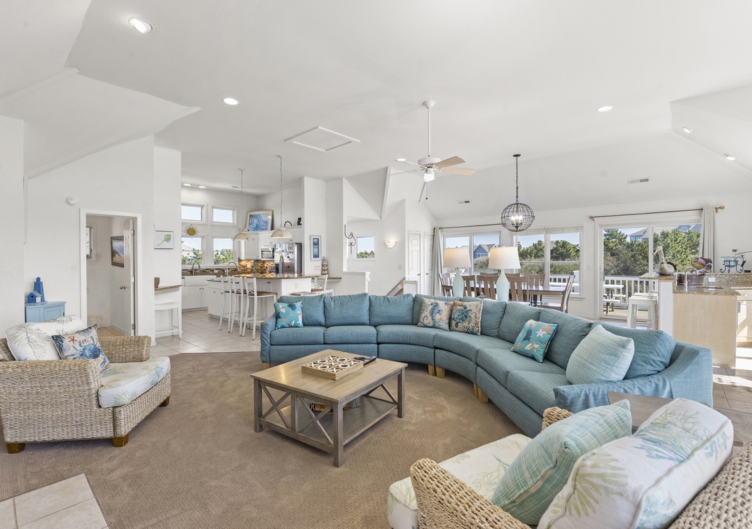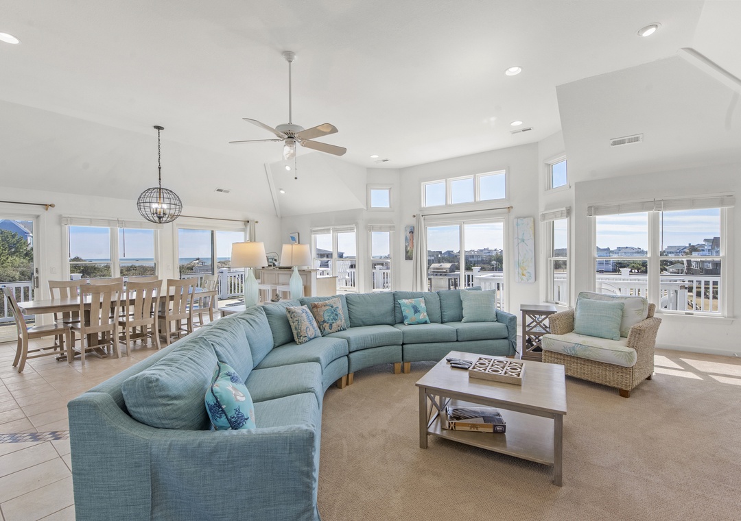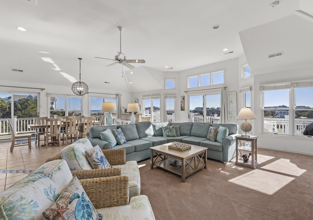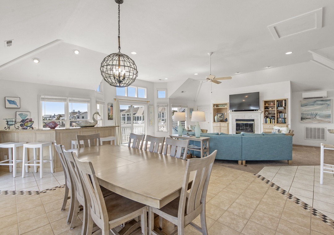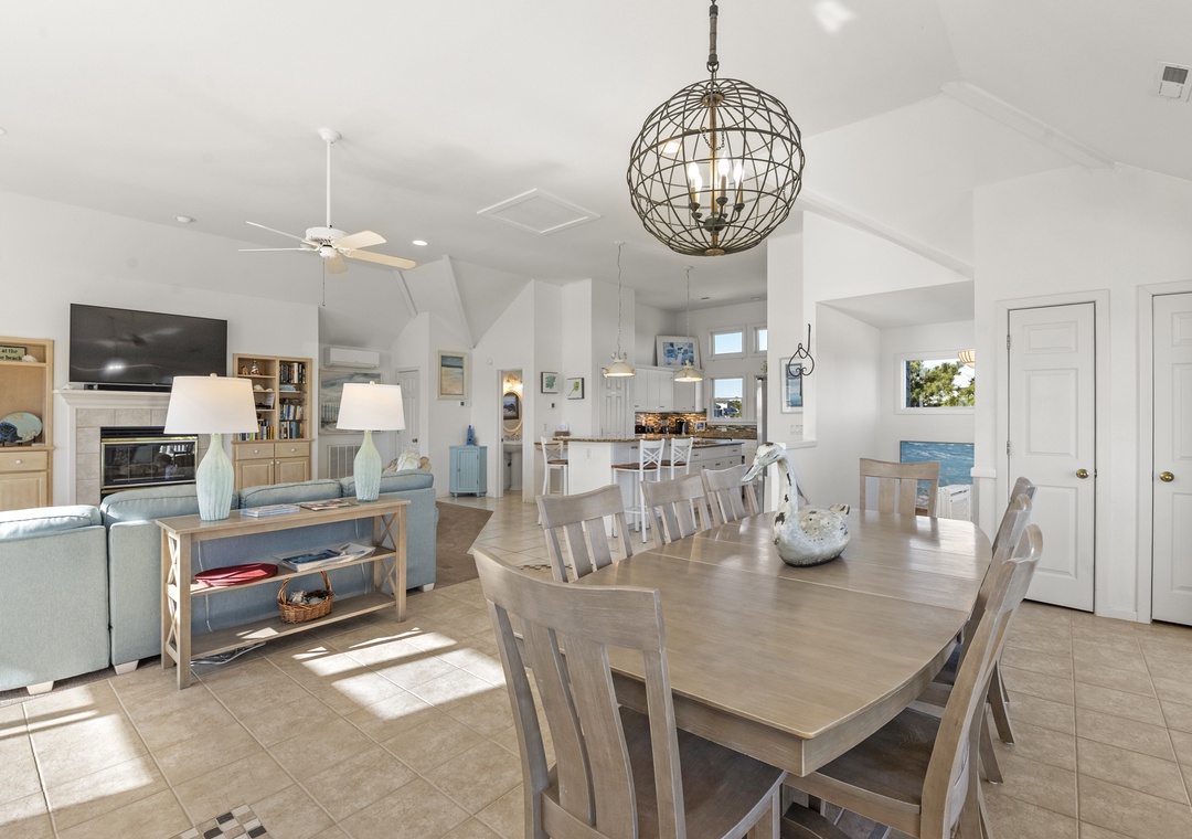 Top Level: Very accommodating great room, bright and airy, with a large wet bar, gas fireplace, new 65“ smart TV, mini fridge under island counter and a well-equipped kitchen. Your eyes will be riveted to the fantastic views of the ocean.