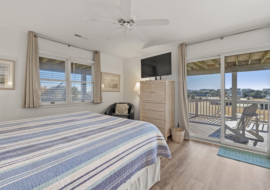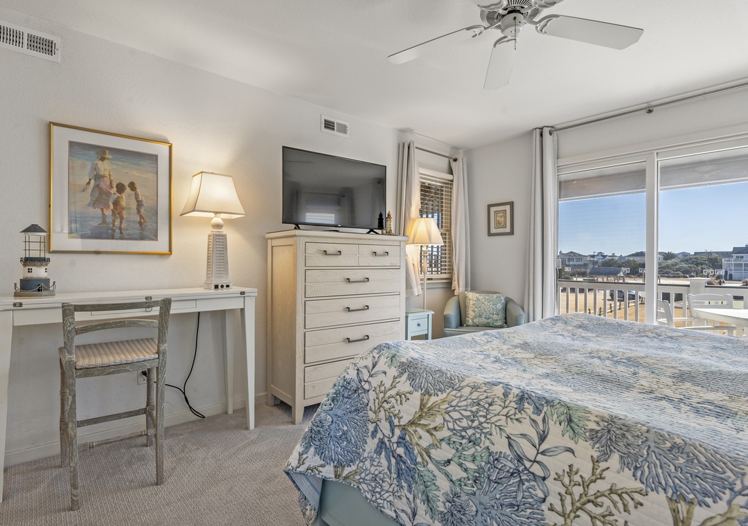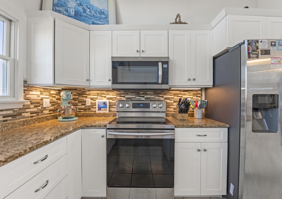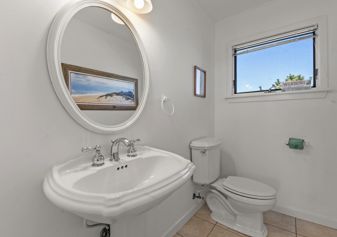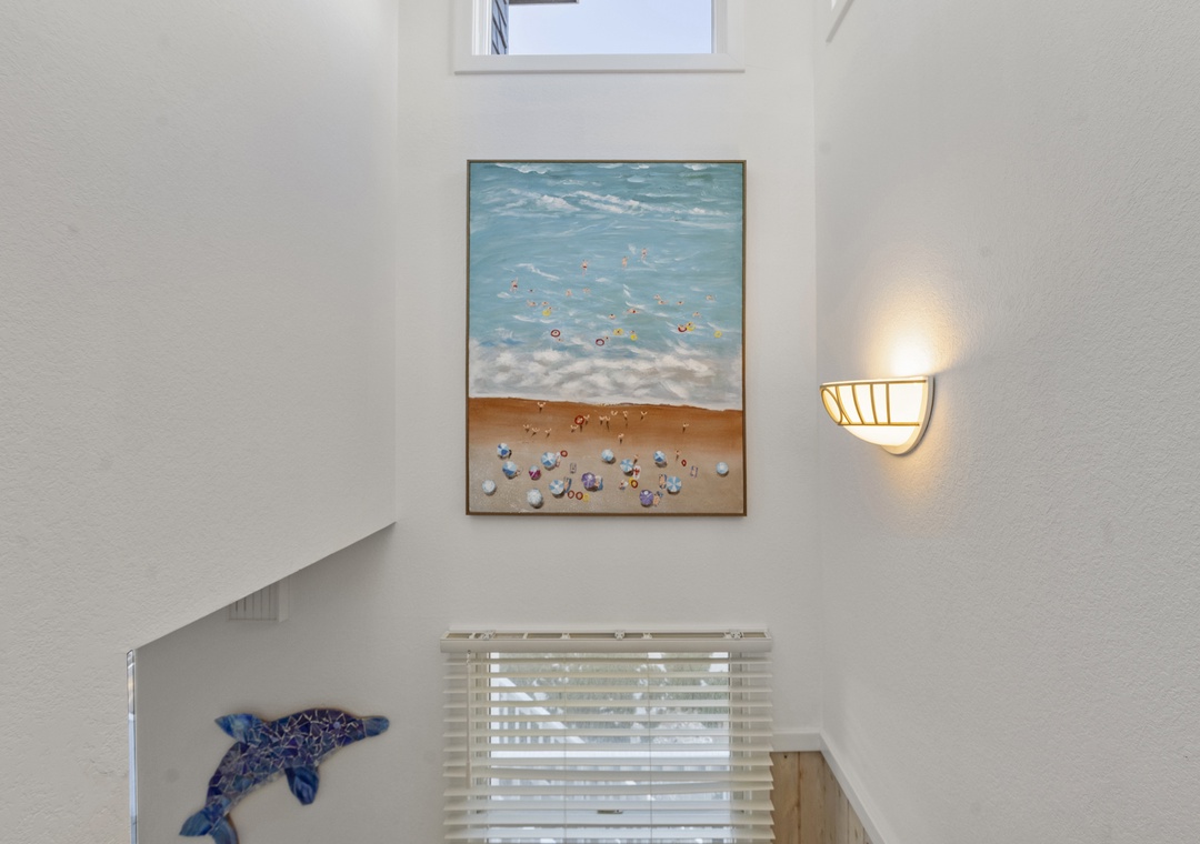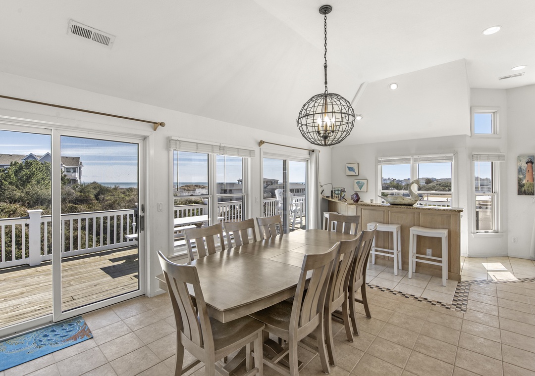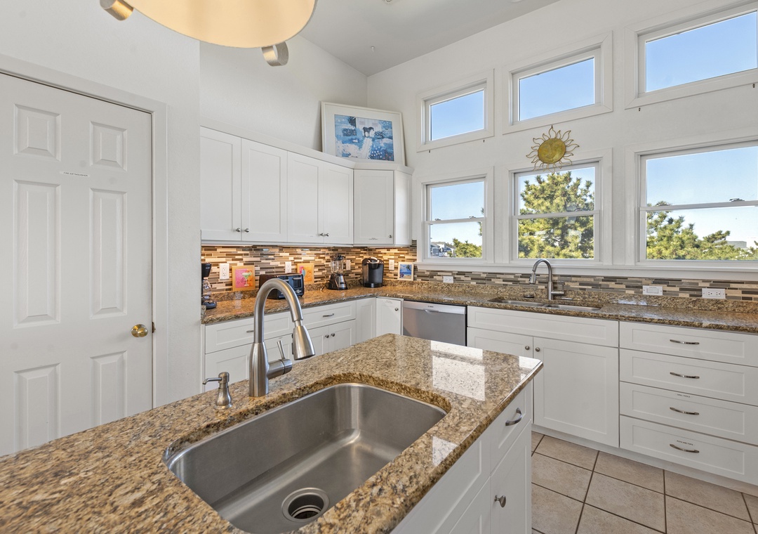 Top Level: Very accommodating great room, bright and airy, with a large wet bar, gas fireplace, new 65“ smart TV, mini fridge under island counter and a well-equipped kitchen. Your eyes will be riveted to the fantastic views of the ocean.