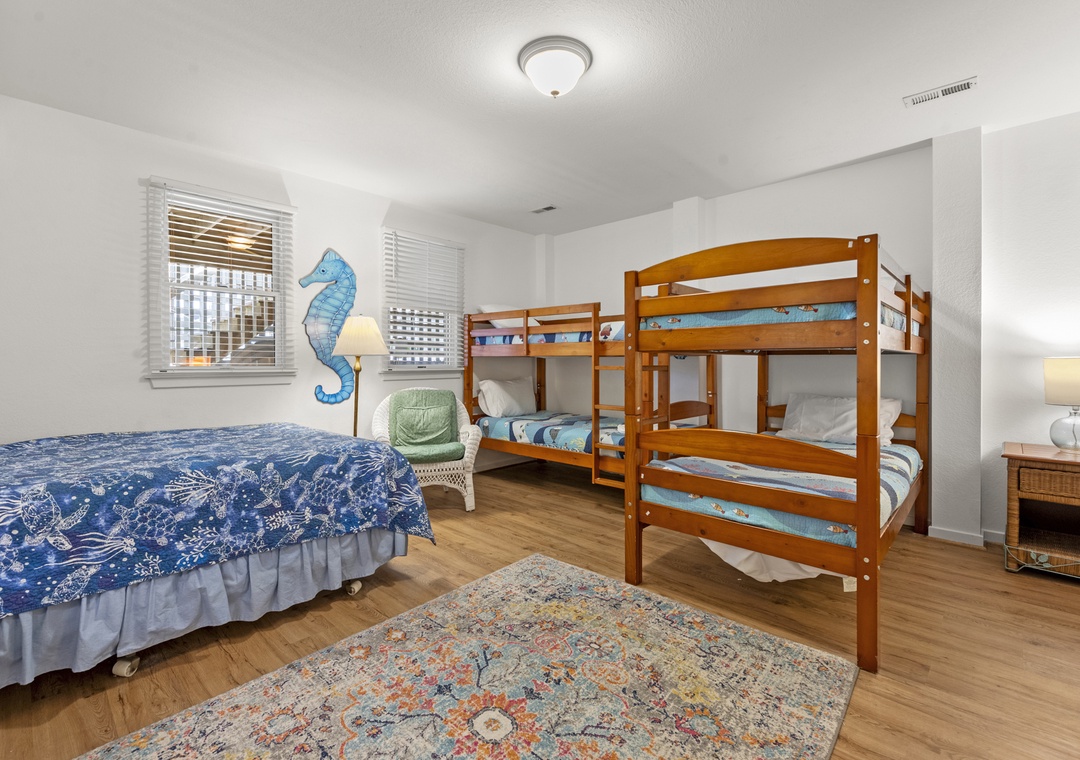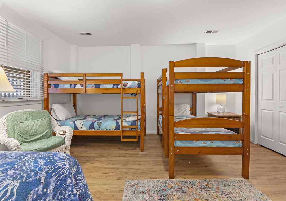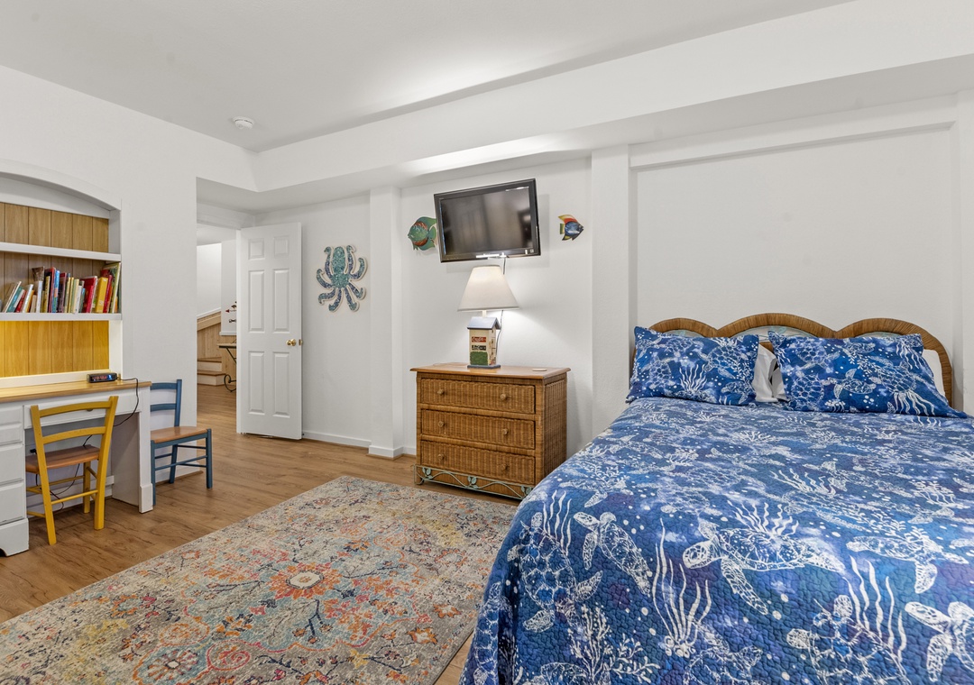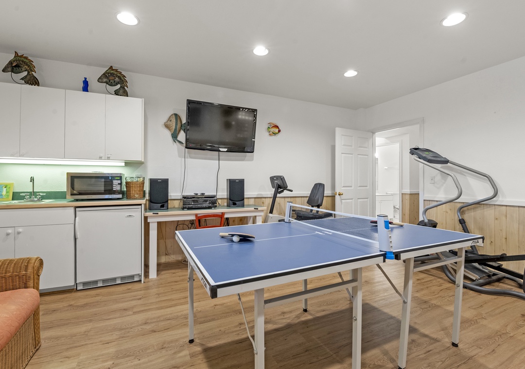 Ground Level: Features a den with wet bar, elliptical, recumbent bike, full-size fridge, and smart TV. Oversize bedroom with two bunk sets and queen, children’s library, a full bath and laundry area.