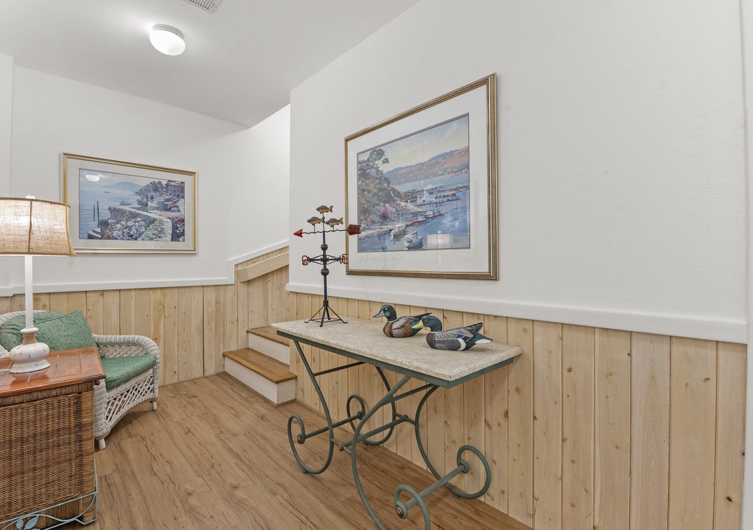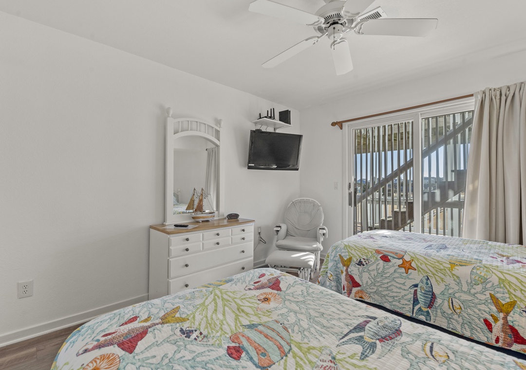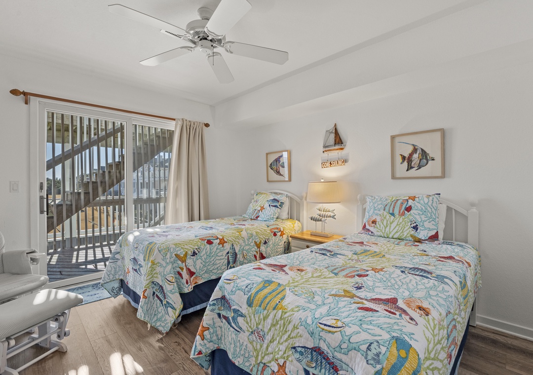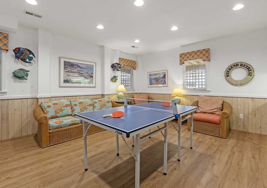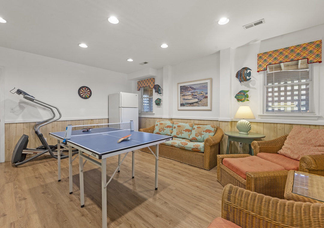 Ground Level: Features a den with wet bar, elliptical, recumbent bike, full-size fridge, and smart TV. Oversize bedroom with two bunk sets and queen, children’s library, a full bath and laundry area.