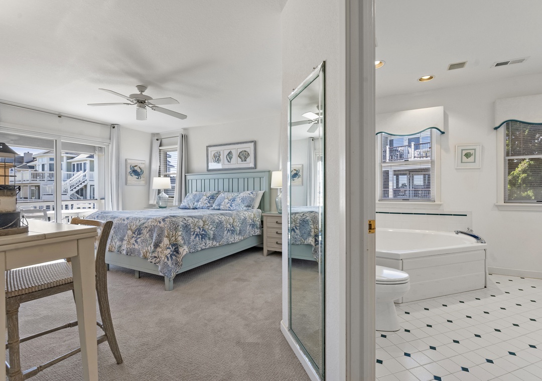 Mid Level: Features two main bedrooms with whirlpools and new smart TVs, a semi-private main bedroom with a king bed and a new smart TV, a bedroom with two twins and a smart TV, and a full bath.