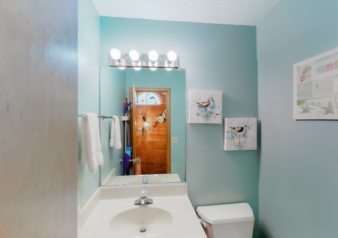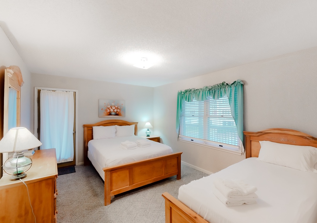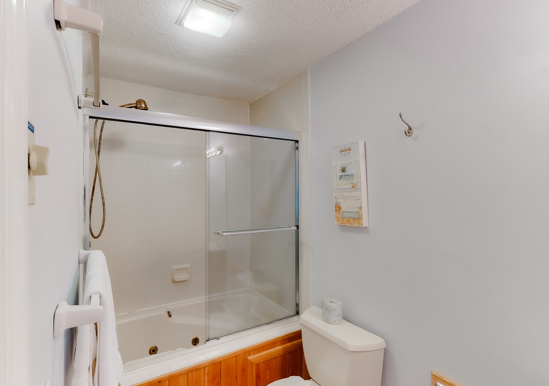 Mid Level: Wrap around decking and main entrance Foyer, Queen BR with Twin with horizon ocean views and deck access shares Hall Bath (tub shower) with Bedroom with 2 bunk sets and deck access, Queen primary bedroom with shower stall and separate jetted tub, horizon ocean views and deck access to screened porch and hot tub, King primary bedroom with tub shower and jetted tub and deck access to hot tub deck and screen porch.