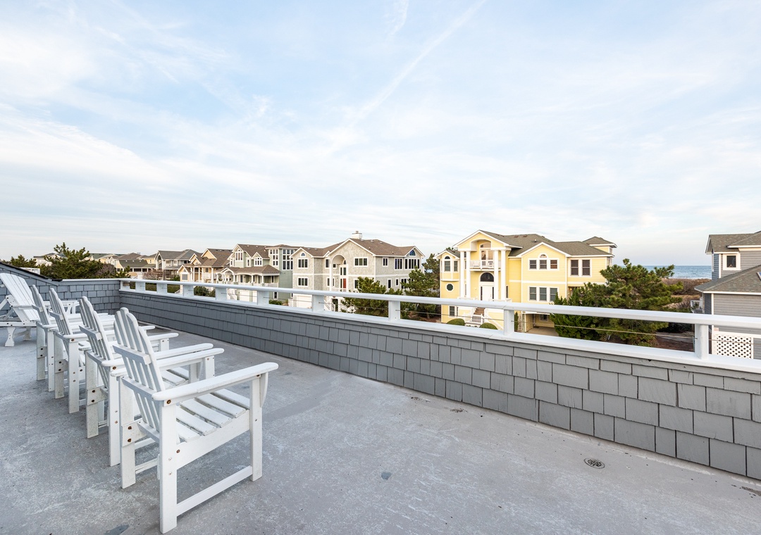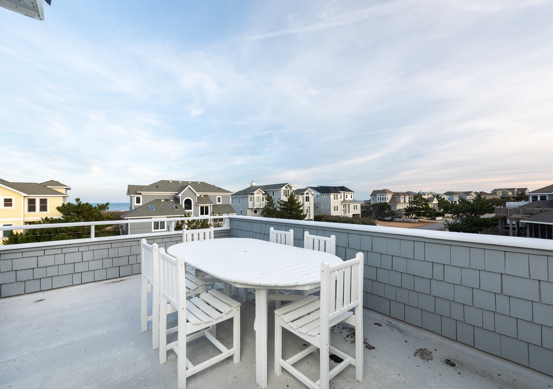 Top Level: Fiberglass ocean-side decking with polywood chairs and loungers, Ocean-side Large Dining table with seating for 14 and ocean views, Powder Room, Great room with TV. Stereo and ocean views, large kitchen and access to upper level Shipswatch with comfy seating